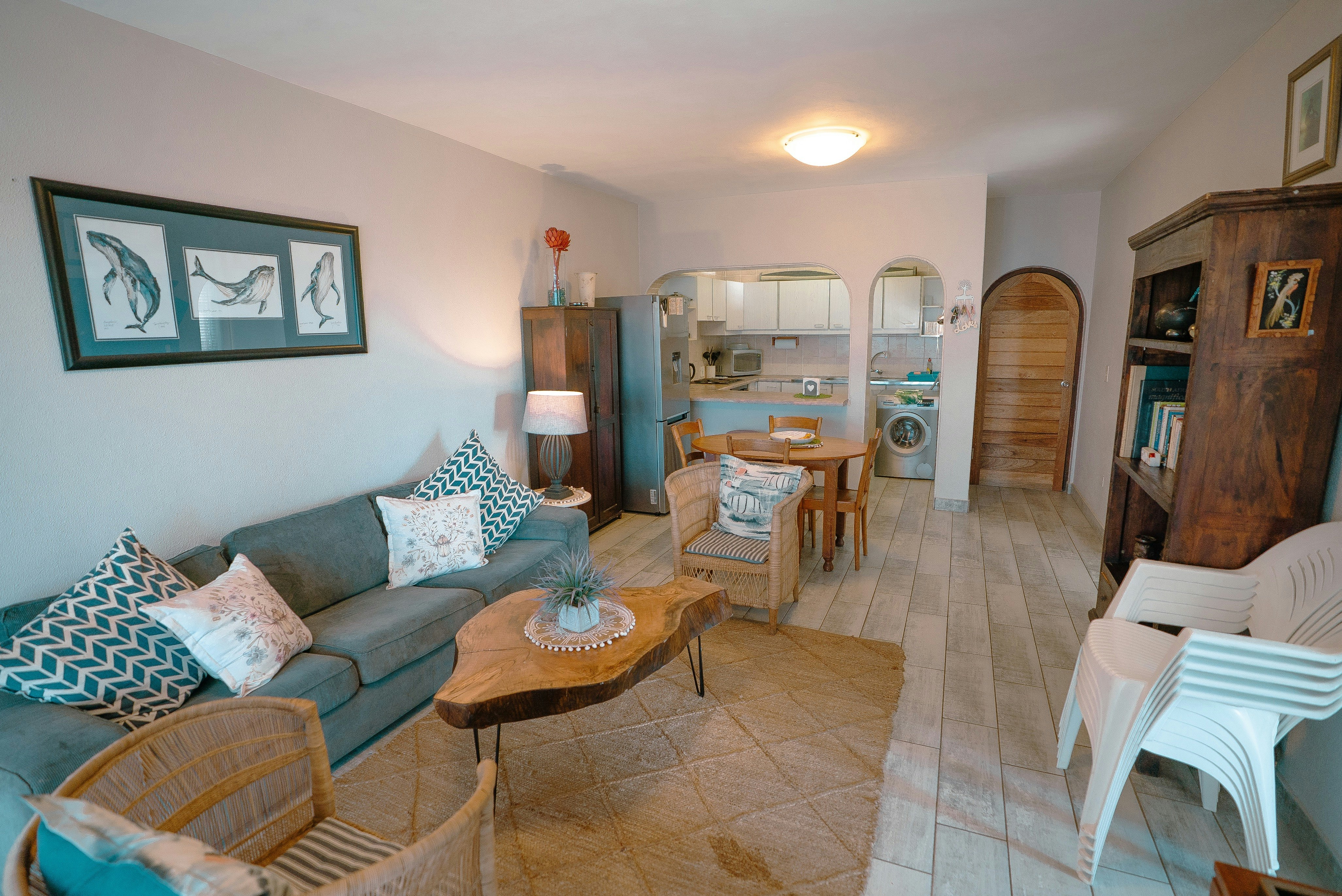 The open-plan living area includes a kitchen fully equipped with a stove, oven, microwave, fridge-freezer, cutlery, and crockery, along with a breakfast bar with stools. A washing machine is also available. Adjacent to the kitchen is a 4-seater dining table and a lounge with comfortable seating and a TV. Sliding doors open onto a furnished balcony where guests can enjoy meals alfresco, complete with a braai stand.