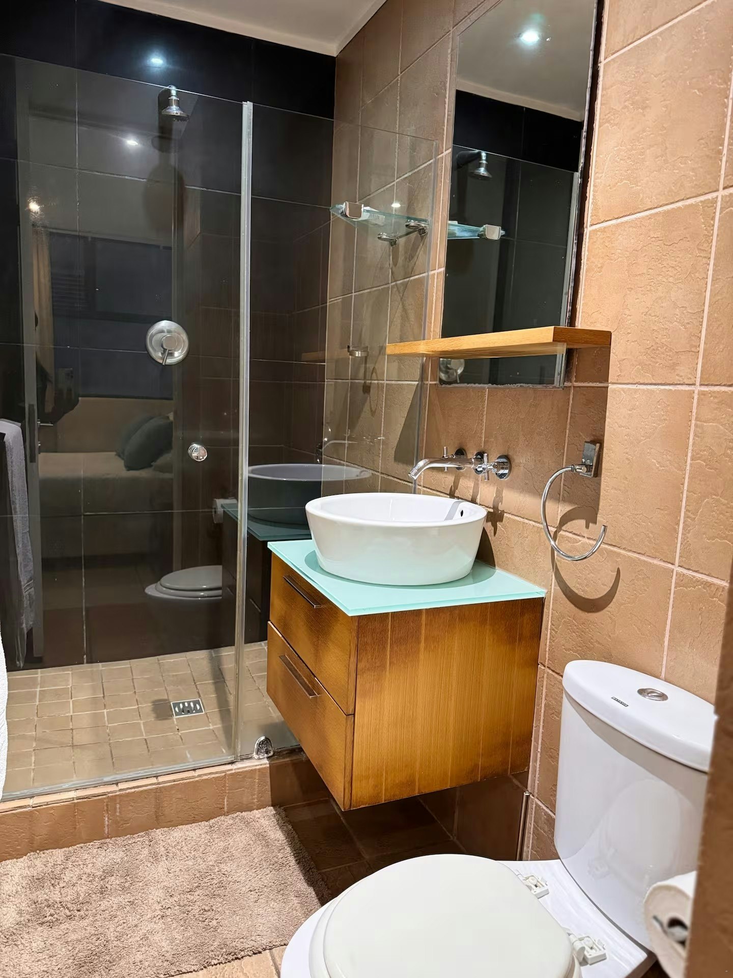 The bedroom is furnished with a double bed and offers an en-suite bathroom fitted with a shower, toilet, and basin.