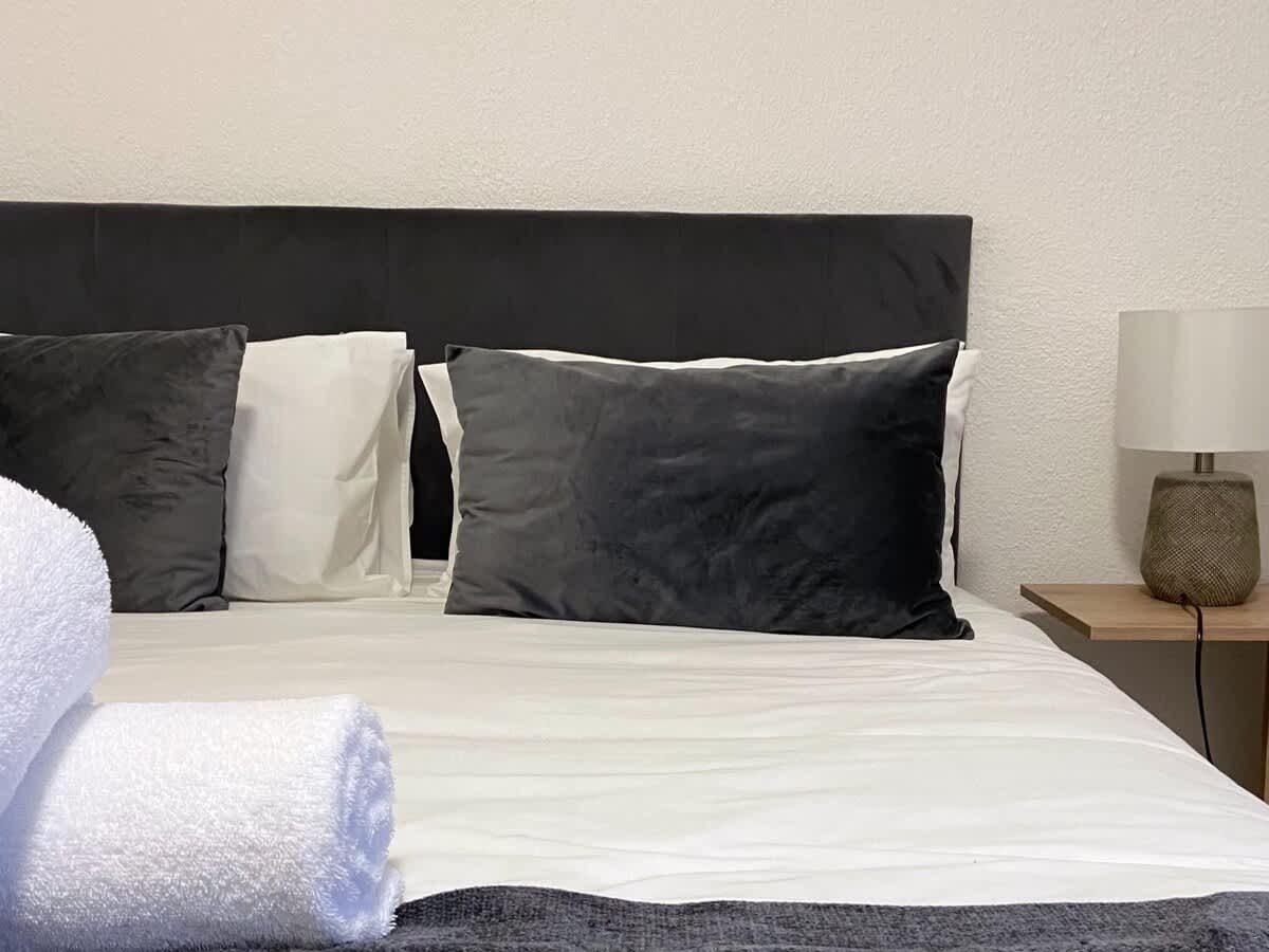 The unit can accommodate 4 guests in 2 bedrooms, each furnished with a double bed. The bathroom is fitted with a shower, toilet, and basin.
