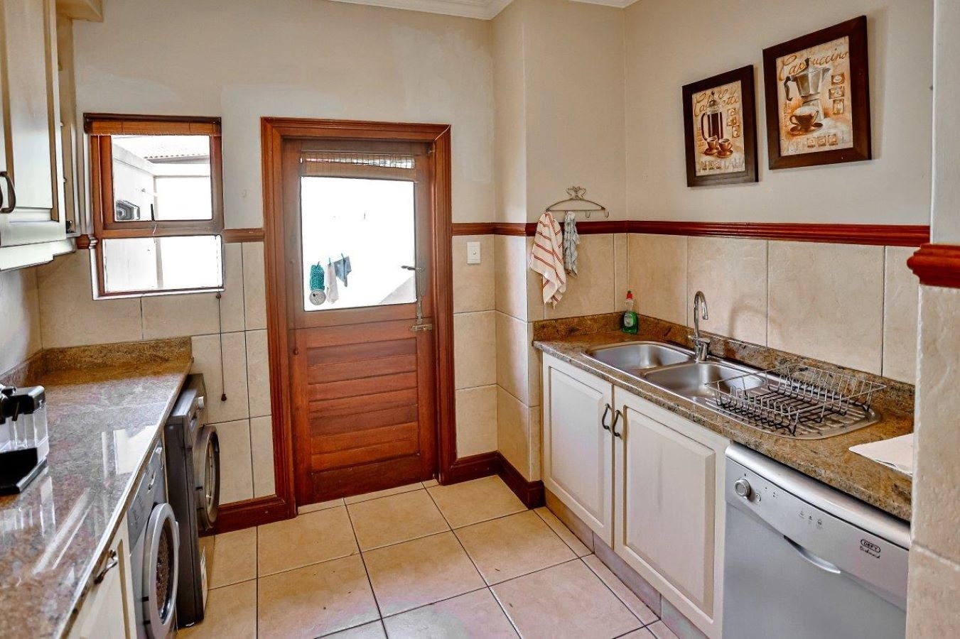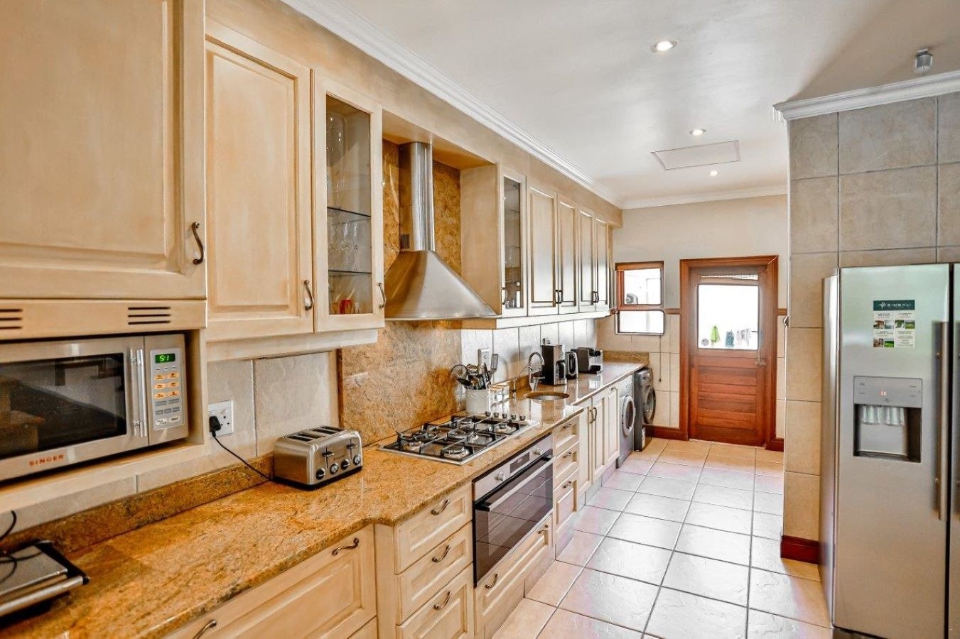 The kitchen is open-plan to the living area and is fully equipped with a fridge-freezer, microwave oven, gas stove, dishwasher, washing machine, tumble dryer, cutlery, crockery, and tea- and coffee-making facilities. The living area includes a breakfast bar, a dining table, a TV with DStv, and comfortable couches.