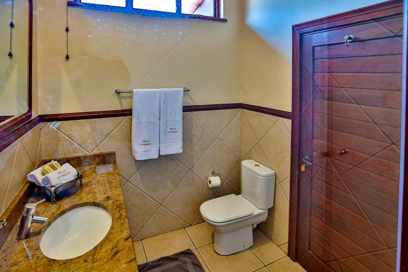 The house consists of 3 bedrooms and 3 bathrooms, which can comfortably accommodate up to 6 guests. The main bedroom is furnished with a king-size bed and features an en-suite bathroom fitted with bath and shower facilities. The second and third bedrooms are each furnished with a queen-size bed. The second and third bathrooms are each fitted with a toilet, washbasin, and either a shower fixed over the bath or a shower only.