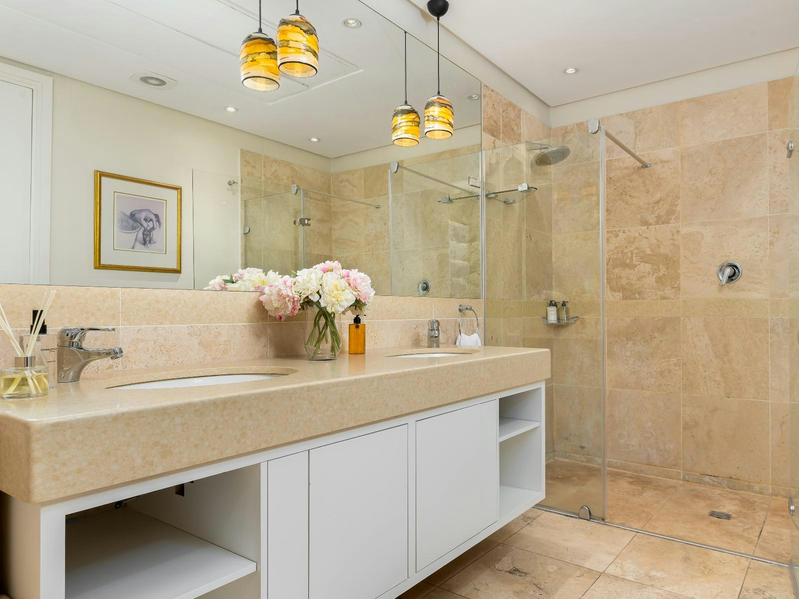 Die eerste slaapkamer het 'n koninggrootte-bed en 'n en suite-badkamer met 'n bad, instapstort, dubbelwasbak en 'n bidet. Die tweede slaapkamer het 'n koningingrootte-bed en 'n en suite-badkamer met 'n stort, toilet en 'n wasbak. Die derde slaapkamer het 2 enkelbeddens en 'n en suite-badkamer met 'n stort. Al 3 slaapkamers het skuifdeure wat na die stoep lei.