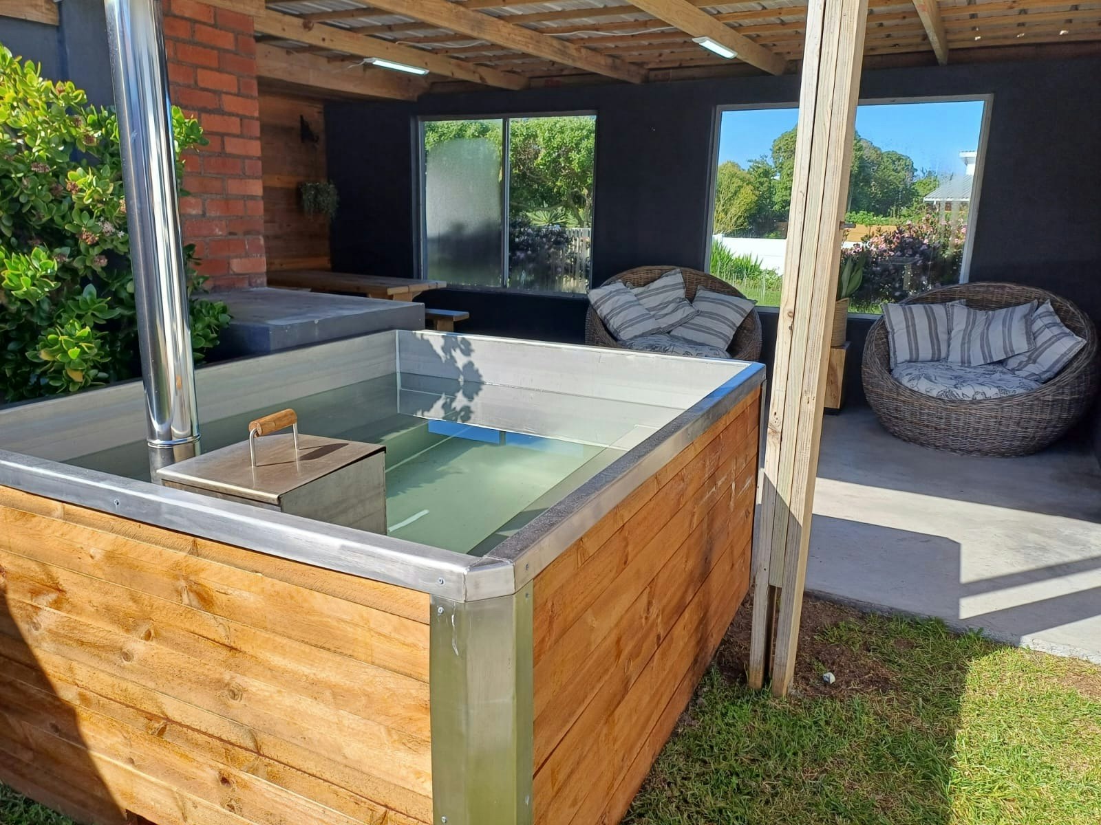 Die oopplan-leefarea beskik oor 'n leefarea, eetkamer en kombuis. Die leefarea is ingerig met 'n gemaklike rusbank, 'n slim-TV met stromingsdienste en 'n groot eetkamertafel. Die kombuis is toegerus met 'n yskas-vrieskas, gasstoof, oond, mikrogolfoond, eetgerei en breekware. Buite kan gaste 'n onderdak-patio vind wat ingerig is met buitemeubels, 'n ingeboude braai en 'n houtvuur-warmbad. Toegang tot gratis WiFi is ook beskikbaar.