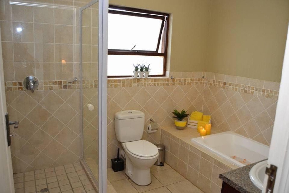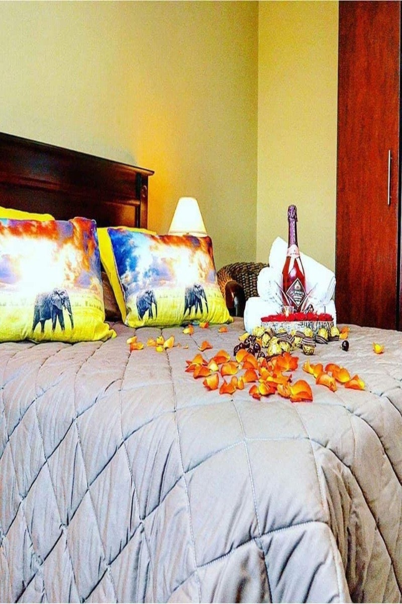 The open-plan living area features a stylish kitchen fully equipped with a stove, oven, microwave, fridge-freezer, cutlery, crockery, washing machine, tumble dryer, and dishwasher, along with tea- and coffee-making facilities. Next to the kitchen, the lounge includes a 6-seater dining table, comfortable seating, and a Smart TV with Netflix and selected DStv channels.