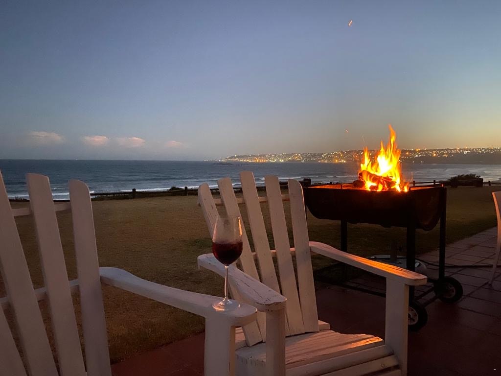 The living room opens onto a communal balcony with ocean views, and outdoor braai facilities are available, as well as beach umbrellas.