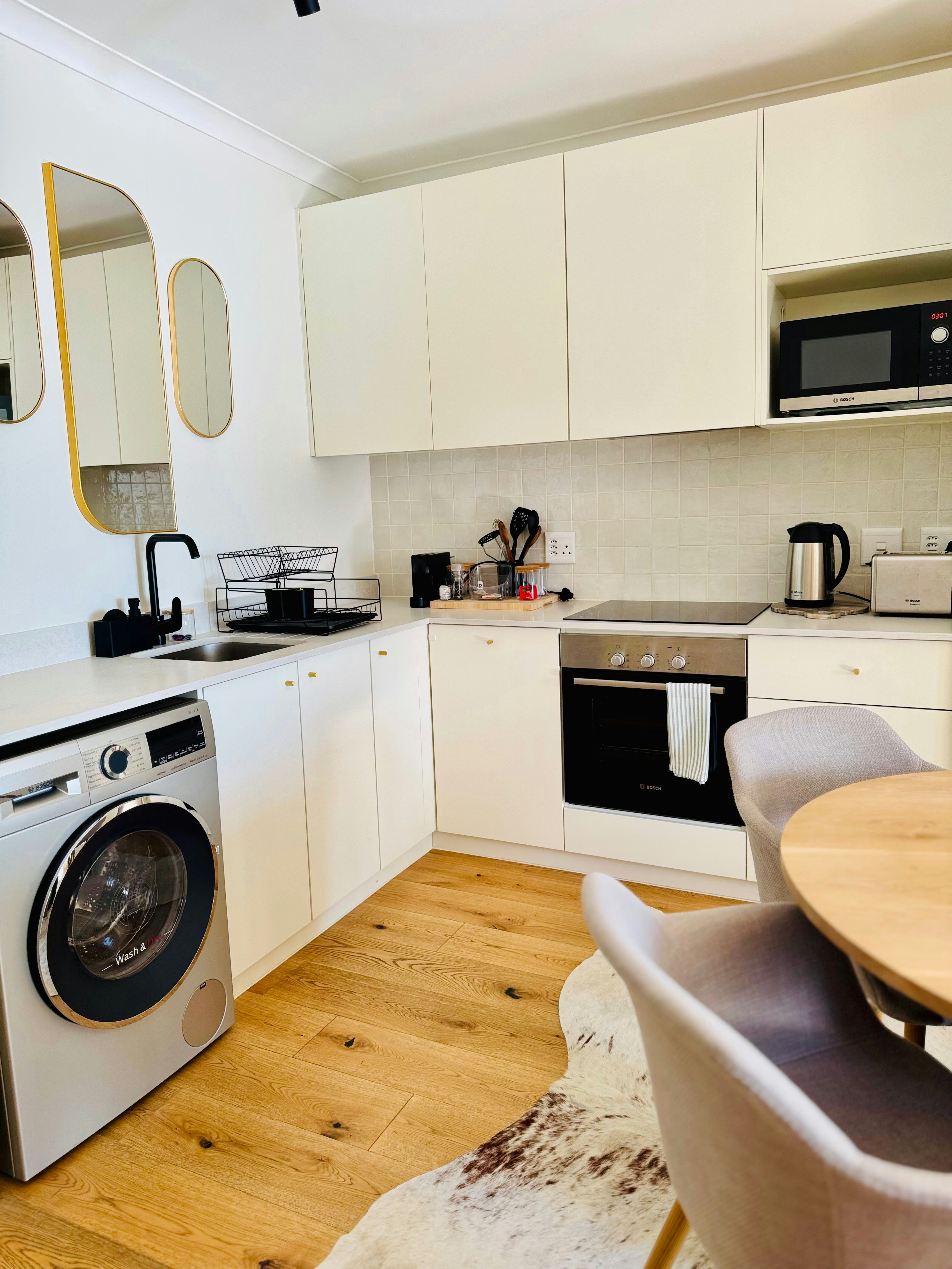 Die leefarea het 'n kombuisie wat met 'n stoof, oond, mikrogolf, yskas, eetgerei, breekware, 'n ketel, tee- en koffiemaakgeriewe en 'n wasmasjien toegerus is. Dit lei na die sitarea met 'n rusbank, TV en lessenaar. Gratis WiFi is beskikbaar.