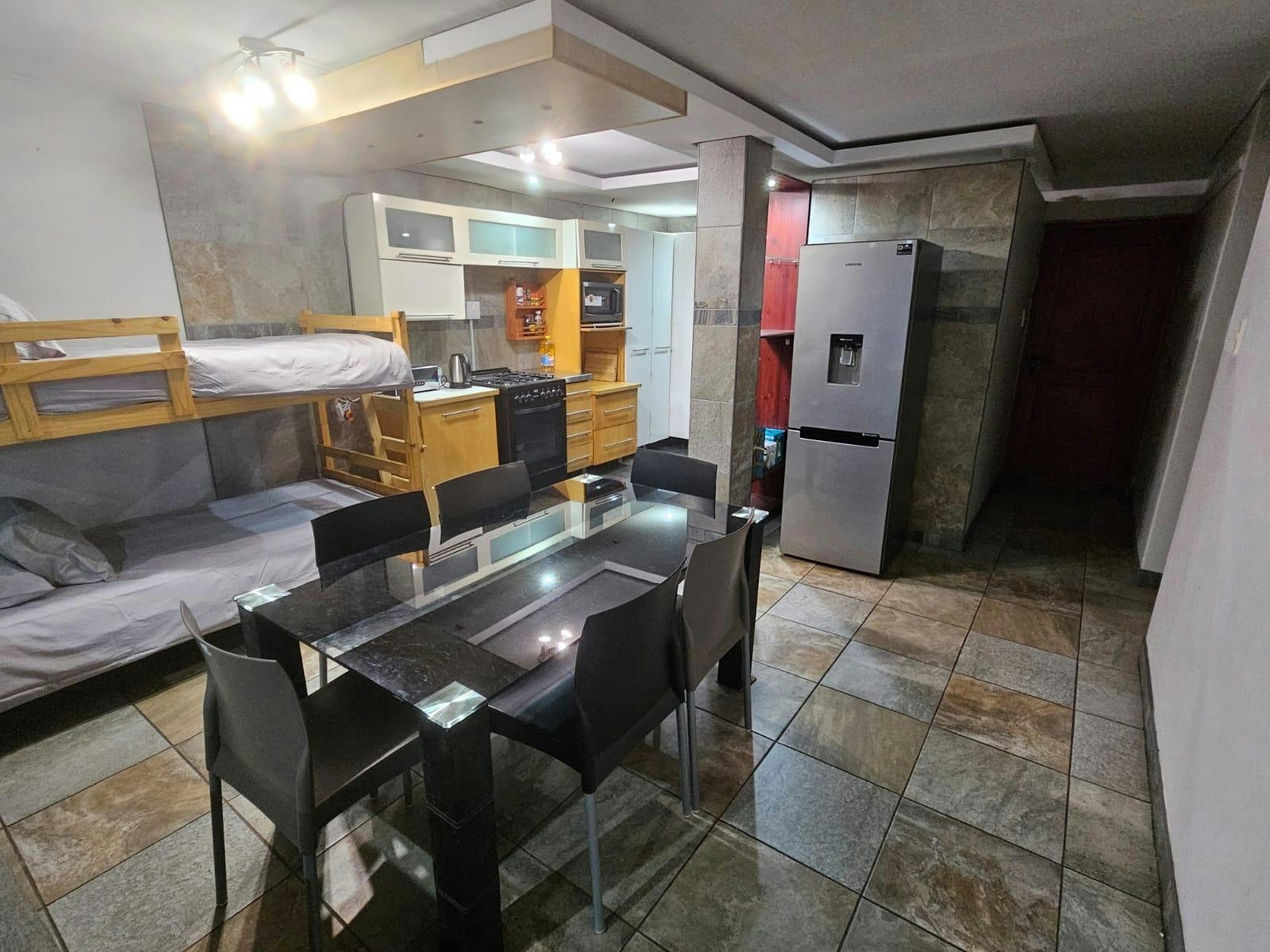 Die oopplan-leefarea beskik oor 'n etenstafel met stoele en 'n sitarea met gemaklike rusbanke en 'n TV met DStv. Die kombuis is met 'n yskas-vrieskas, gasstoof, oond, mikrogolf, tuimeldroër en wasmasjien toegerus.