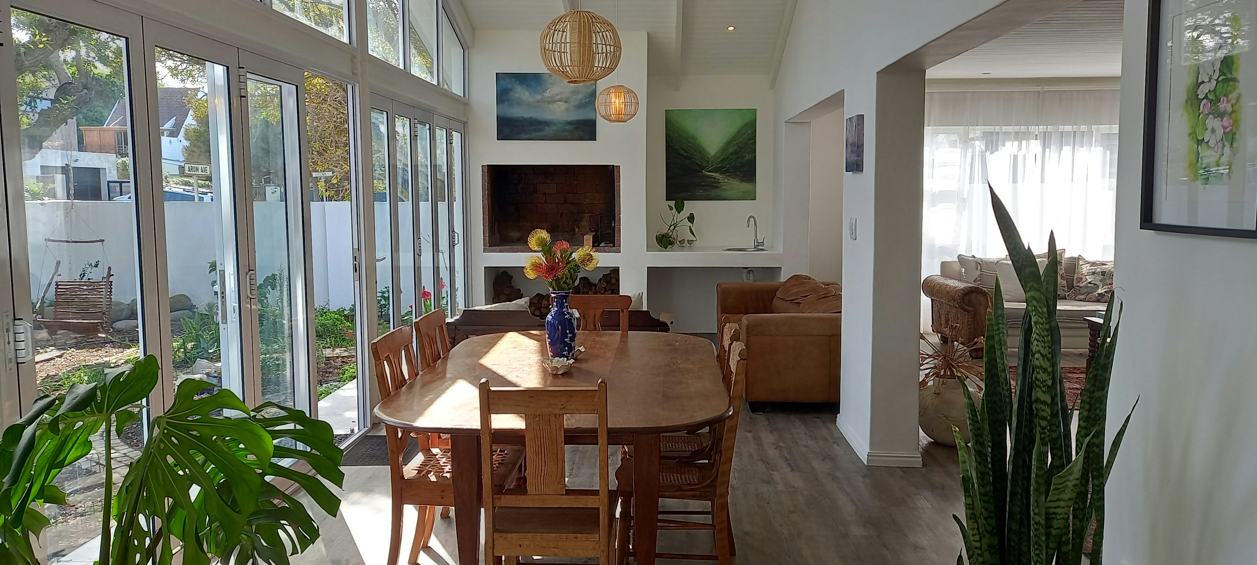 Additionally, there is an indoor braai area with another dining table which is an ideal spot for guests to enjoy some quality time together while having a braai. The stacking doors open onto a lush green garden with a firepit. For those returning from the beach, an outdoor shower is available for guests to rinse off.