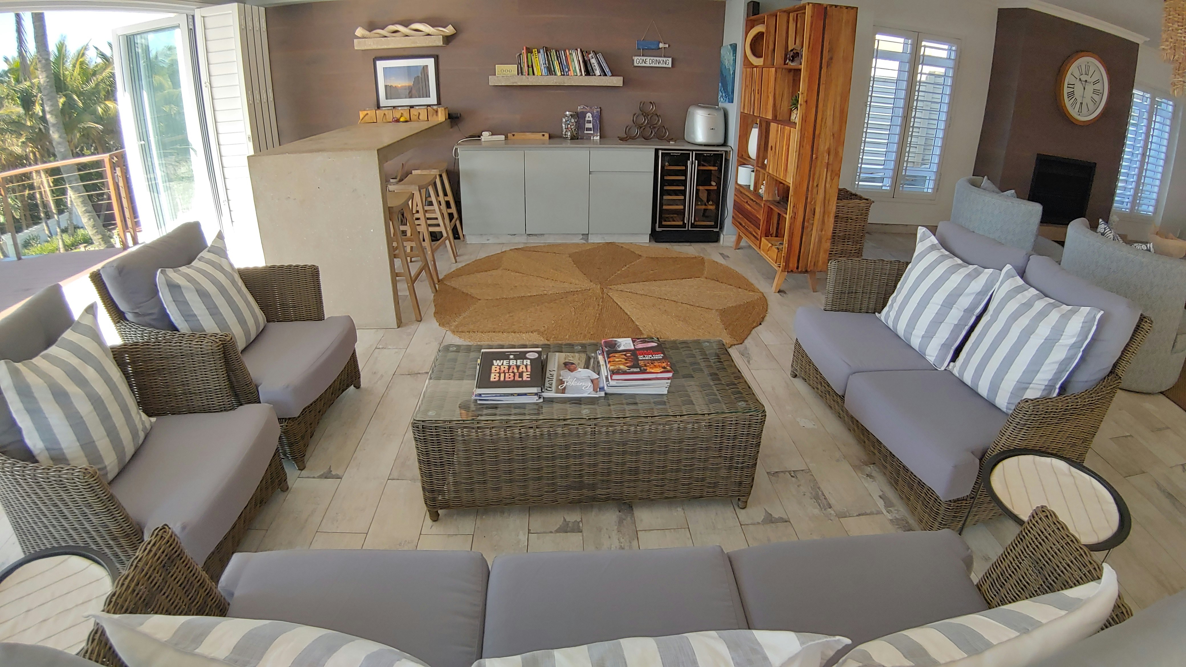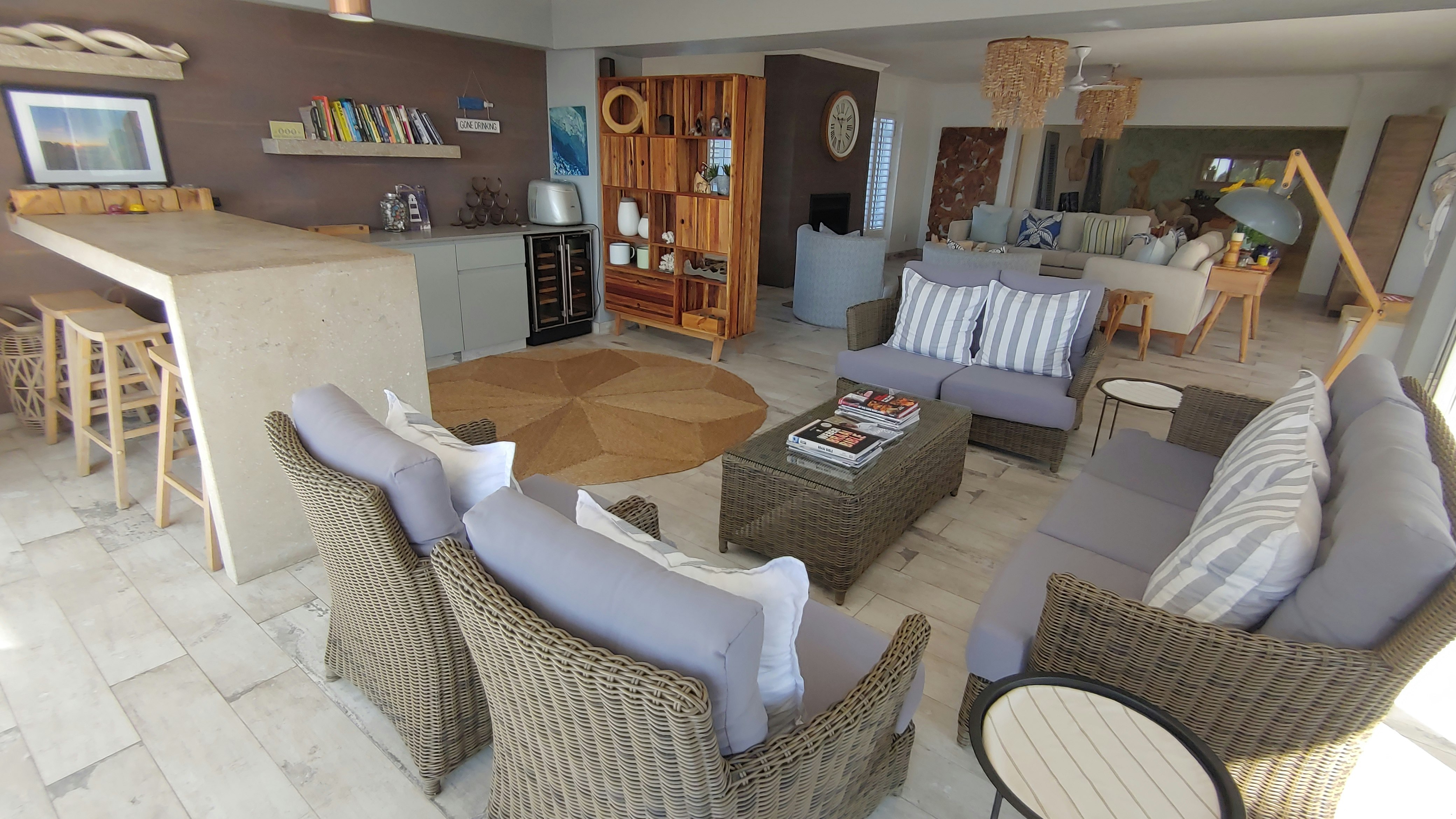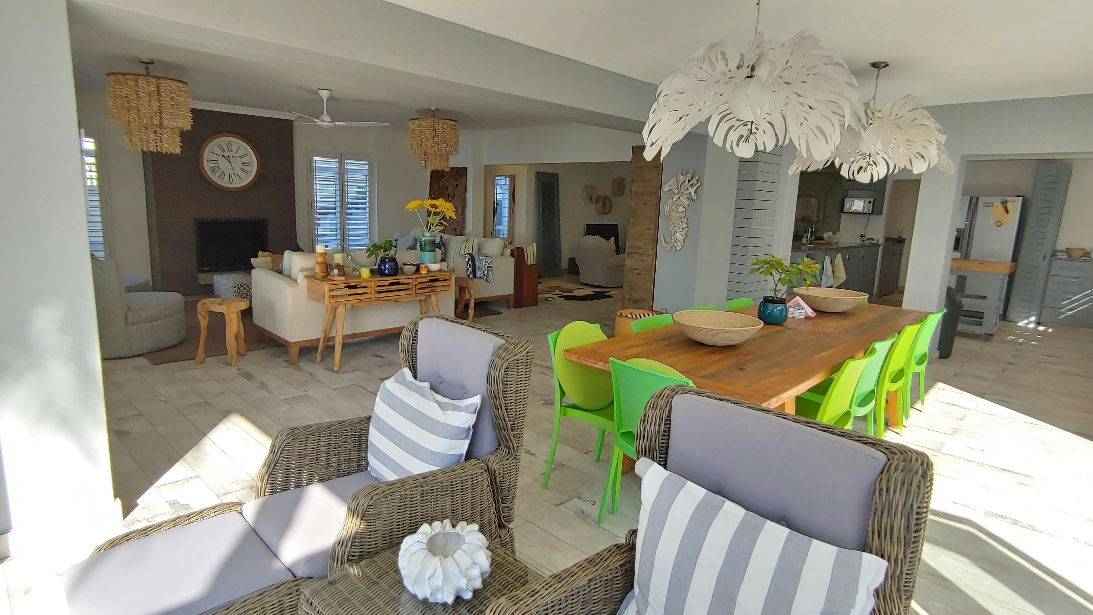 Die ruim oopplan-leefarea beskik oor 2 leefvertrekke, 'n kombuis, 'n opwaskamer, 'n eetkamer en 'n kroeg. Albei die leefvertrekke is ingerig met gemaklike rusbanke, maar die formele sitkamer het 'n kaggel, terwyl die tweede sitkamer 'n TV met DStv het. Die kombuis is toegerus met 'n yskas-vrieskas, gasstoof, stoof, mikrogolf, skottelgoedwasser, eetgerei en breekware, tee- en koffiemaakgeriewe en 'n ontbyttoonbank met stoele. Die kroeg is toegerus met 'n yskassie en is ingerig met gemaklike sitplek. Die eetkamer beskik oor 'n groot etenstafel en 2 sitkamerstoele. Die huis sluit ook 'n wasmasjien, 'n tuimeldroër en sonkrag-rugsteun vir ligte en proppe in. Toegang tot Wi-Fi is ook beskikbaar. Die leefarea het glasdeure wat oopmaak op 'n balkon met ongerepte see-uitsigte.