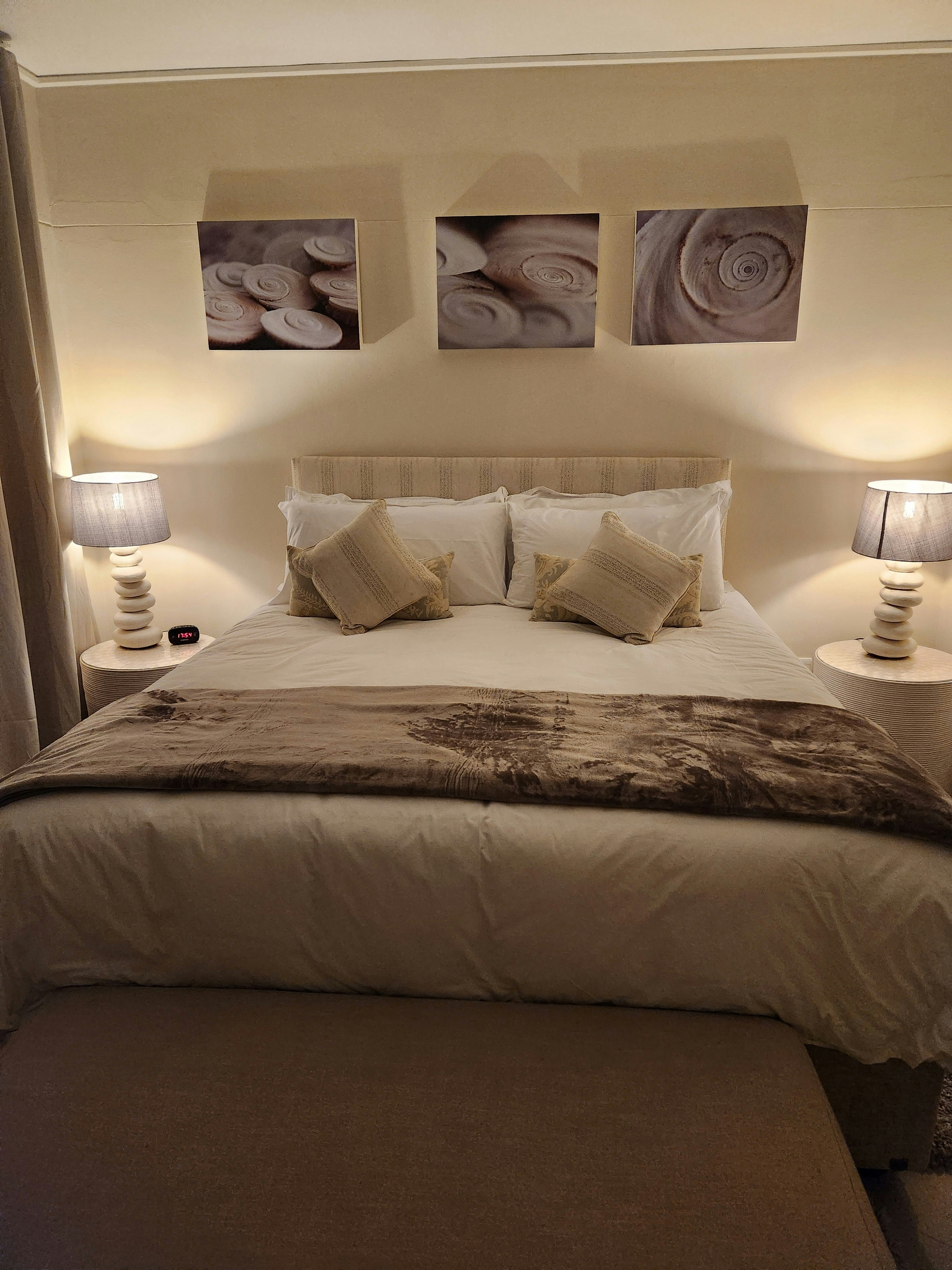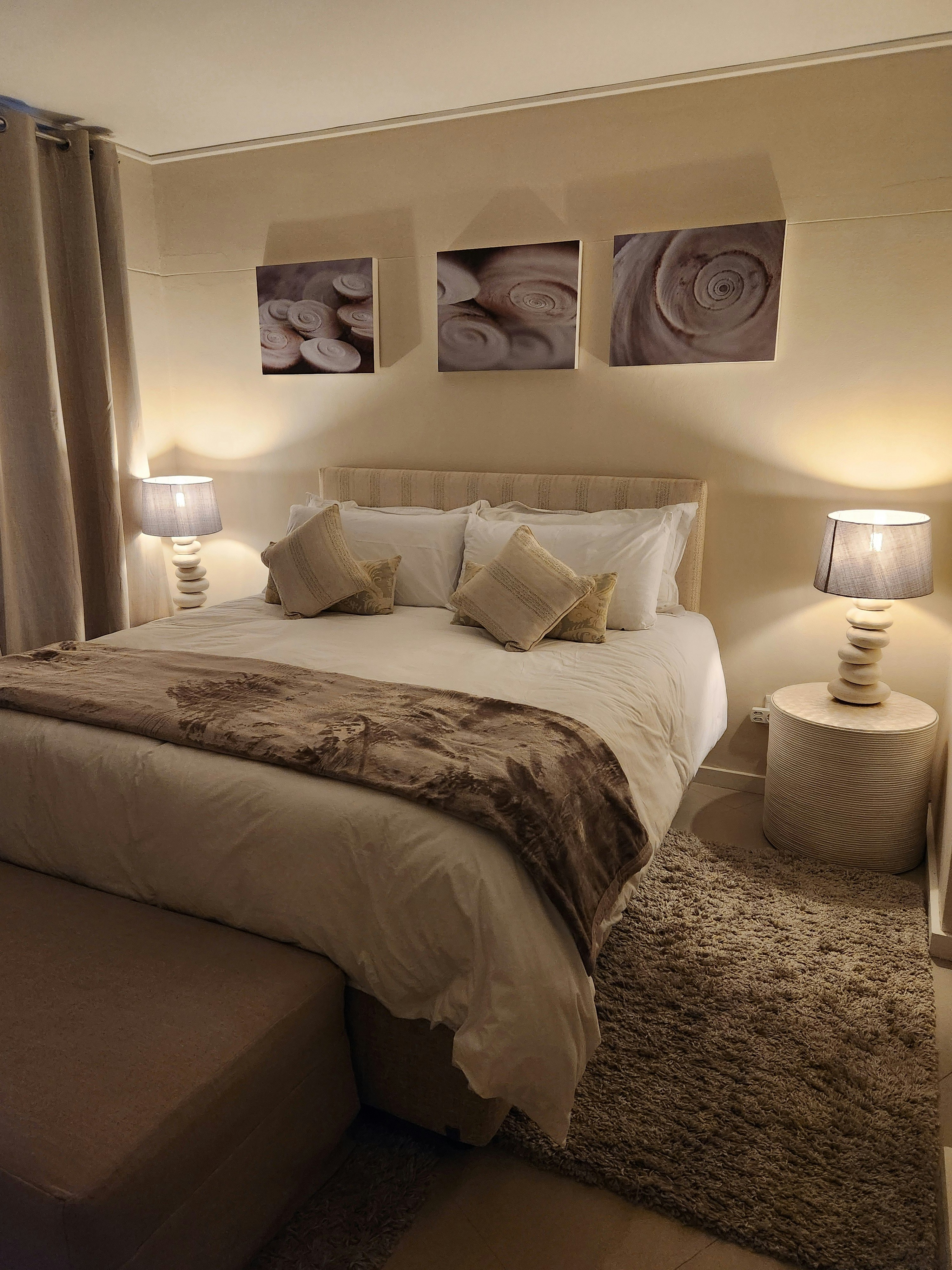 Die hoofslaapkamer is ingerig met 'n koninggrootte-bed en 'n en suite-badkamer met 'n stort en 'n bad. Die tweede kamer het 2 enkelbeddens en 'n en suite-badkamer met 'n stort en 'n toilet. Die woonstel is smaakvol gemeubileer en het perkallinne in die slaapkamers. Strand- en badhanddoeke word ook voorsien.