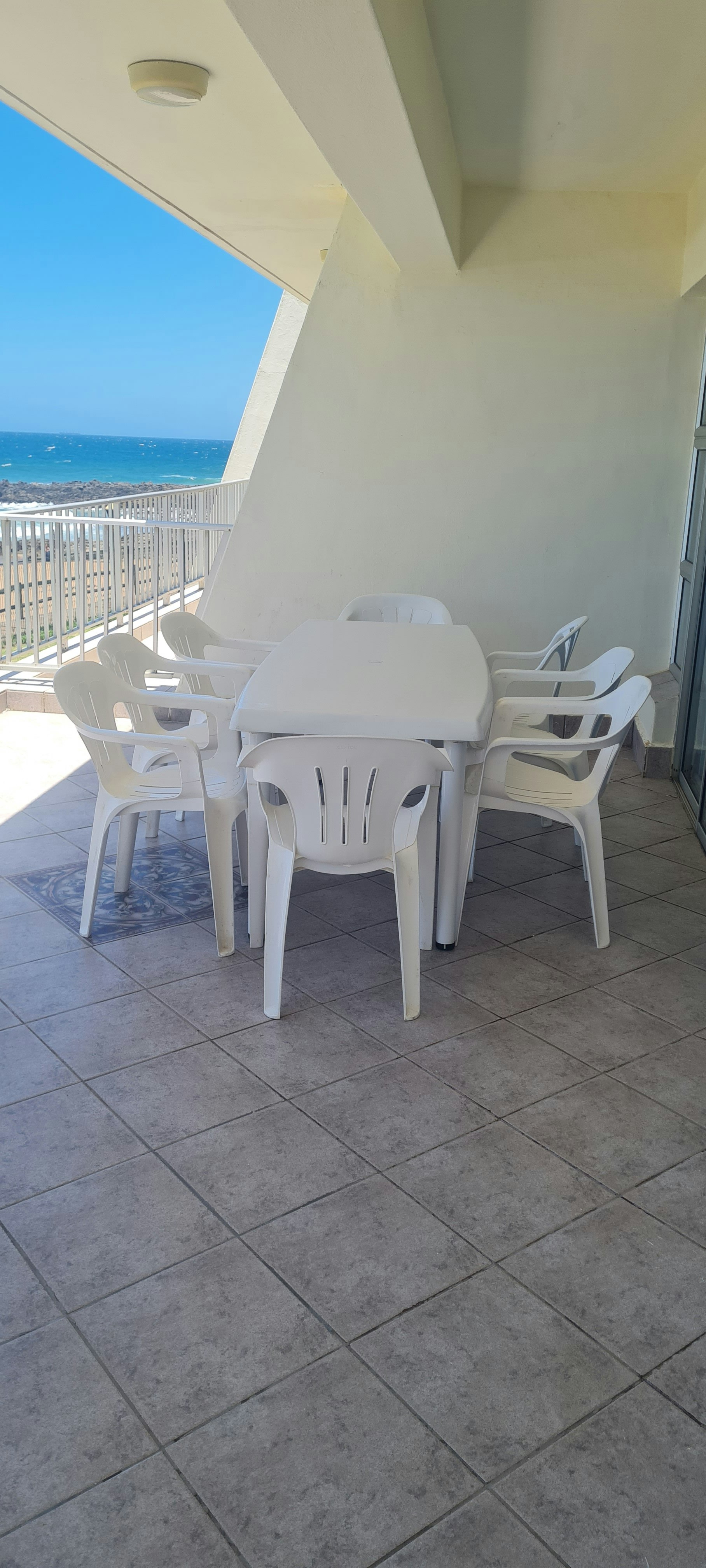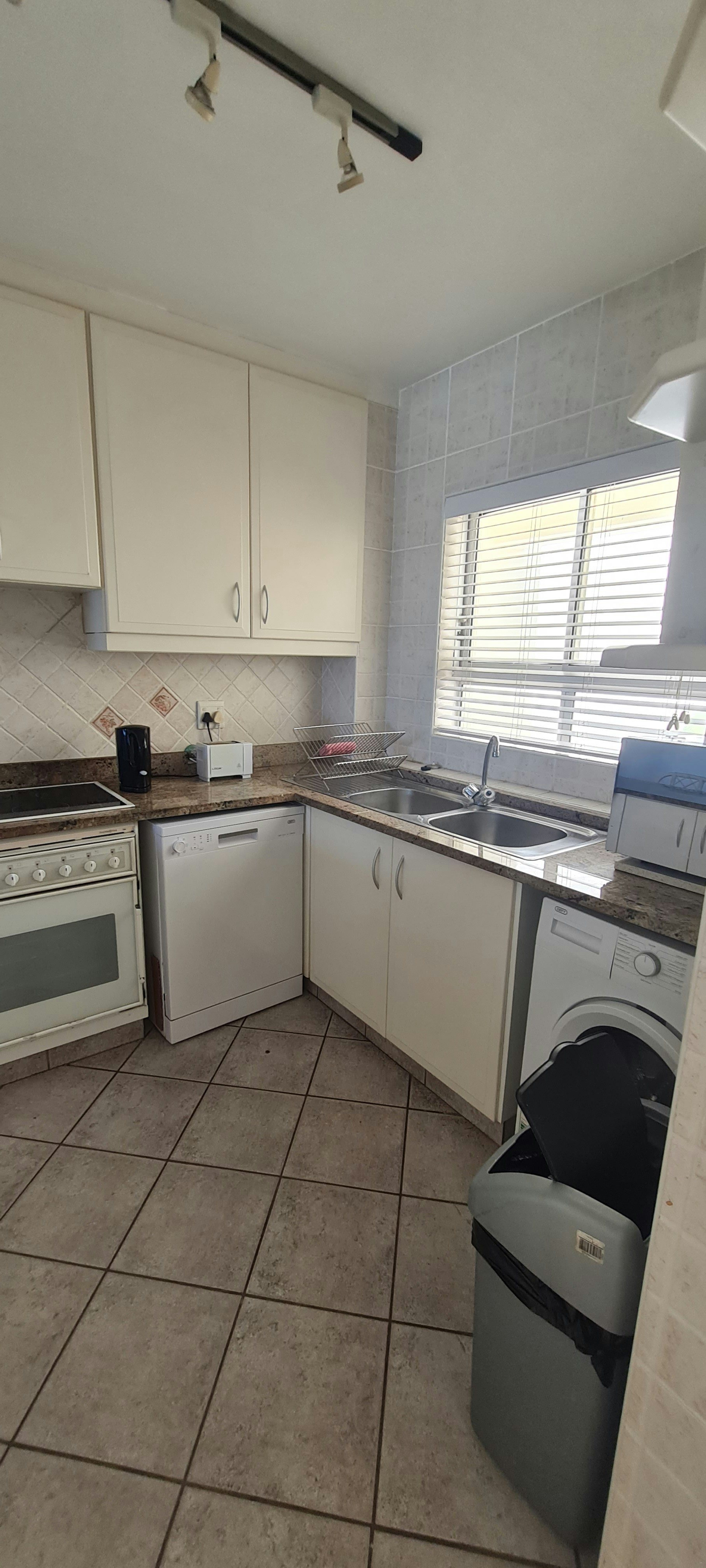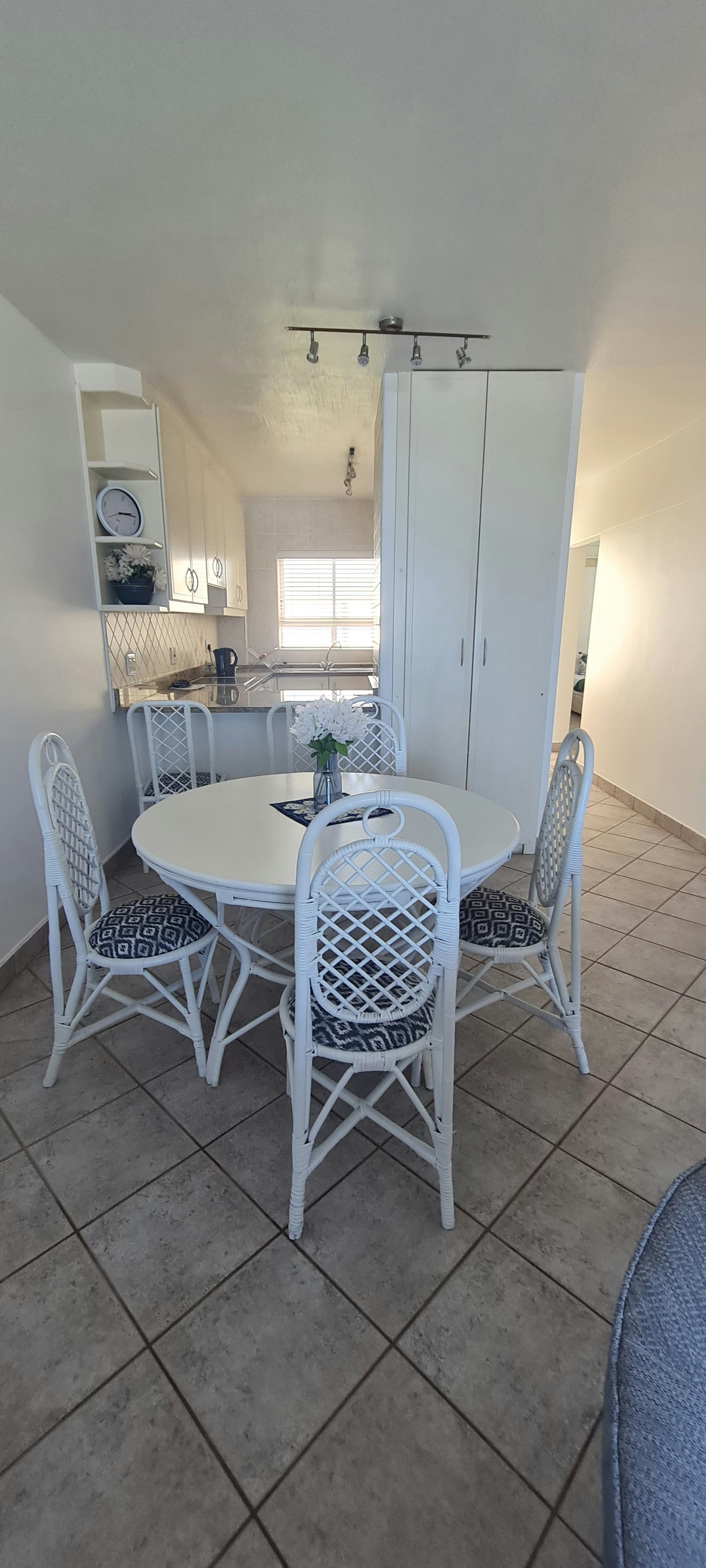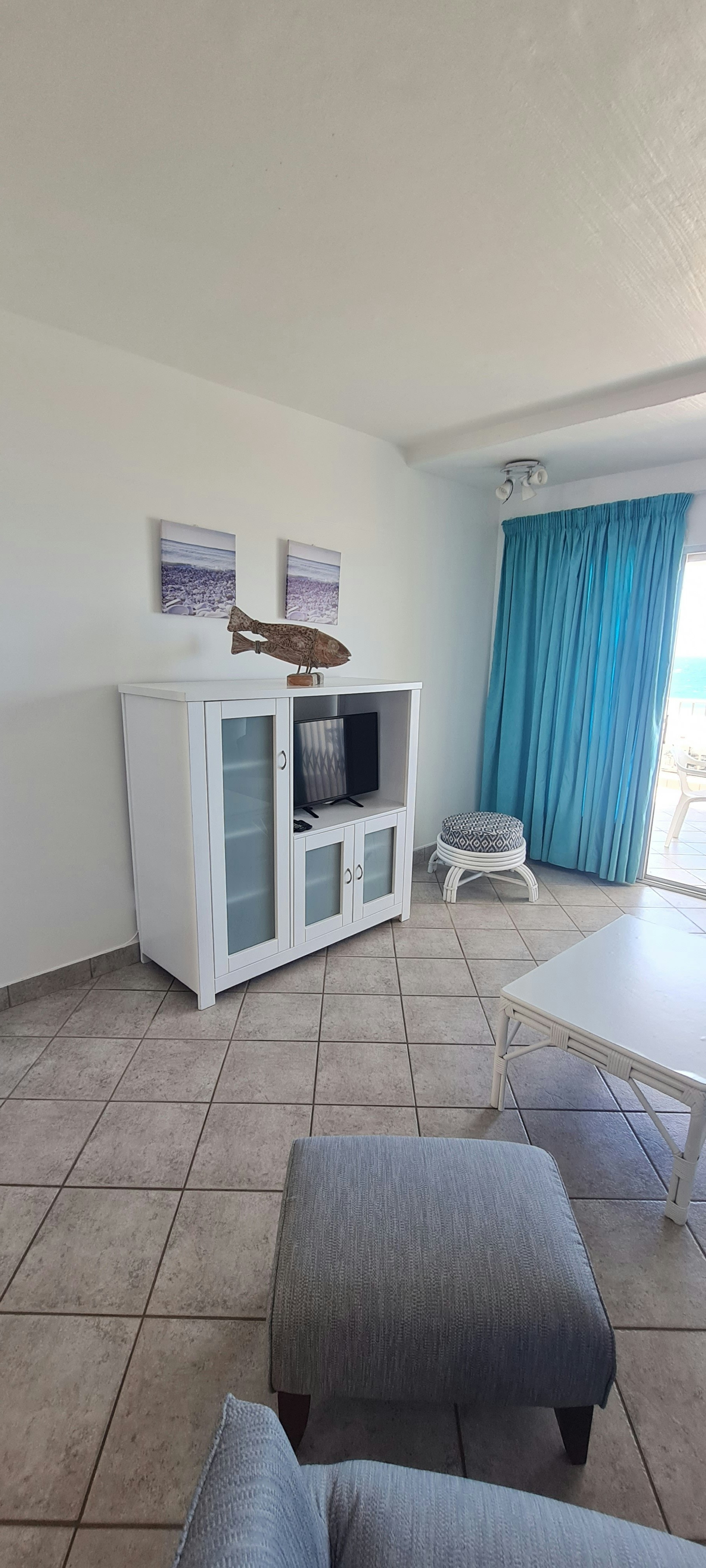 Die kombuis het 'n toonbank met 2 stoele en is met 'n stoof, oond, mikrogolf, broodrooster, yskas-vrieskas, eetgerei en breekware, asook tee- en koffiemaakgeriewe toegerus. Daar is ook 'n skottelgoedwasser en 'n wasmasjien. Die leefarea het 'n etenstafel met 4 stoele, gemaklike rusbanke voor die platskerm-TV en sekere DStv-kanale. Hierdie area lei na die balkon wat meubels en 'n uitsig oor die see het.
