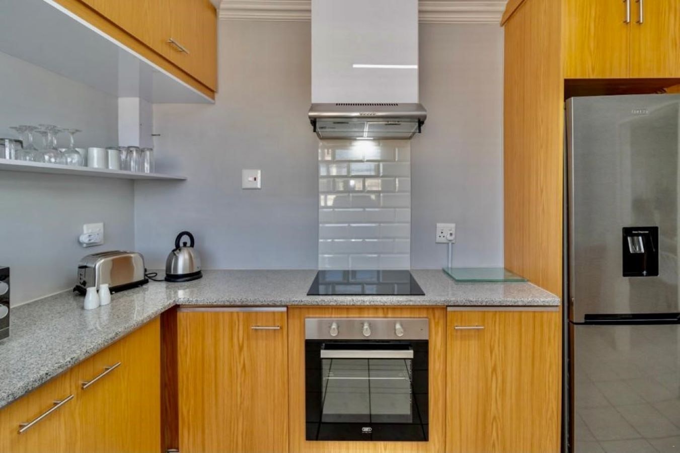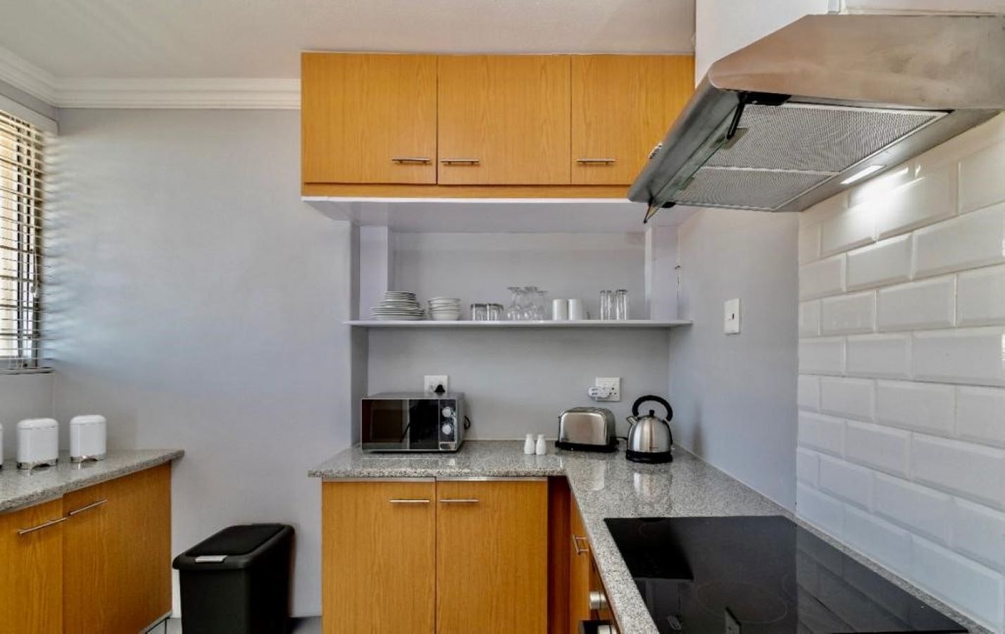 Die oopplan-kombuis is met 'n yskas-vrieskas, mikrogolf, oond, stoof, broodrooster, eetgerei, breekware, en tee- en koffiemaakgeriewe toegerus. Die leefarea het 'n TV met DStv, gemaklike sitplek, 'n etenstafel, en 'n glasskuifdeur wat na die stoep lei.