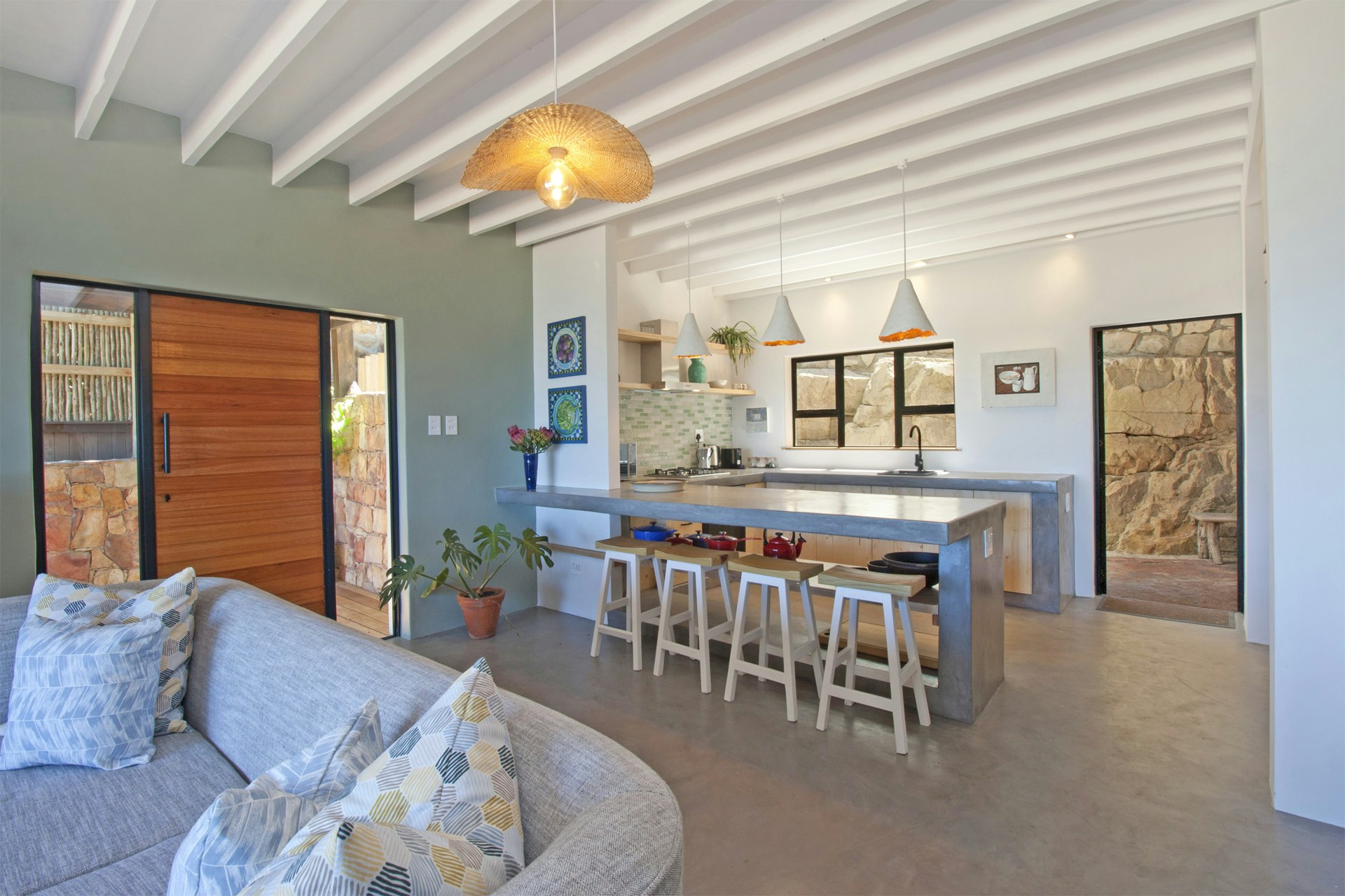 Op die grondverdieping is daar 'n oopplan-leefarea met 'n kombuis, 2 sitareas en 'n eetarea. Die kombuis is met 'n yskas-vrieskas, gasstoof, oond, mikrogolfoond, eetgerei, breekware, tee- en koffiemaakgeriewe, 'n skottelgoedwasser en 'n toonbank met stoele toegerus. Die eerste sitarea het gemaklike sitplek en 'n kaggel, die tweede sitarea het 'n TV en sitplek en die eetarea het 'n groot etenstafel. Die leefarea bied via glas-skuifdeure toegang tot 'n onderdakstoep met buitemeubels en 'n ongerepte see-uitsig. Gratis WiFi is beskikbaar.