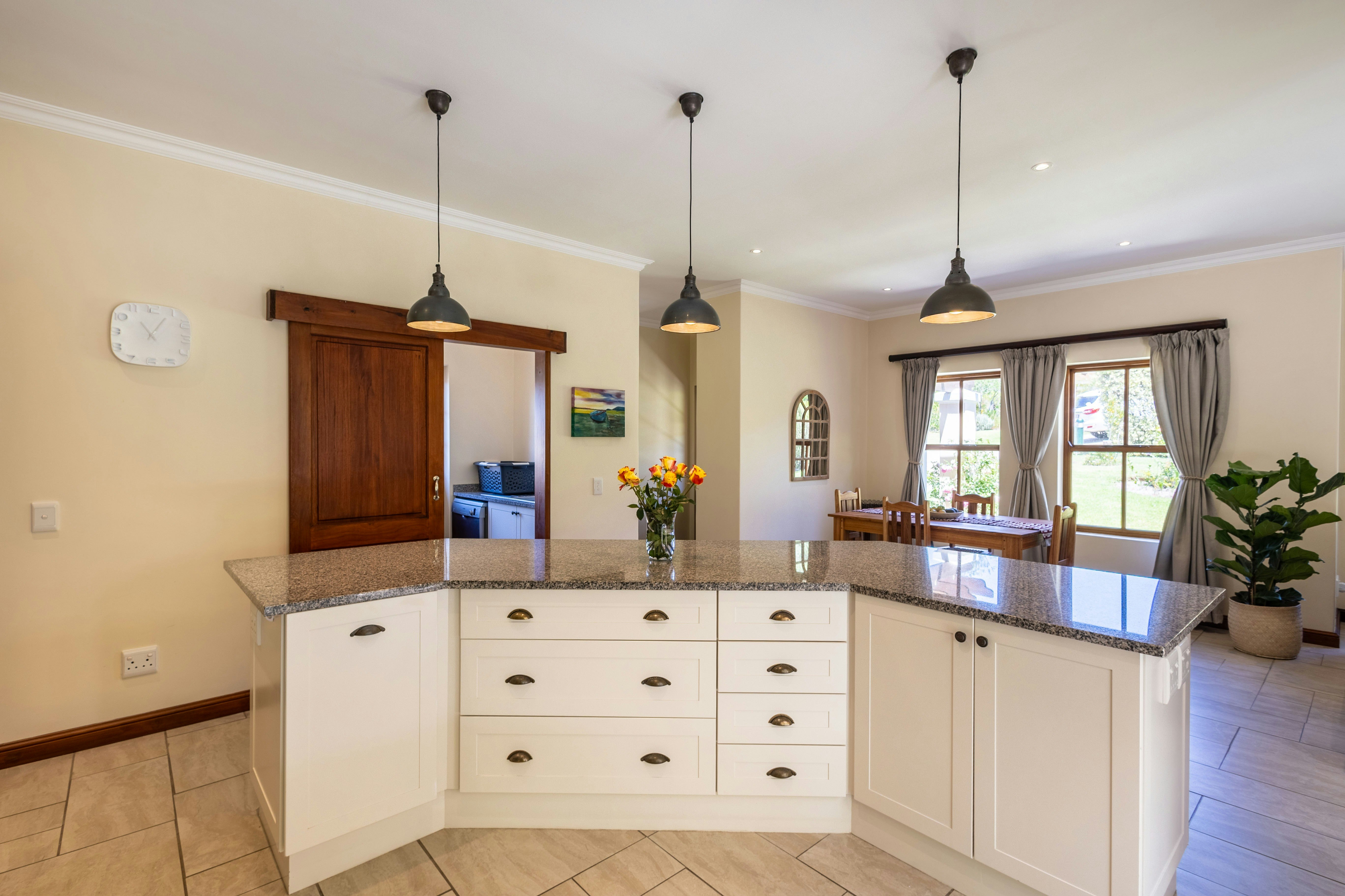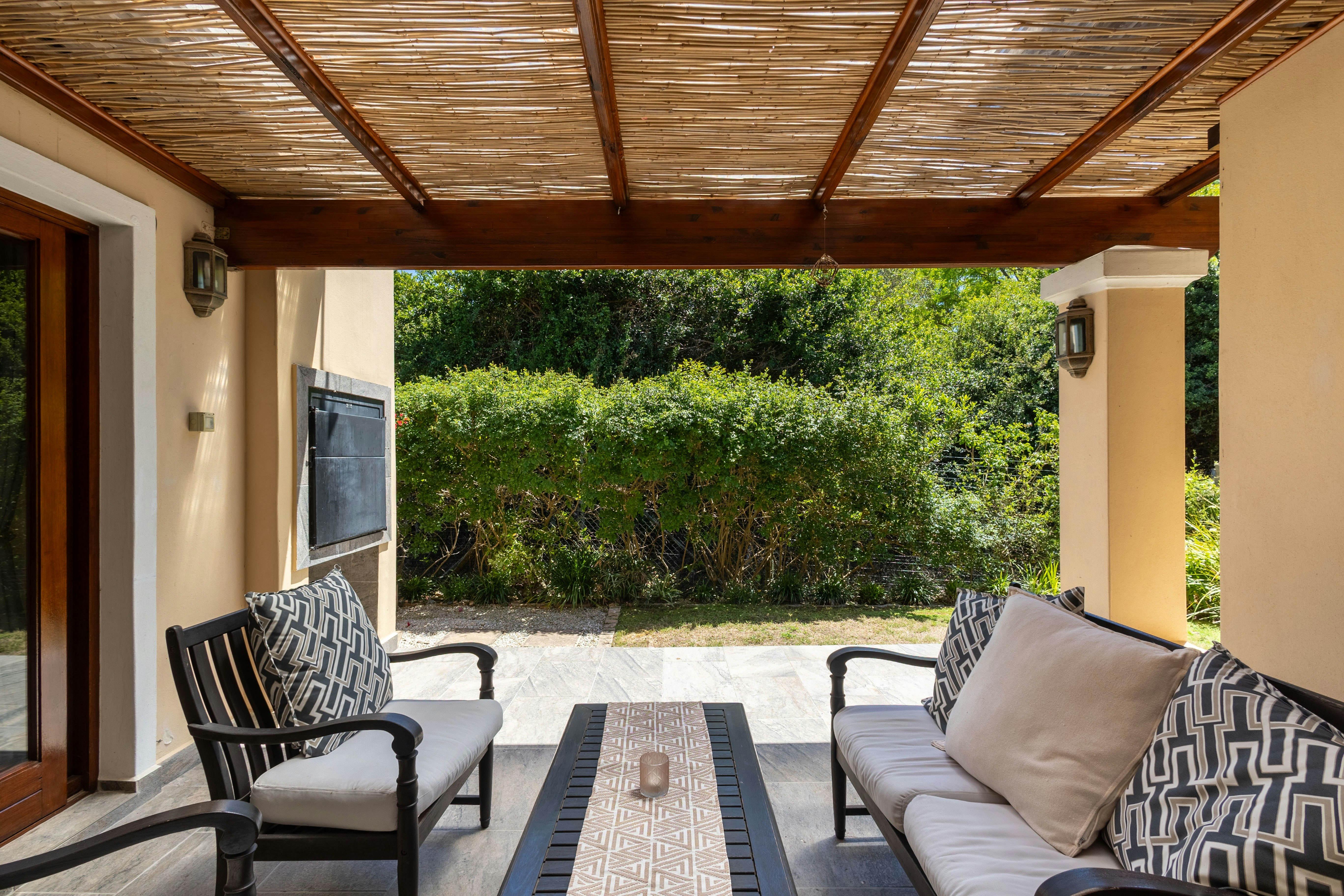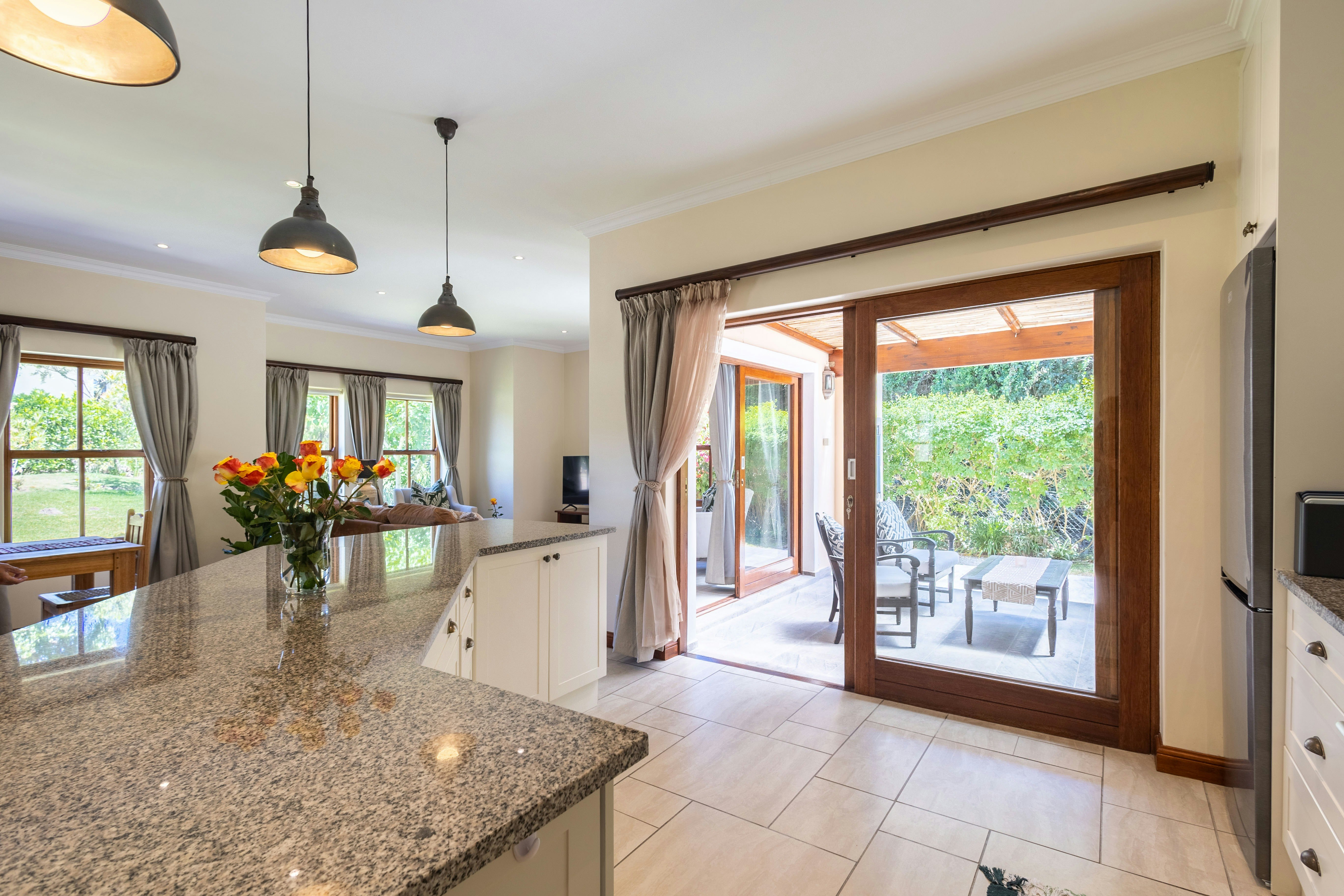 Die sitkamer vloei naatloos na 'n patio met buitesitplek en 'n braai. Gaste het toegang tot 'n enkelmotorhuis.