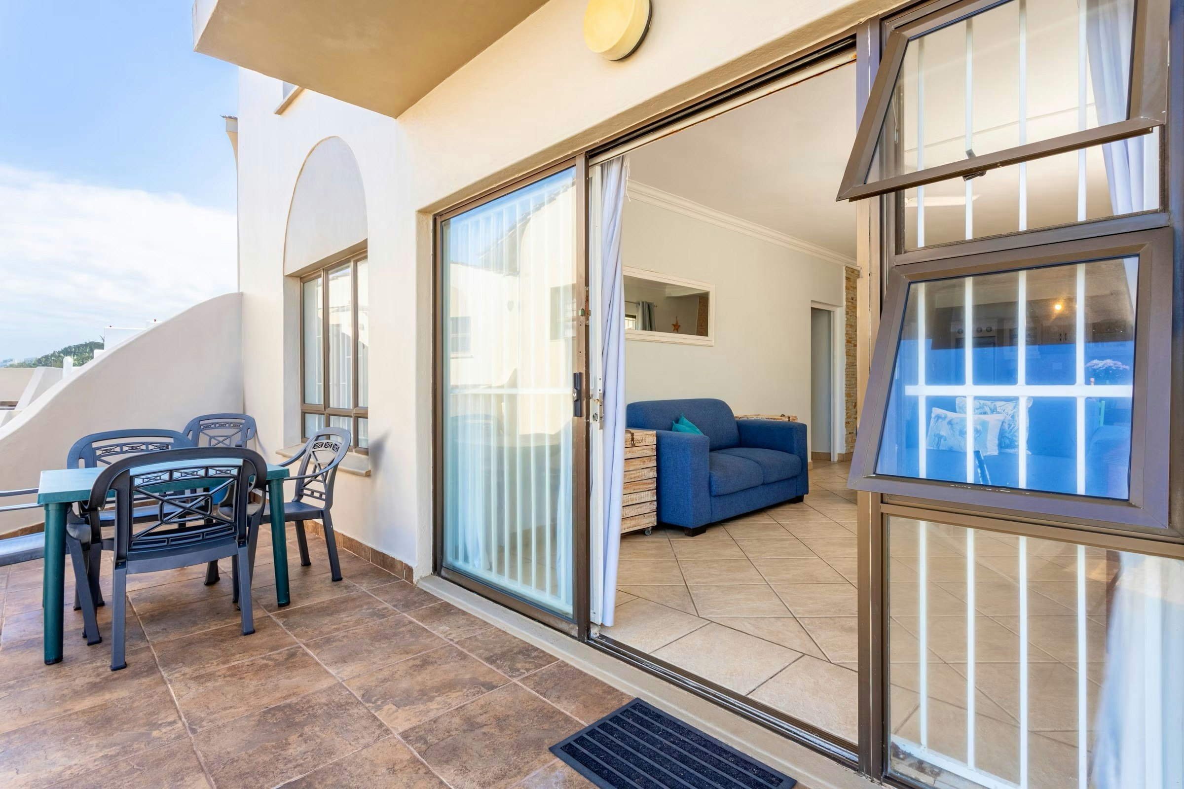 Die oopplan-leefarea beskik oor 'n volledig toegeruste kombuis met 'n stoof, oond, mikrogolfoond, yskas-vrieskas, eetgerei, breekware, eetgerei, tee- en koffiemaakgeriewe, ontbyttoonbank, skottelgoedwasser en wasmasjien. Vanuit die kombuis is 'n eetkamertafel wat 4 gaste kan akkommodeer, en die leefarea is ingerig met gemaklike sitplek en 'n TV. Die patio loop uit die leefarea met 'n see-uitsig.