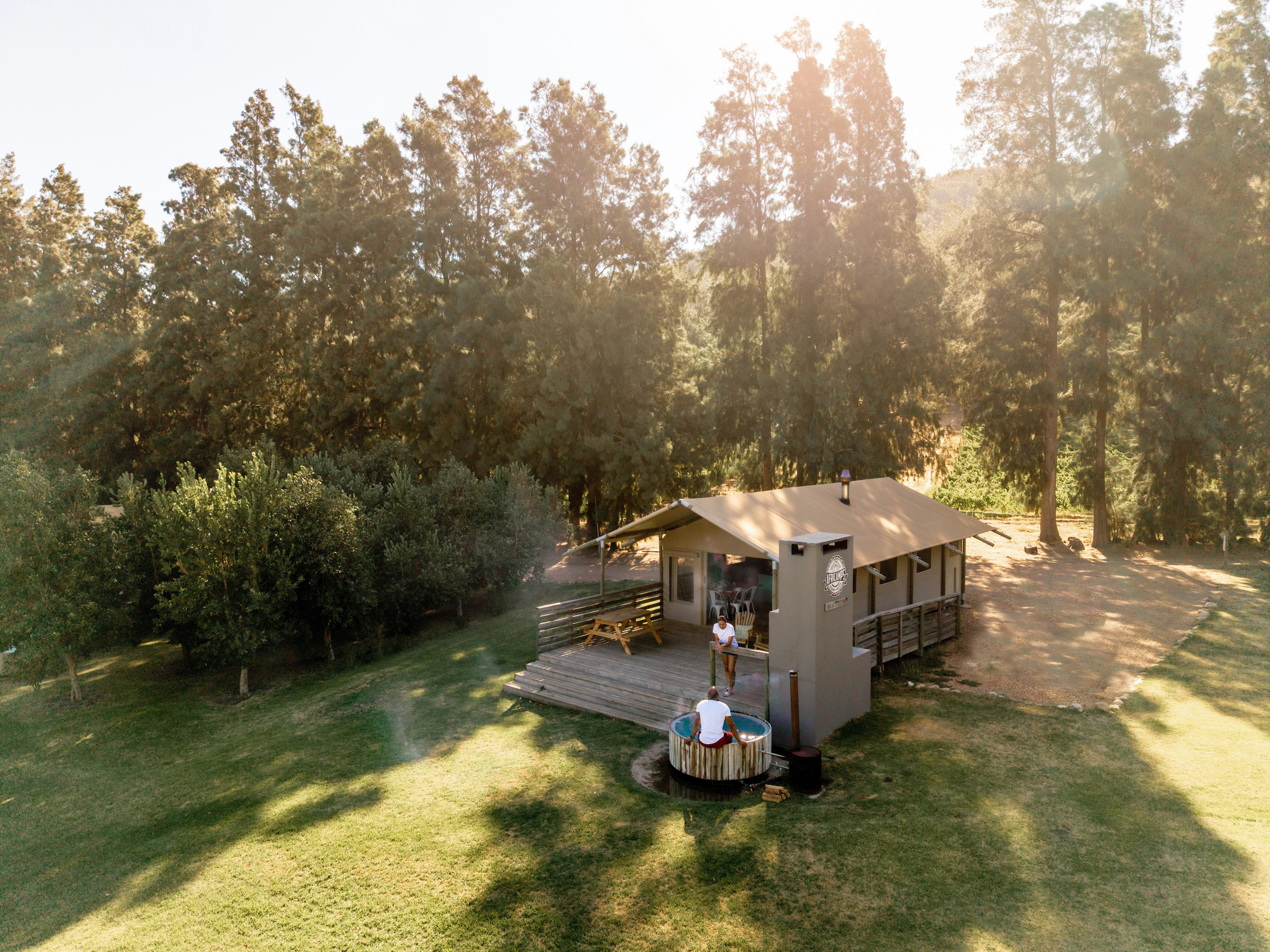 Die oopplan-leefarea beskik oor 'n kombuisie wat met 'n gasstoof, yskassie, eetgerei, breekware en tee- en koffiemaakgeriewe toegerus is. Daar is ook 'n etenstafel en knus sitarea met gemaklike sitplek en 'n kaggel. Die tent lei na 'n onderdakstoep met buitesitplek, braaigeriewe en 'n houtvuurwarmbad.
