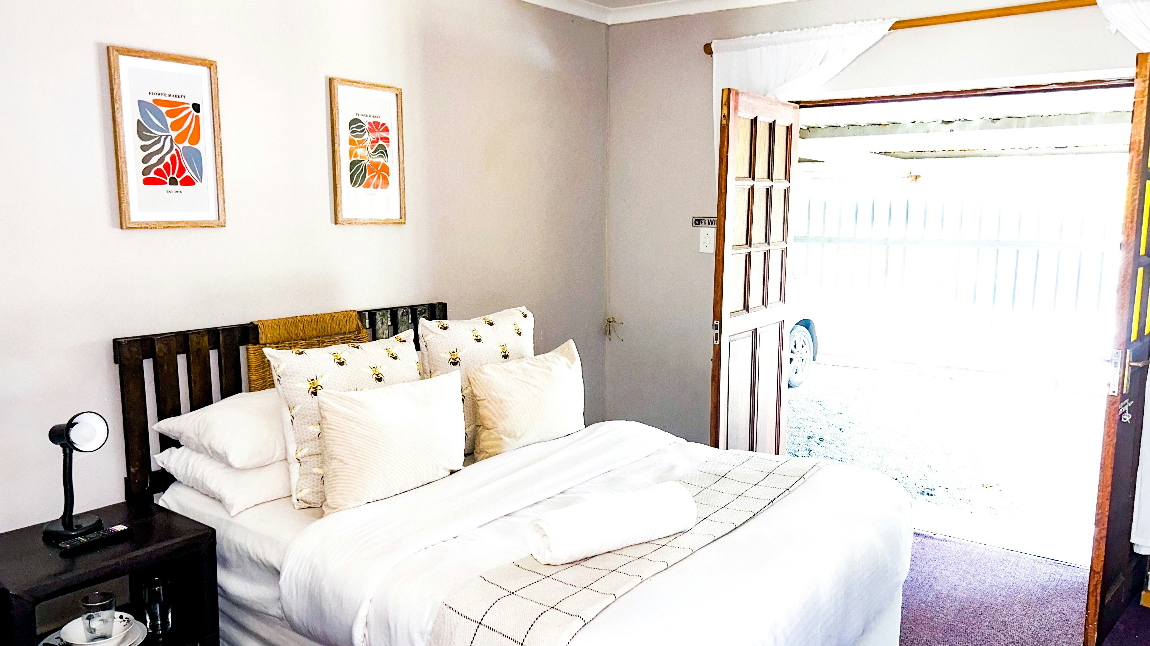 Dié kamer is ingerig met 'n dubbelbed en deel 'n badkamer met 'n stort, toilet en wasbak.