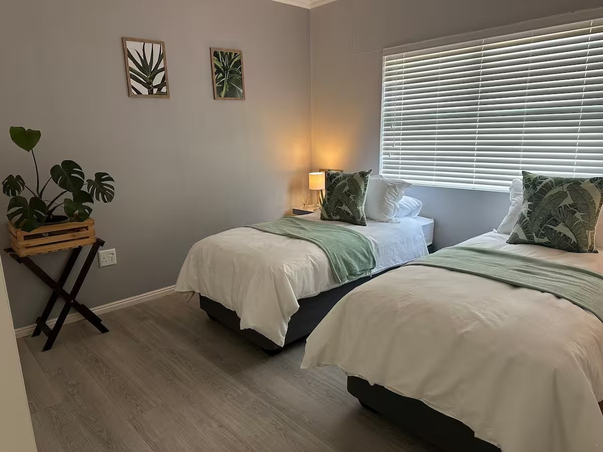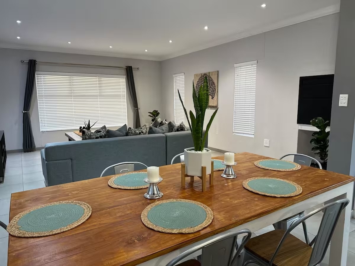 The open-plan living area features a fully equipped kitchen with a stove, oven, microwave, fridge-freezer, cutlery and crockery, along with a breakfast bar with stools. A washing machine and dishwasher are also available for added convenience. Leading from the kitchen is a 6-seater dining table and a lounge with a comfortable L-shaped couch, an indoor braai area and a Smart TV. Free Wi-Fi is available throughout the house.