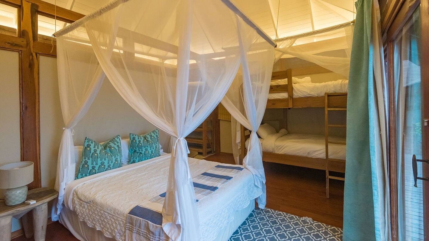 The villa features two air-conditioned bedrooms and can accommodate up to 9 guests, making it ideal for families or small groups. Bedroom 1, the master suite, has a king-size bed and an adjoining room with three single beds, with both indoor and outdoor showers and a bathtub. Bedroom 2 has a double bed and a bunk with two single beds, also with indoor and outdoor showers. A guest powder room is available for visitors.