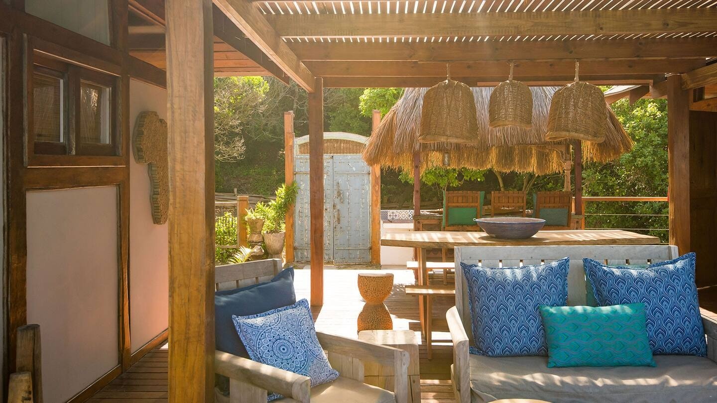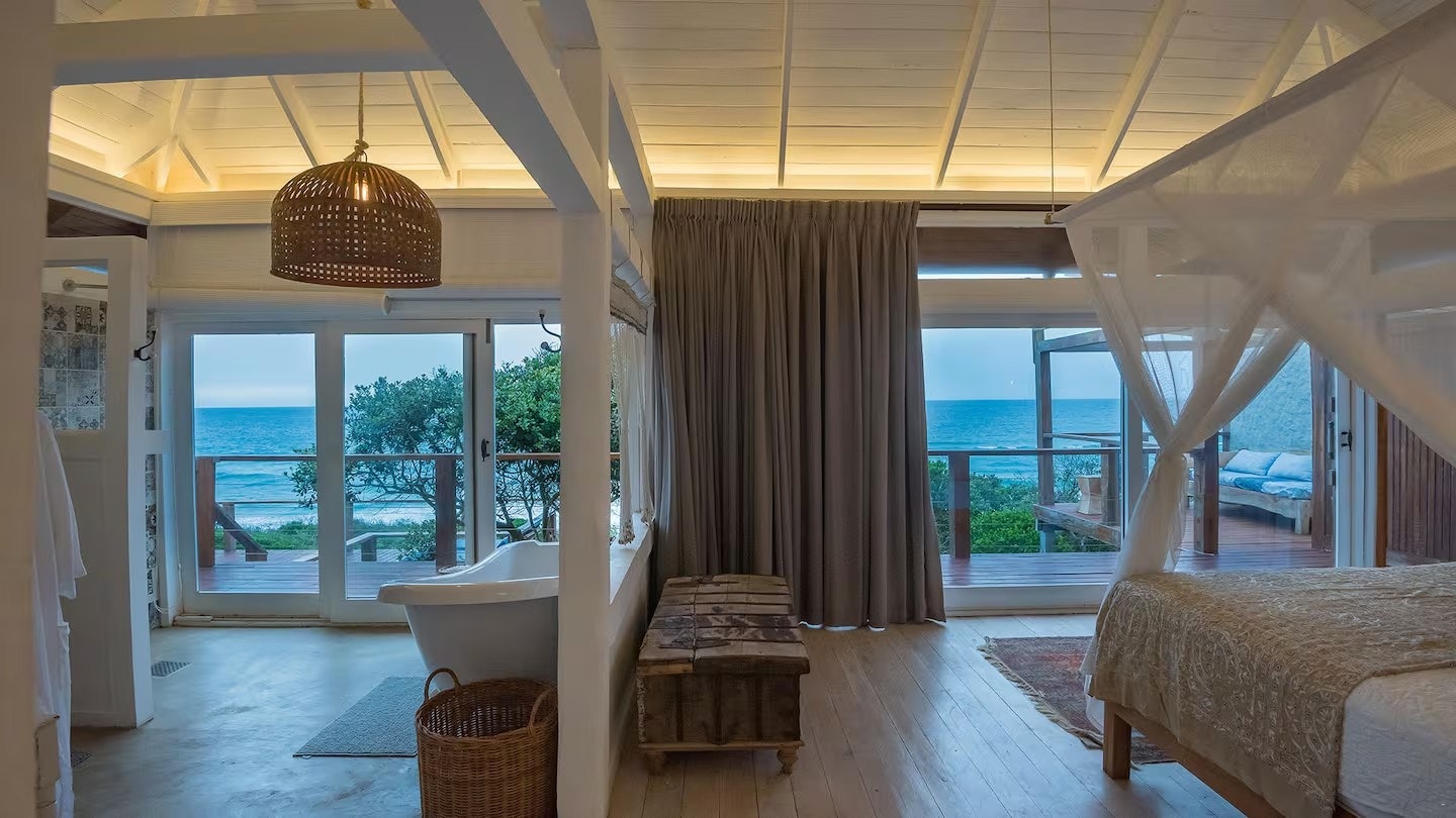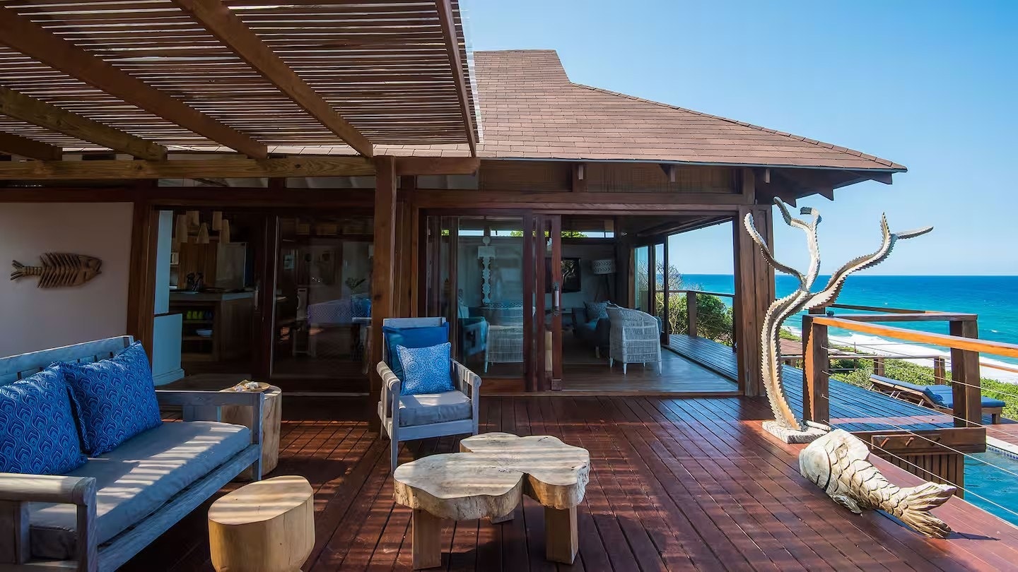 Outside, a wooden deck with a private plunge pool offers direct beach access via a short private staircase. The deck has sun loungers, a braai/BBQ area, and panoramic ocean views.
