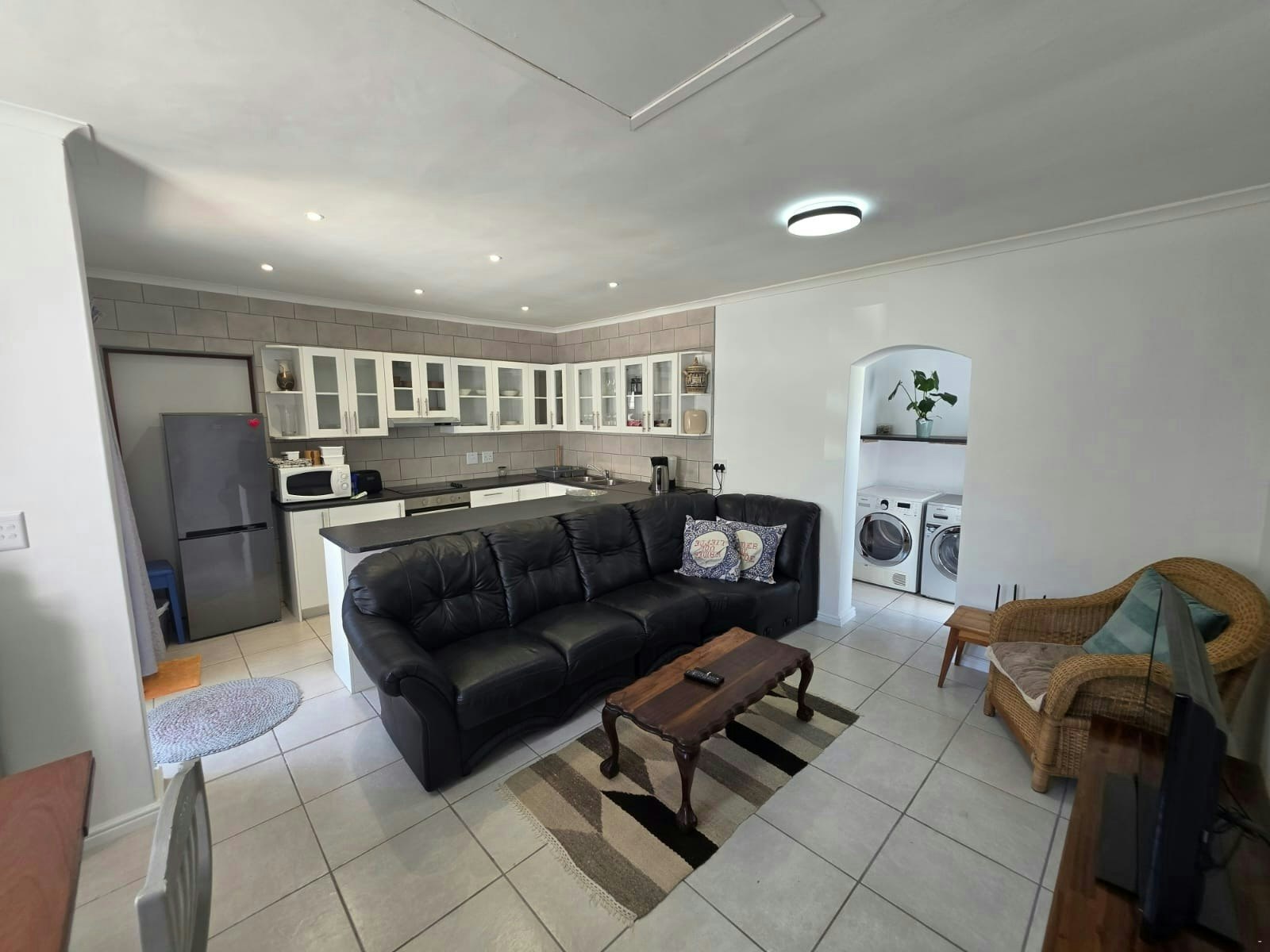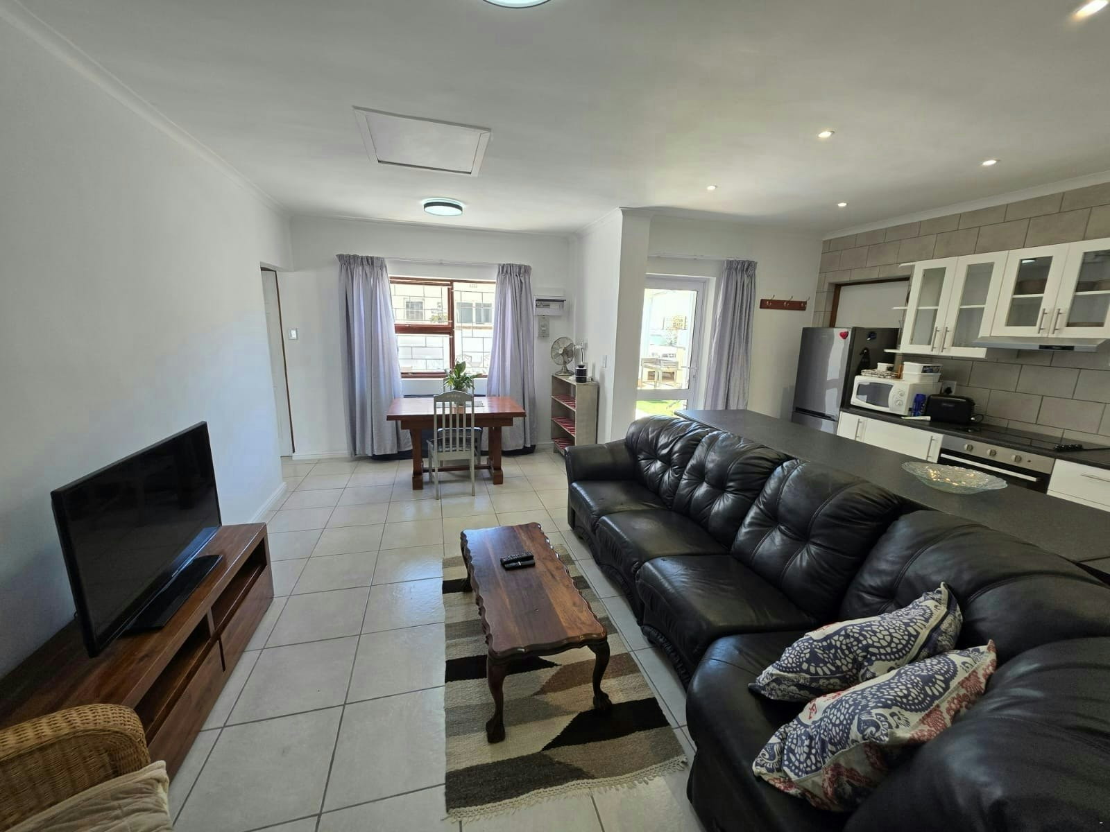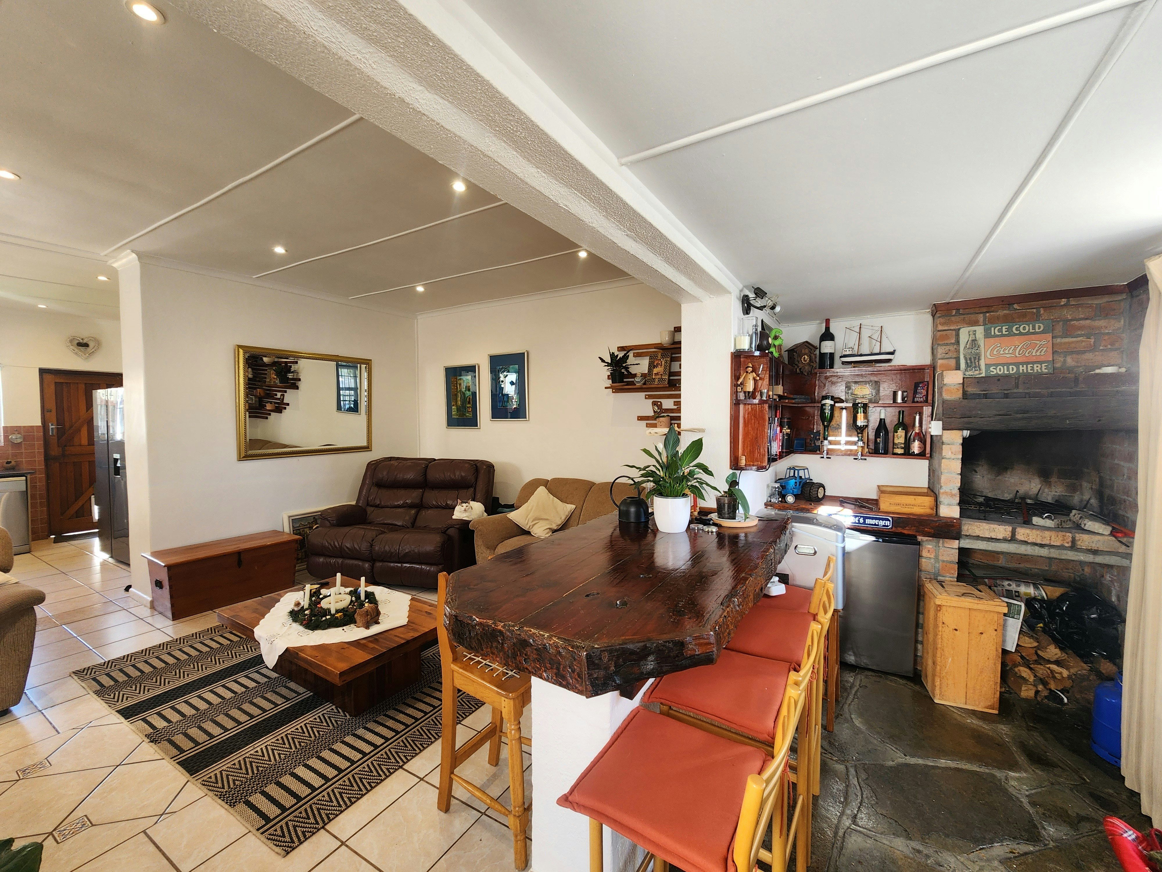 Die oopplan-kombuis is volledig toegerus vir selfsorg en sluit 'n stoof, oond, yskas-vrieskas, mikrogolfoond, eetgerei en breekware in. Die oopplan-leefarea het ook 'n binnebraai en 'n kaggel vir kouer aande.