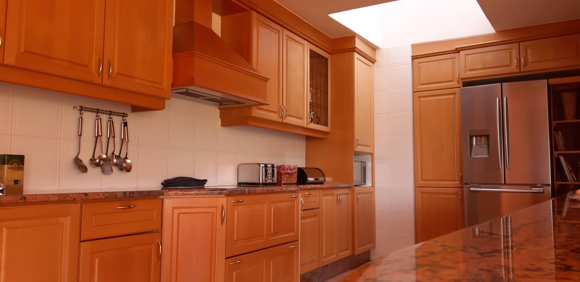 Die kombuis is met 'n stoof, oond, yskas-vrieskas, mikrogolfoond, koffie- en teemaakgeriewe, breekware en eetgerei toegerus. Daar is ook 'n opwasarea.