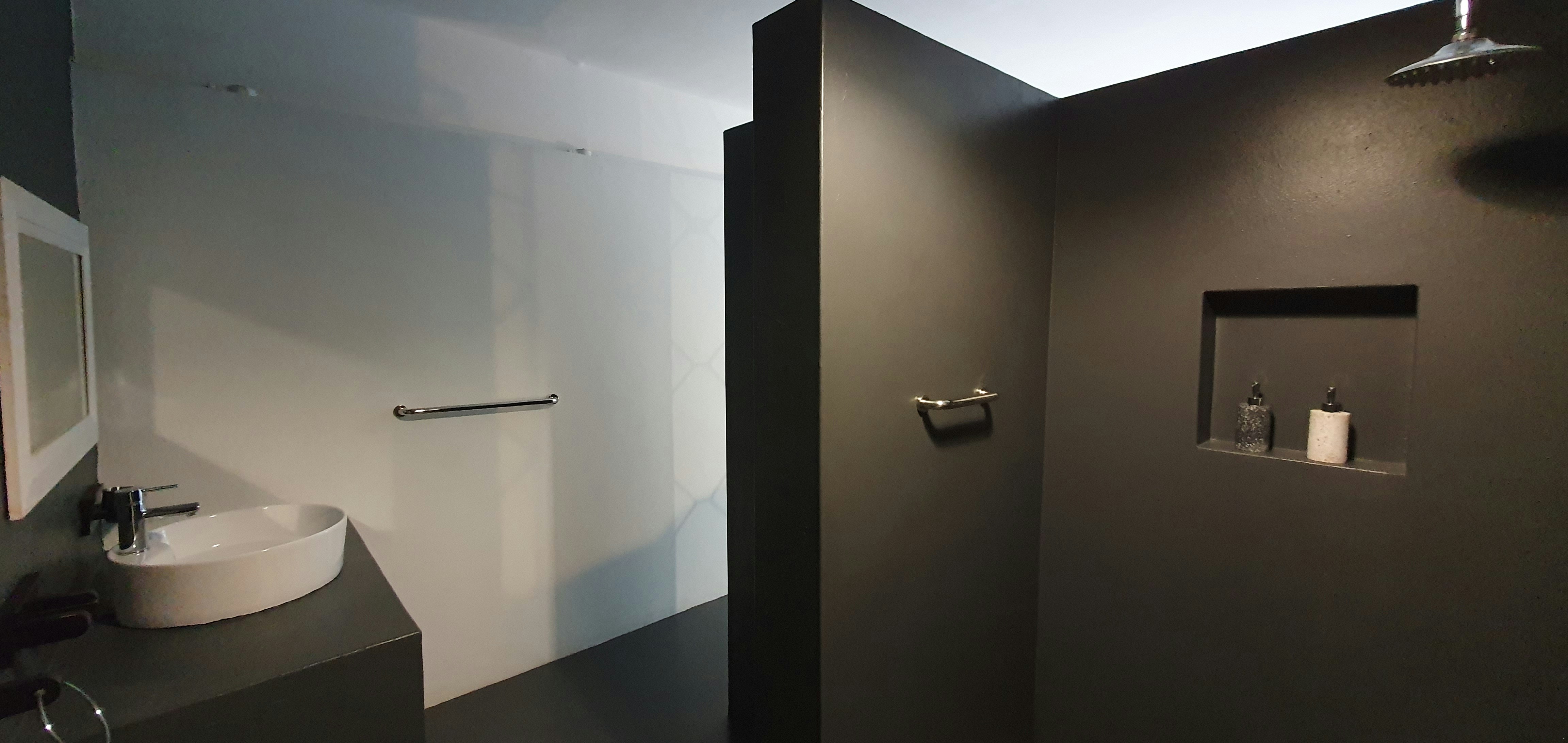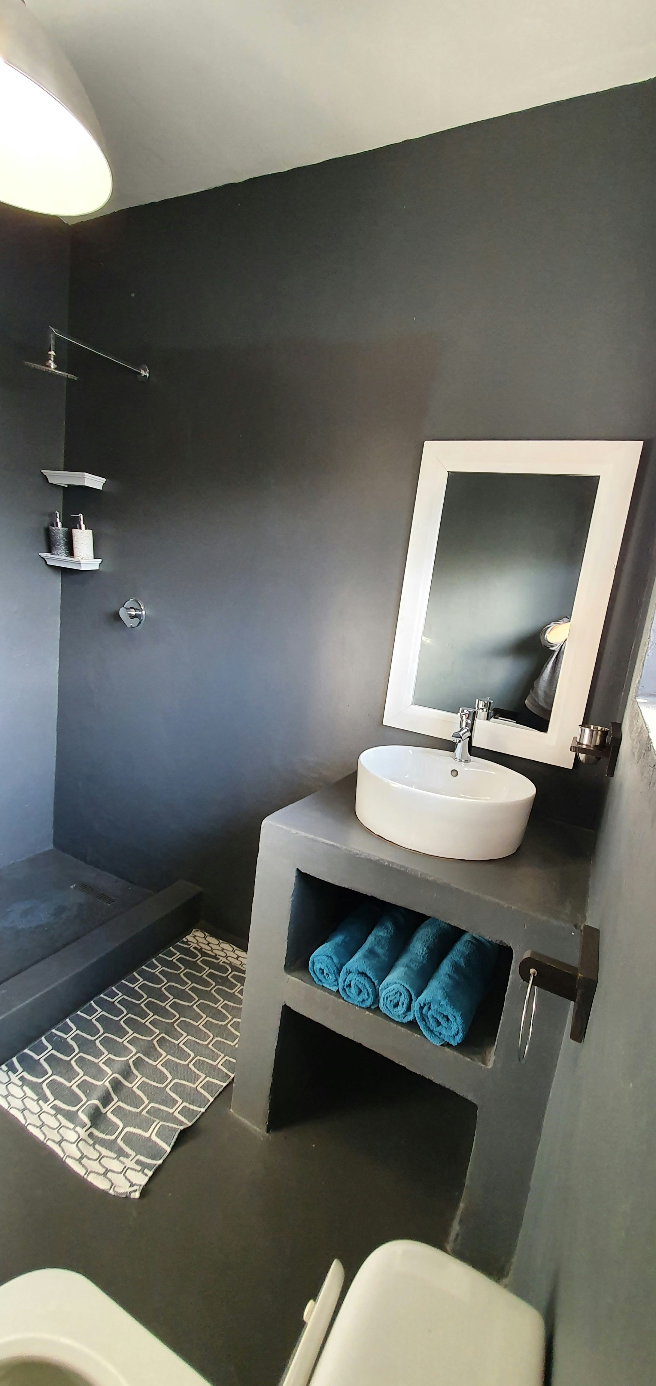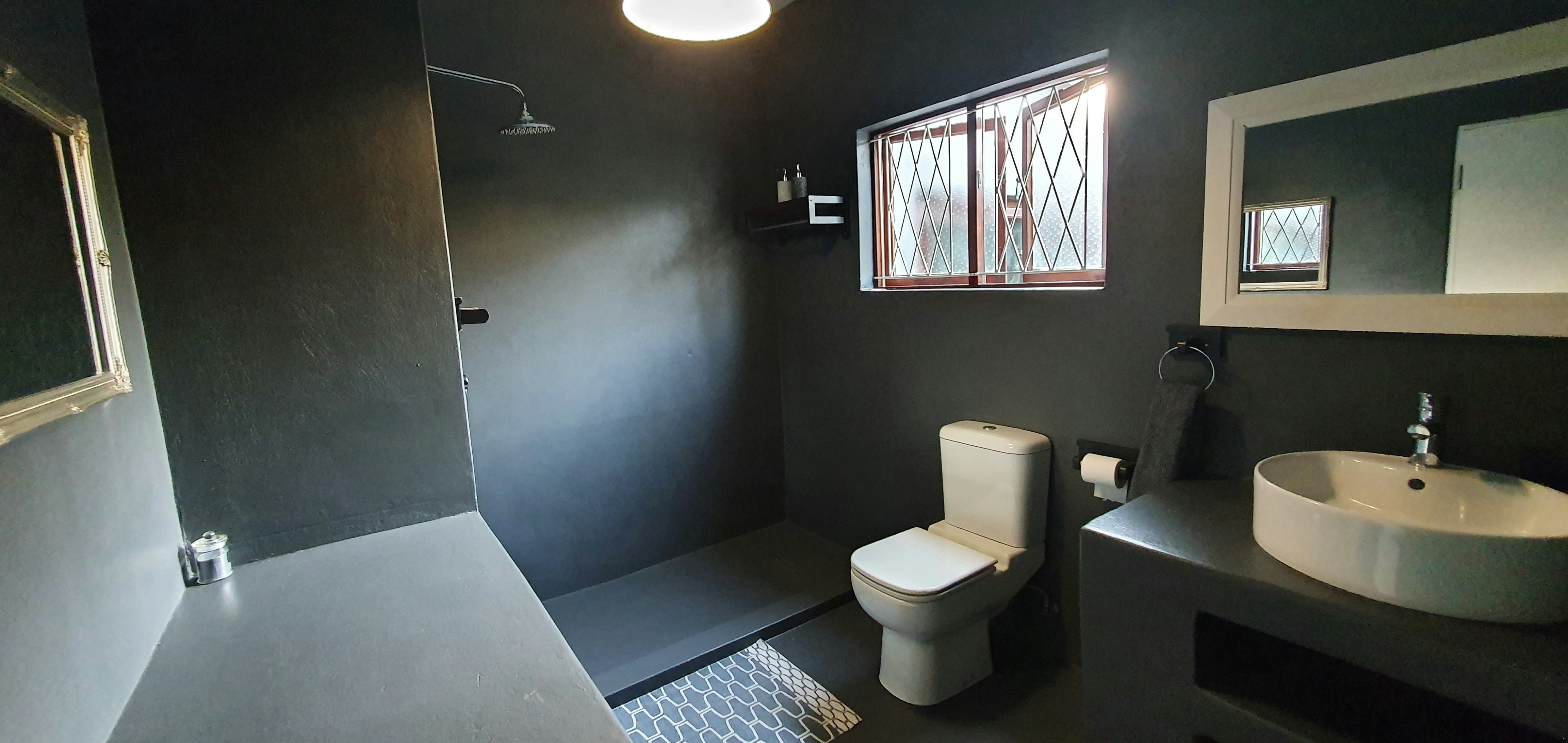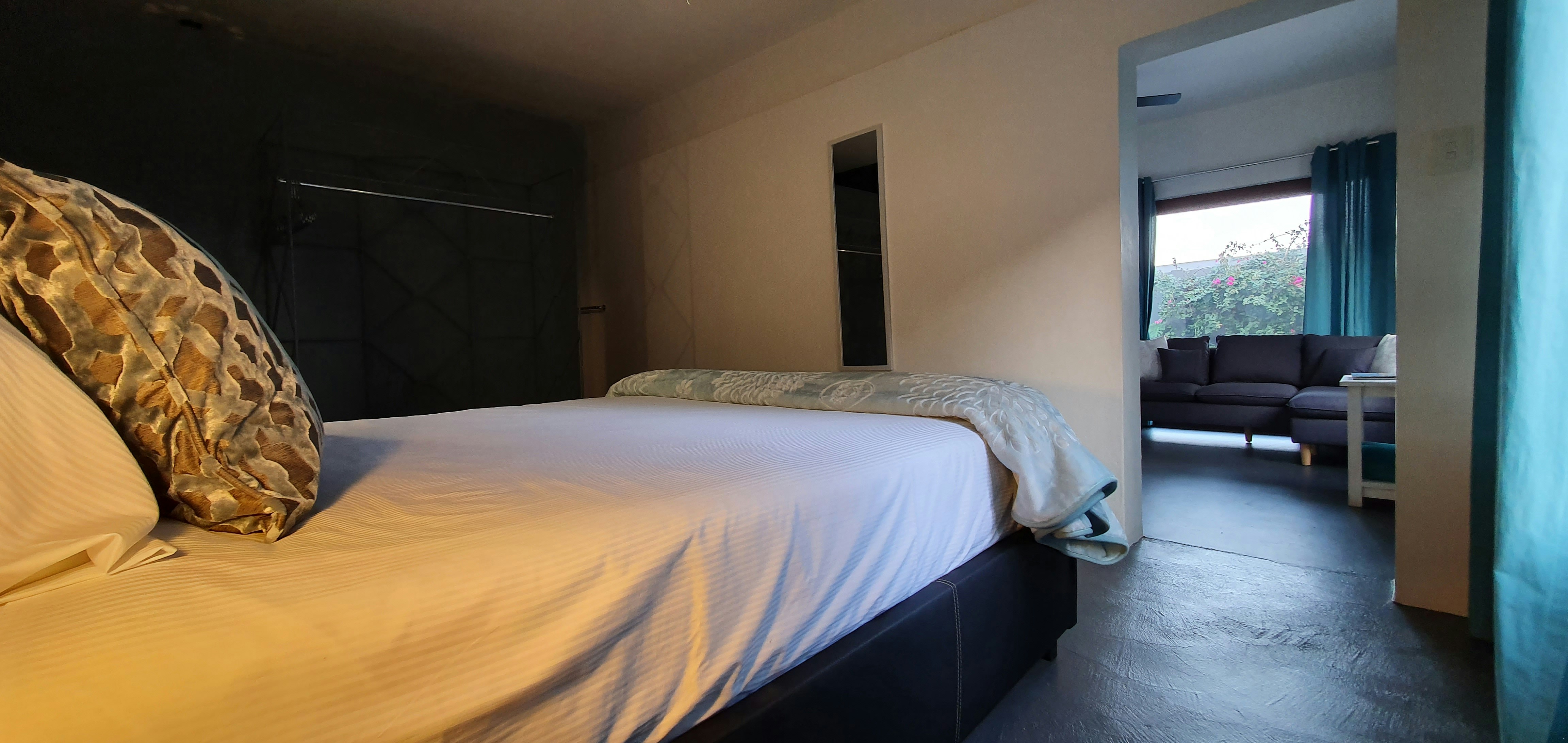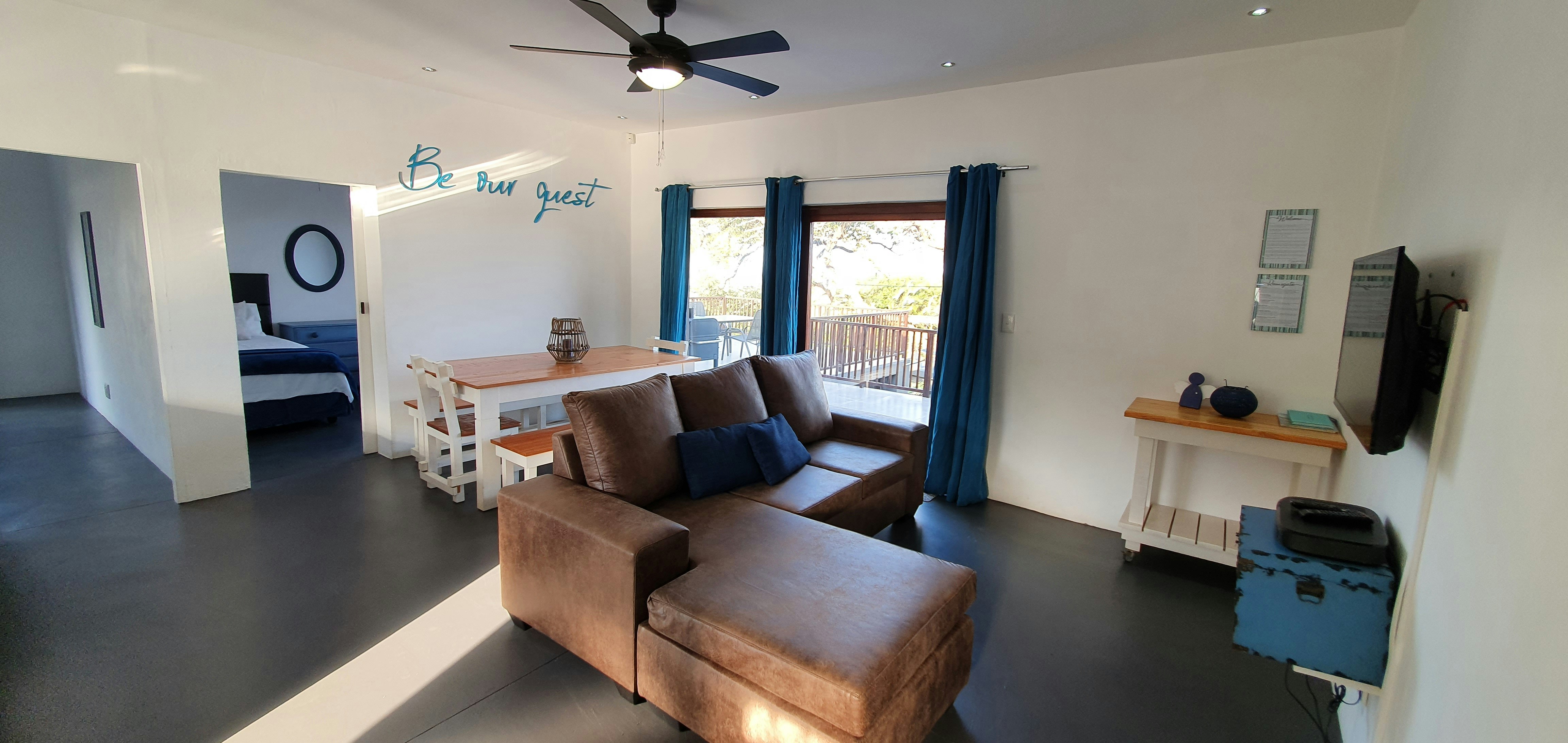 Die tweede eenslaapkamer-eenheid is op die grondverdieping en het 'n koningingrootte-bed en 'n badkamer met 'n stort wat rolstoelvriendelik is.