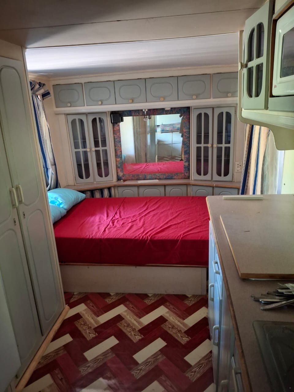 Die binnenshuise karavaan is ingerig met 2 dubbelbeddens. In die leefarea buite die karavaan is daar 'n addisionele dubbelbed asook 'n sitkamerstel. Die badkamer is toegerus met 'n stort, toilet en wasbak.