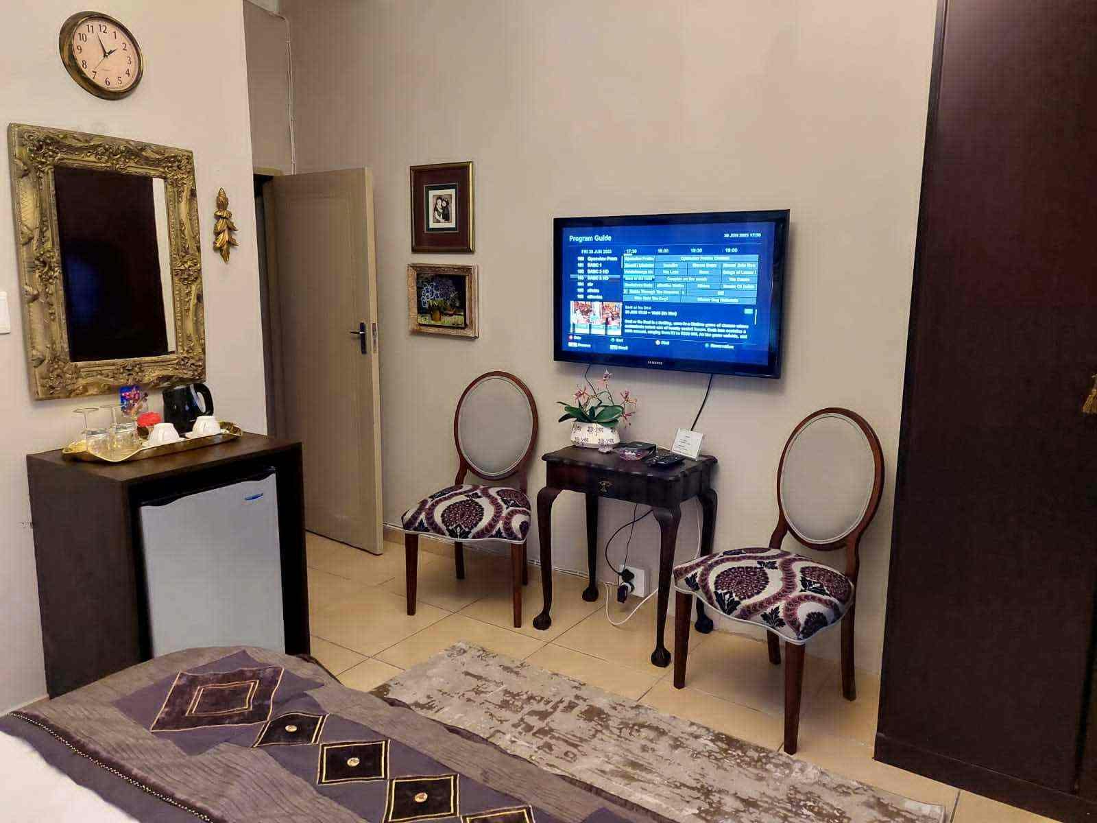 Die Amethyst-kamer is op die eerste verdieping van die hoofhuis en kyk uit oor die tuin. Die kamer het 'n koninggrootte-bed vir 2 gaste. Die badkamer is toegerus met 'n toilet, stort, bad en wasbak. Ander geriewe in die kamer sluit in 'n yskassie, 'n koffiekroeg, 'n TV met 'n Openview-dekodeerder en onbeperkte WiFi. Gaste het toegang tot 'n klein privaat balkon. Die kamer het 'n kluis, haardroër en grimeerspieël.