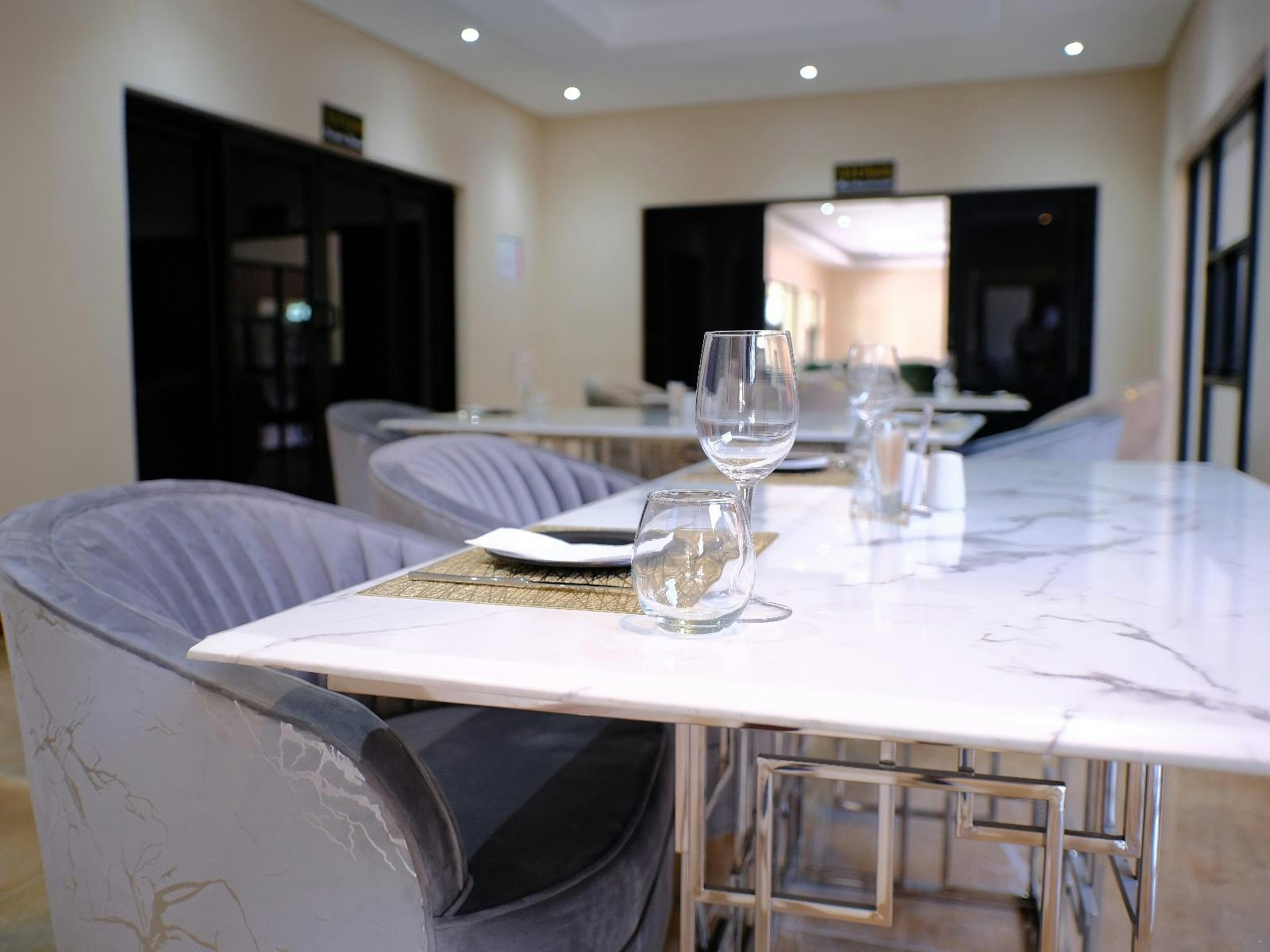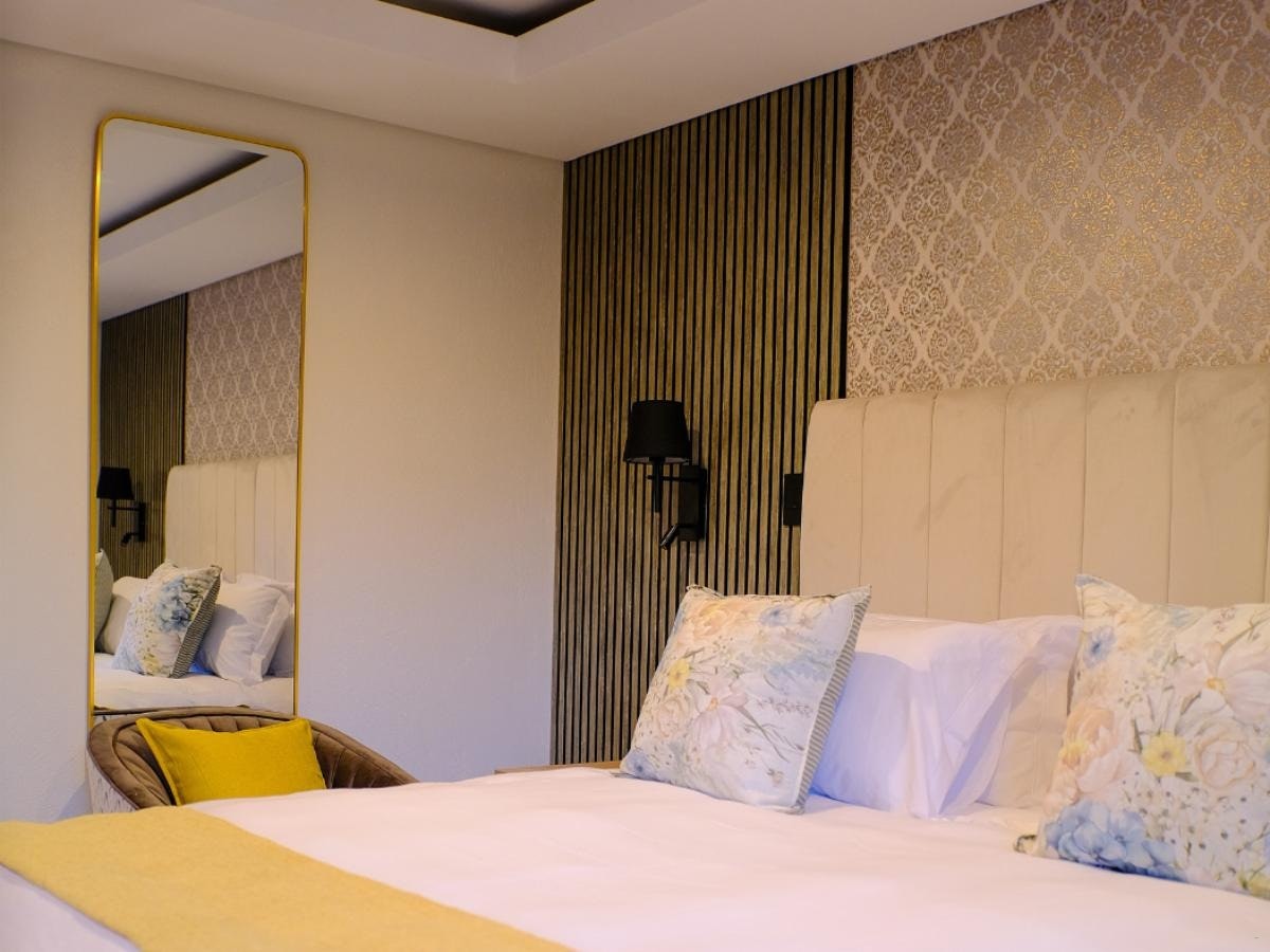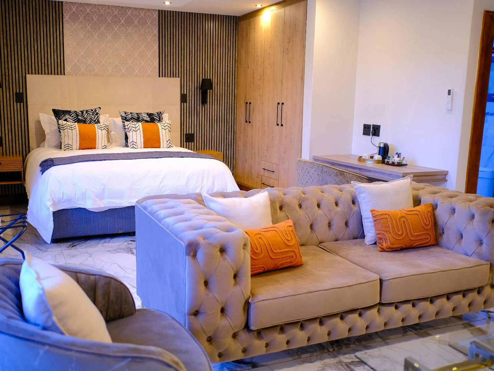 The hotel offers a variety of thoughtfully designed rooms, each accommodating two adults. Room options include Standard Rooms, Deluxe Suites, and the Luxury Penthouse. Standard Rooms combine comfort and elegance in a serene and inviting space. Each features a plush double bed with crisp white linen, air conditioning, a TV with DStv, and a bar fridge for added convenience. The Deluxe Suite is a spacious retreat designed for relaxation and style. It boasts a double bed, a separate lounge area, and an en-suite bathroom with either a bathtub/shower combo or a separate tub and shower for a rejuvenating stay. Enjoy luxury and exclusivity in the elegant first-floor Penthouse, featuring a double bed, a stylish lounge area, and an en-suite bathroom with a bathtub/shower combo or a separate tub and shower for ultimate comfort.