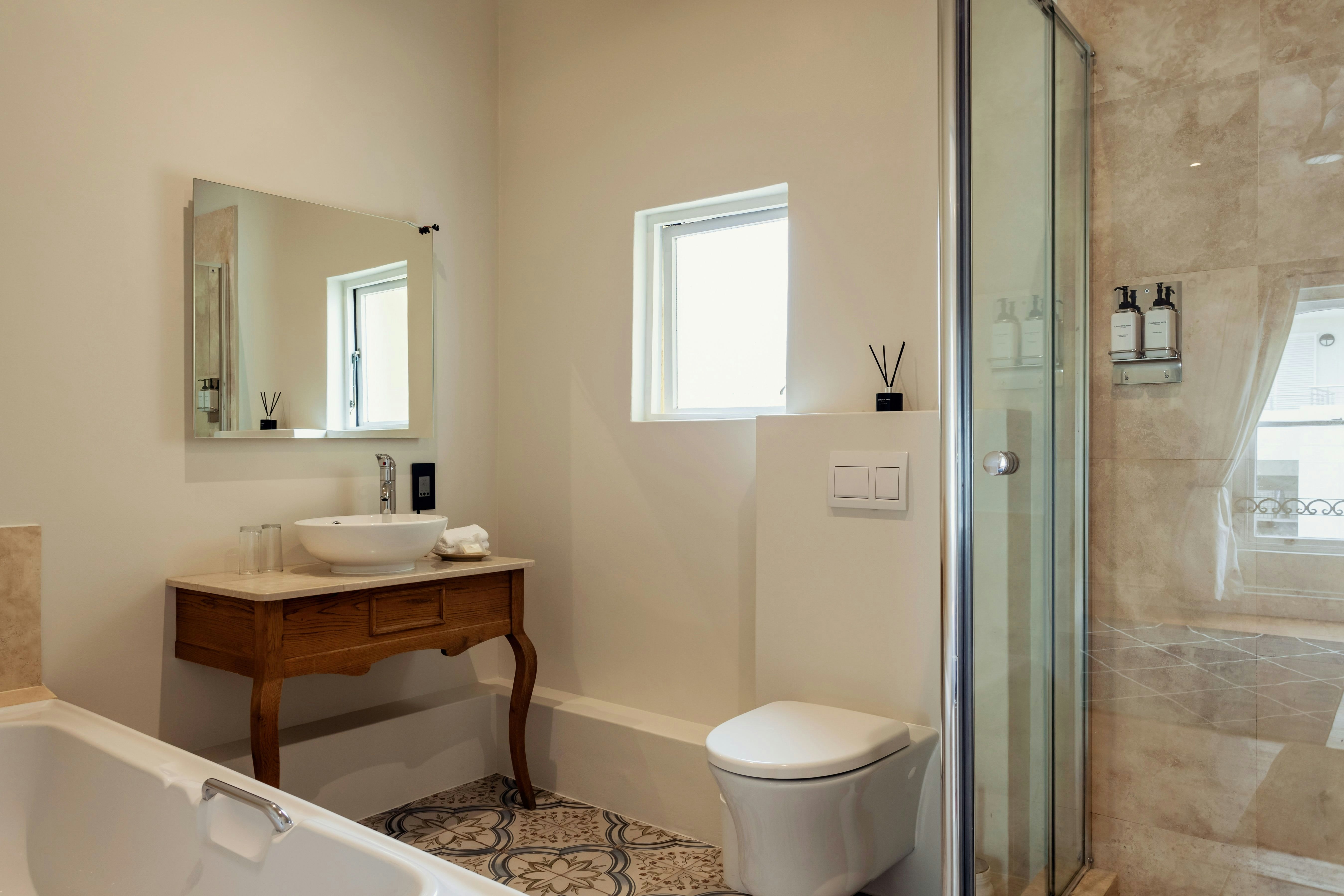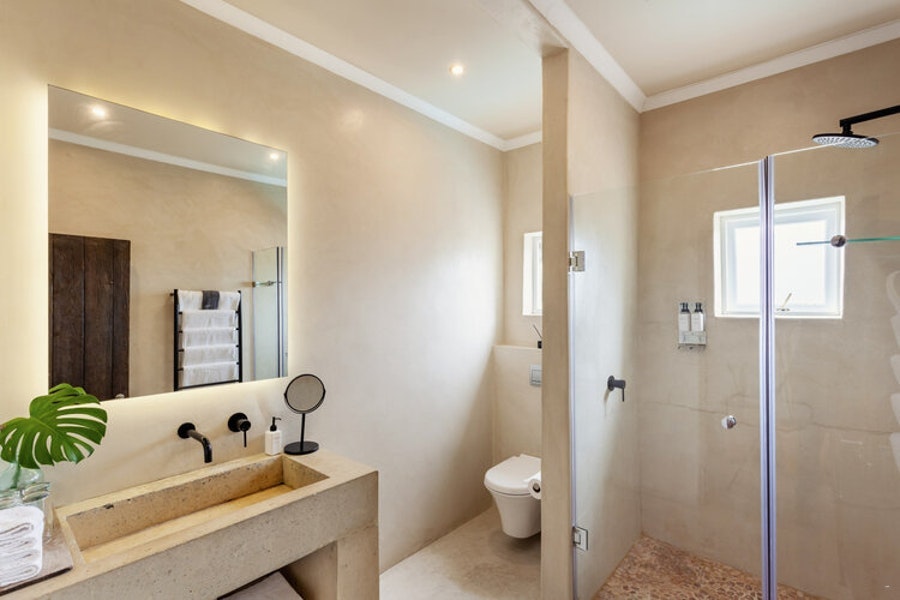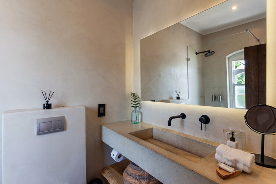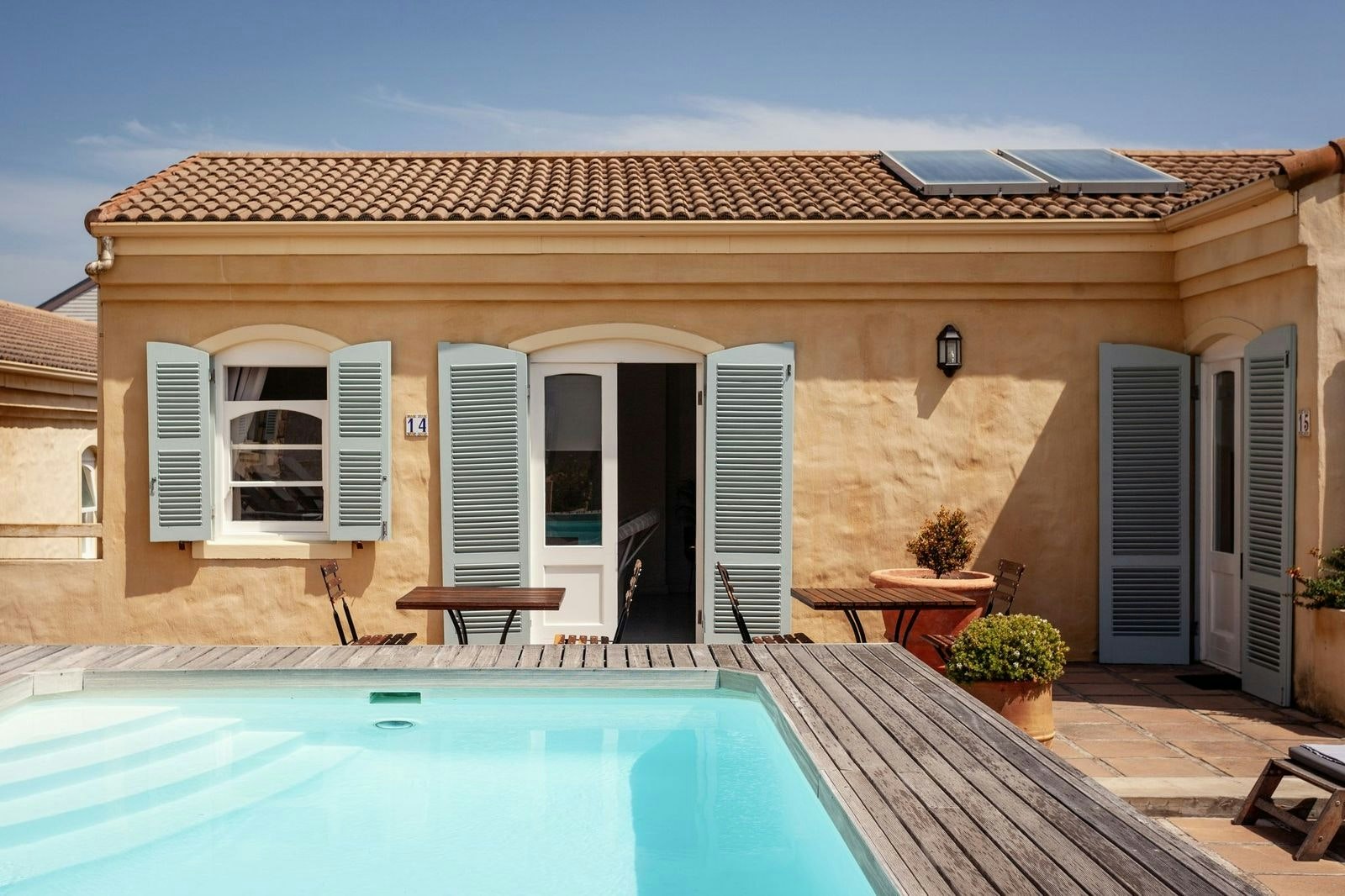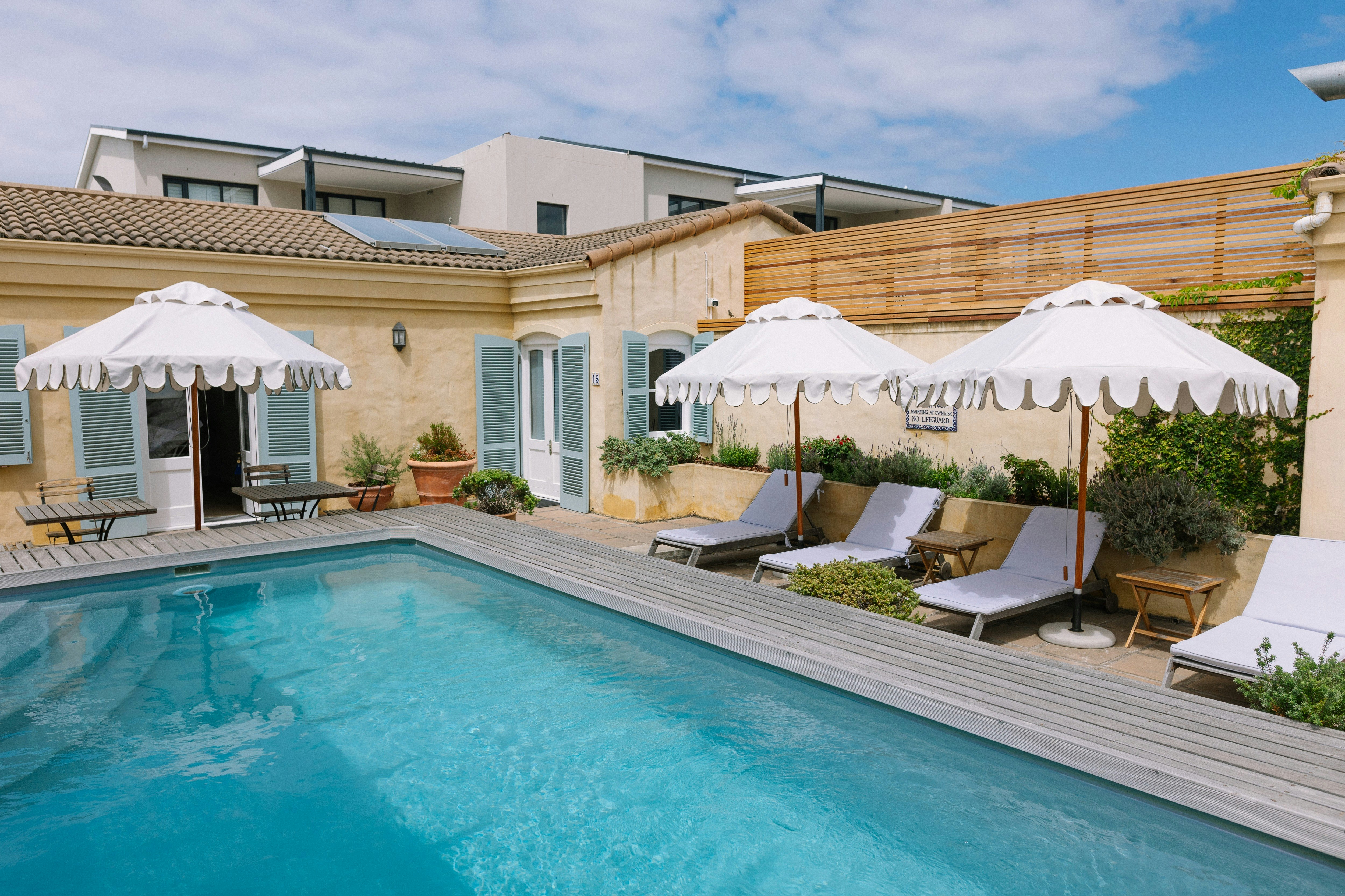 Gaste kan op sonstoele ontspan of in die sprankelende swembad afkoel.