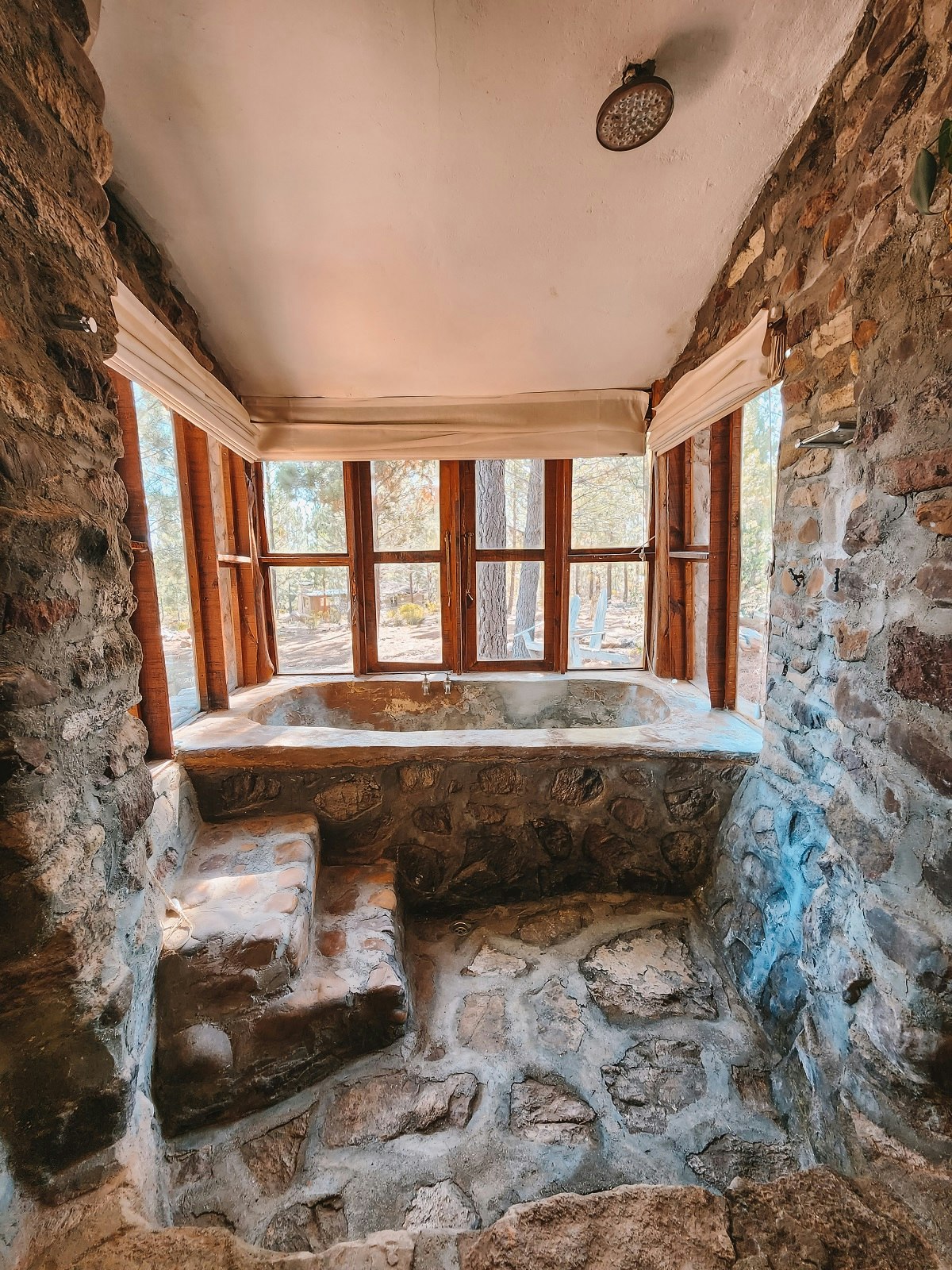 The wood-fired hot tub extends to the wooden deck with beautiful outdoor views, the perfect spot to enjoy a morning coffee, or a glass of wine during sunset. Guests are afforded parking next to the unit. There is also a communal swimming pool and a farm cat, Sebastian, who moves around freely.