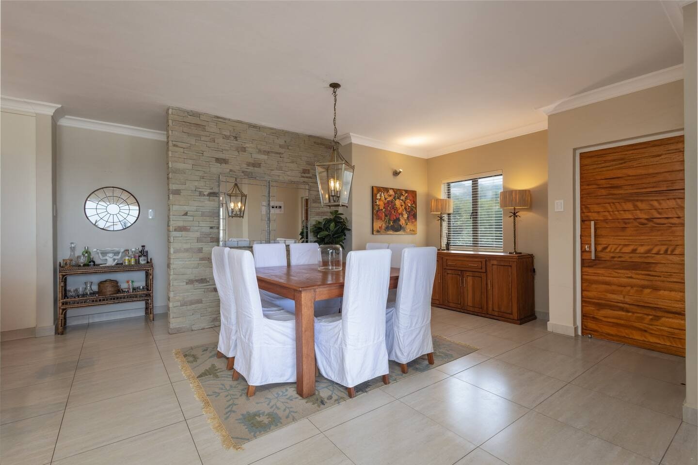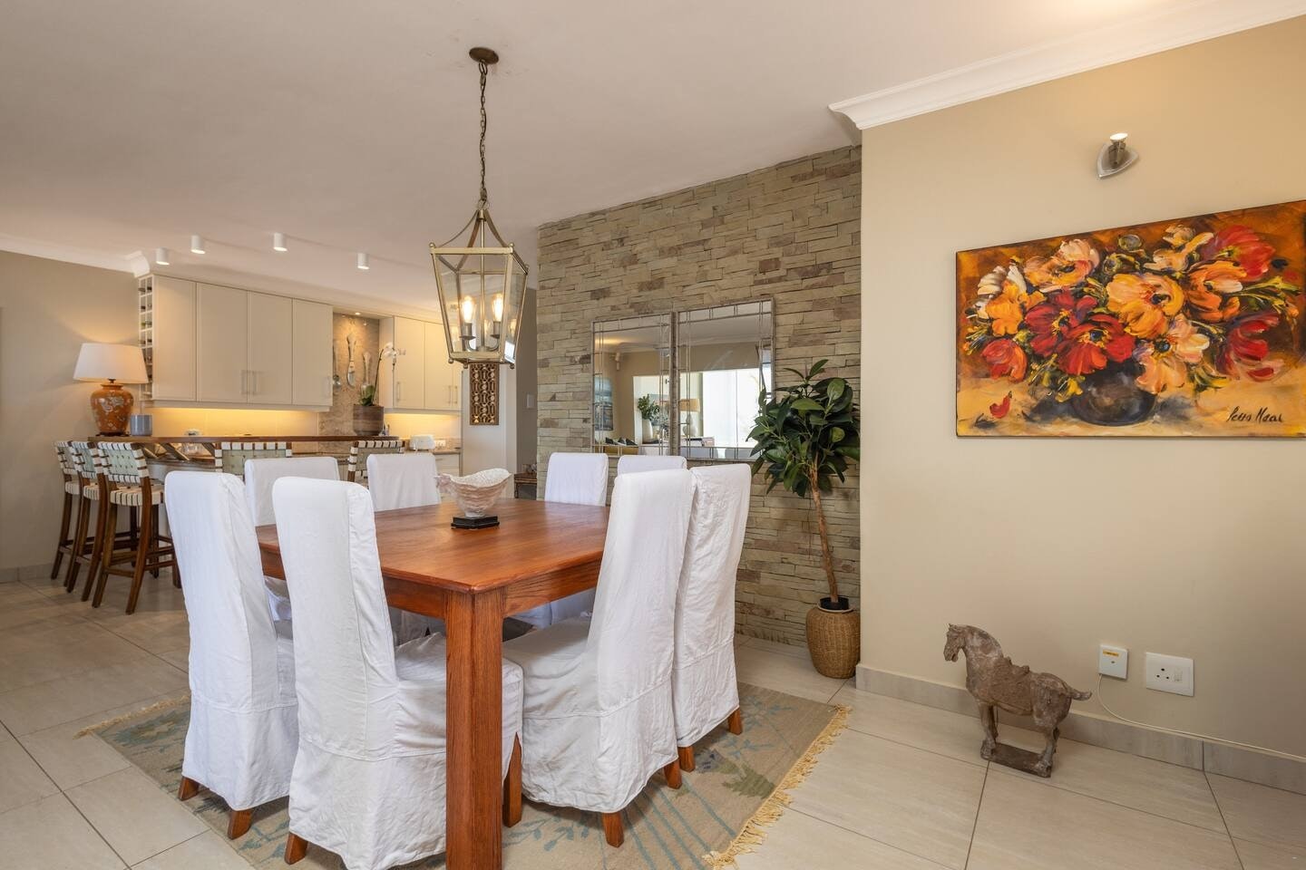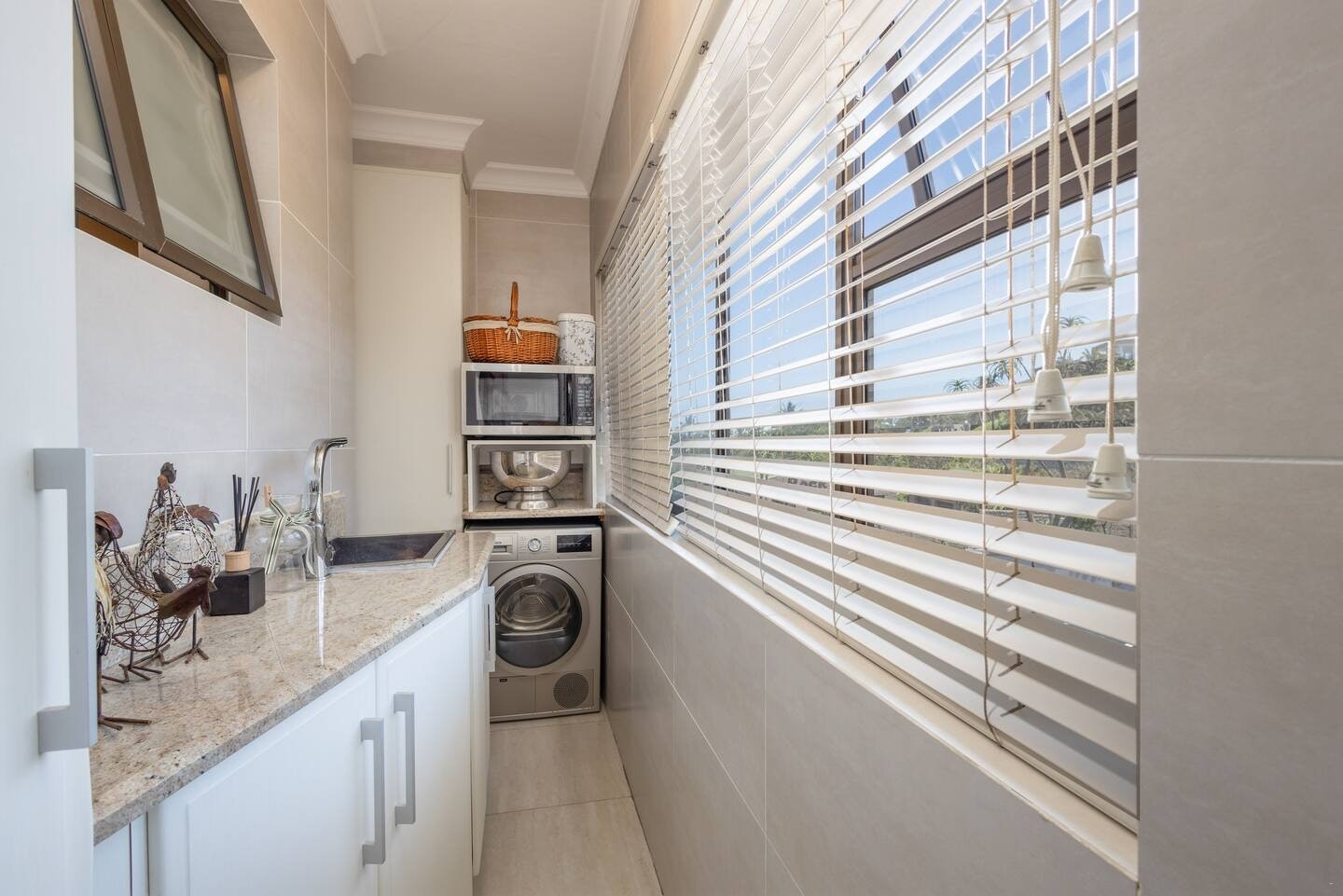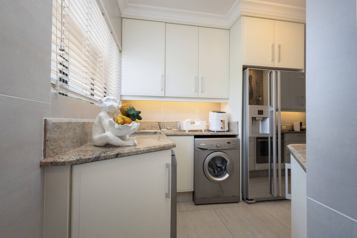 Die eenheid beskik oor 'n volledig toegeruste kombuis, insluitend 'n stoof, oond, lugbraaier, mikrogolf, ketel, broodrooster, yskas-vrieskas, skottelgoedwasser, wasmasjien, tuimeldroër en 'n ontbyttoonbank met stoele. Die sitkamer en eetarea bied gemaklike sitplek vir gaste om te eet en te ontspan en sluit ook 'n wynverkoeler in. Vir vermaak is 'n slim-TV en gratis WiFi beskikbaar.