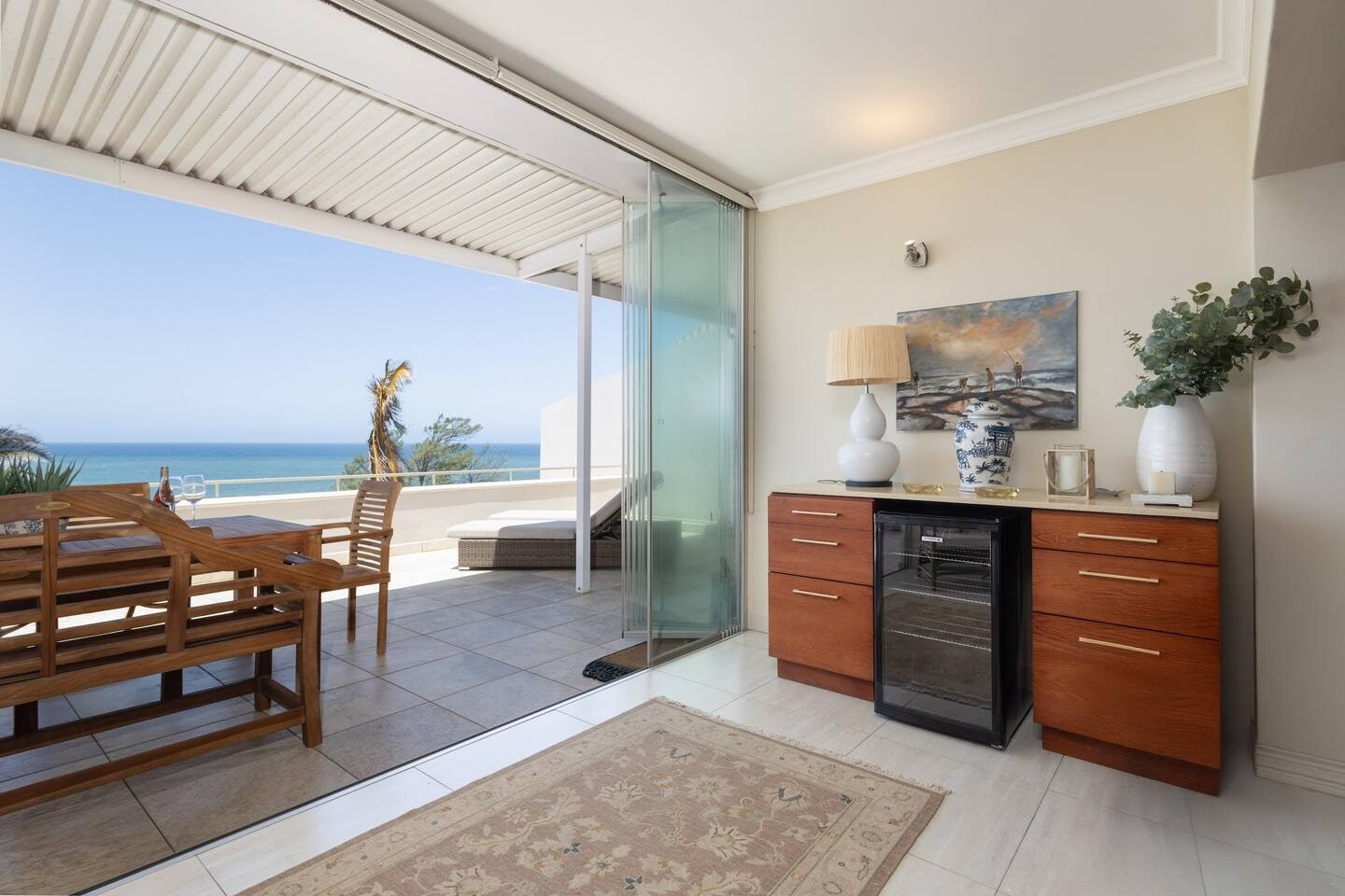 Die leefarea het glasstapeldeure wat na 'n ruim balkon met buitesitplek en 'n gasbraai oopmaak, waar gaste asemrowende see-uitsigte kan geniet. Gaste het ook toegang tot die gemeenskaplike swembad en braaigeriewe en word voorsien van veilige parkeerplek binne die kompleks.