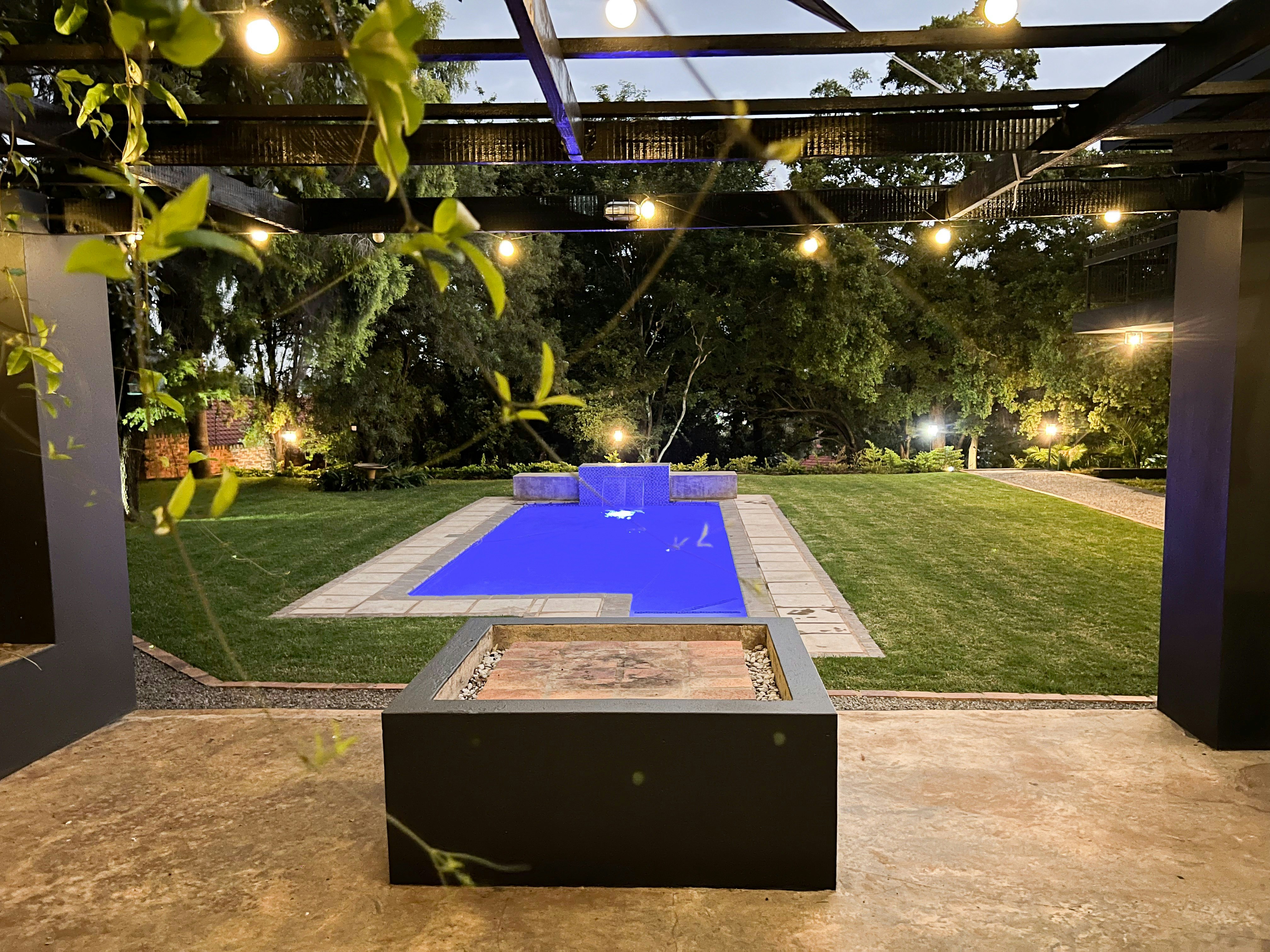 The glass-stack doors open to the shared swimming pool and the lovely lawn and the boma and fire-pit are only a few steps from the suite. Back-up lights are available in case of load shedding.