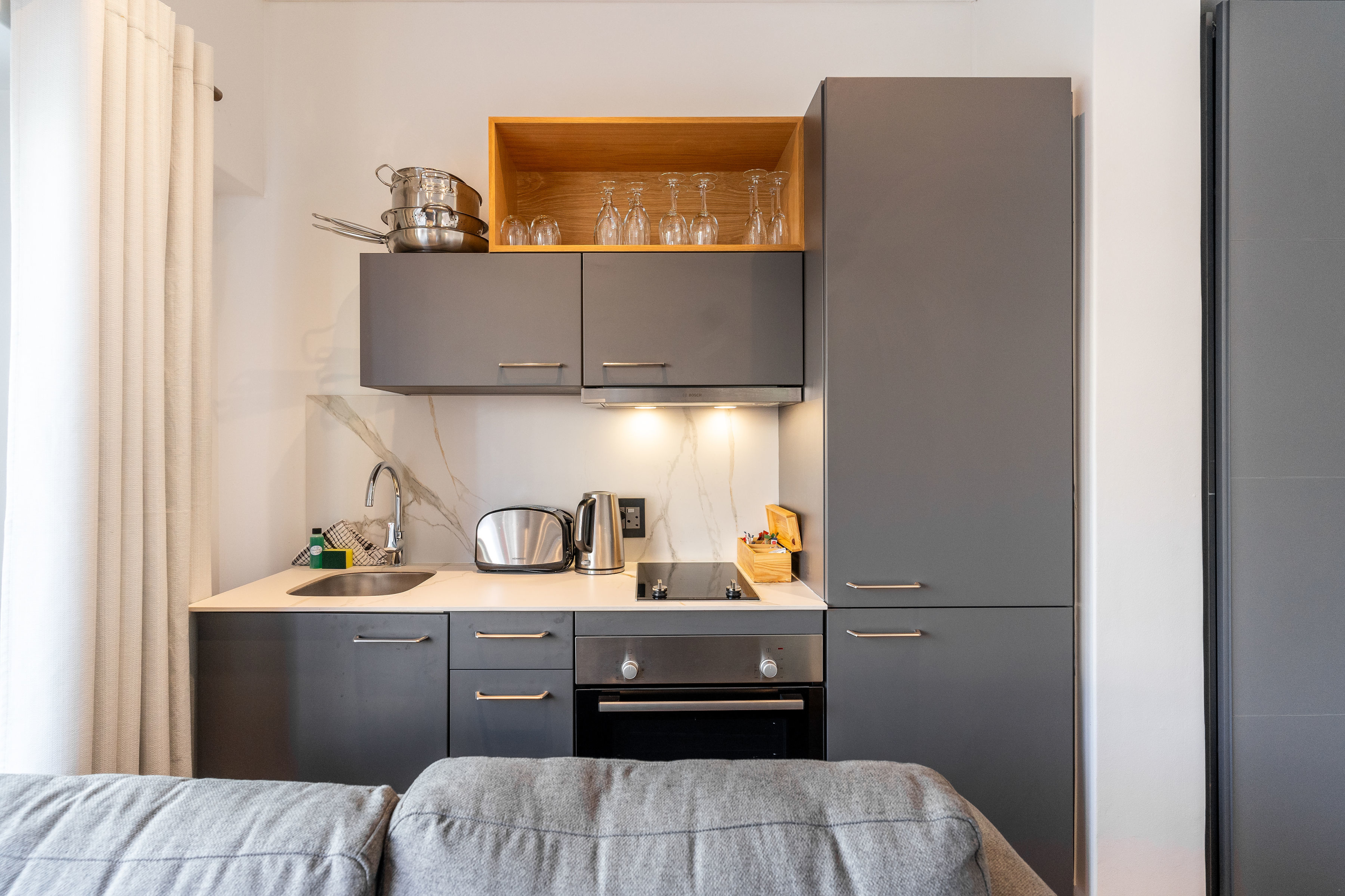 Die leefarea sluit gemaklike sitplek en 'n TV in, terwyl die volledig toegeruste kombuisie 'n yskas, stoof, oond en koffie- en teemaakgeriewe bied. Gaste kan ook op die privaat balkon ontspan en die skilderagtige uitsigte oor die stad en berge geniet.