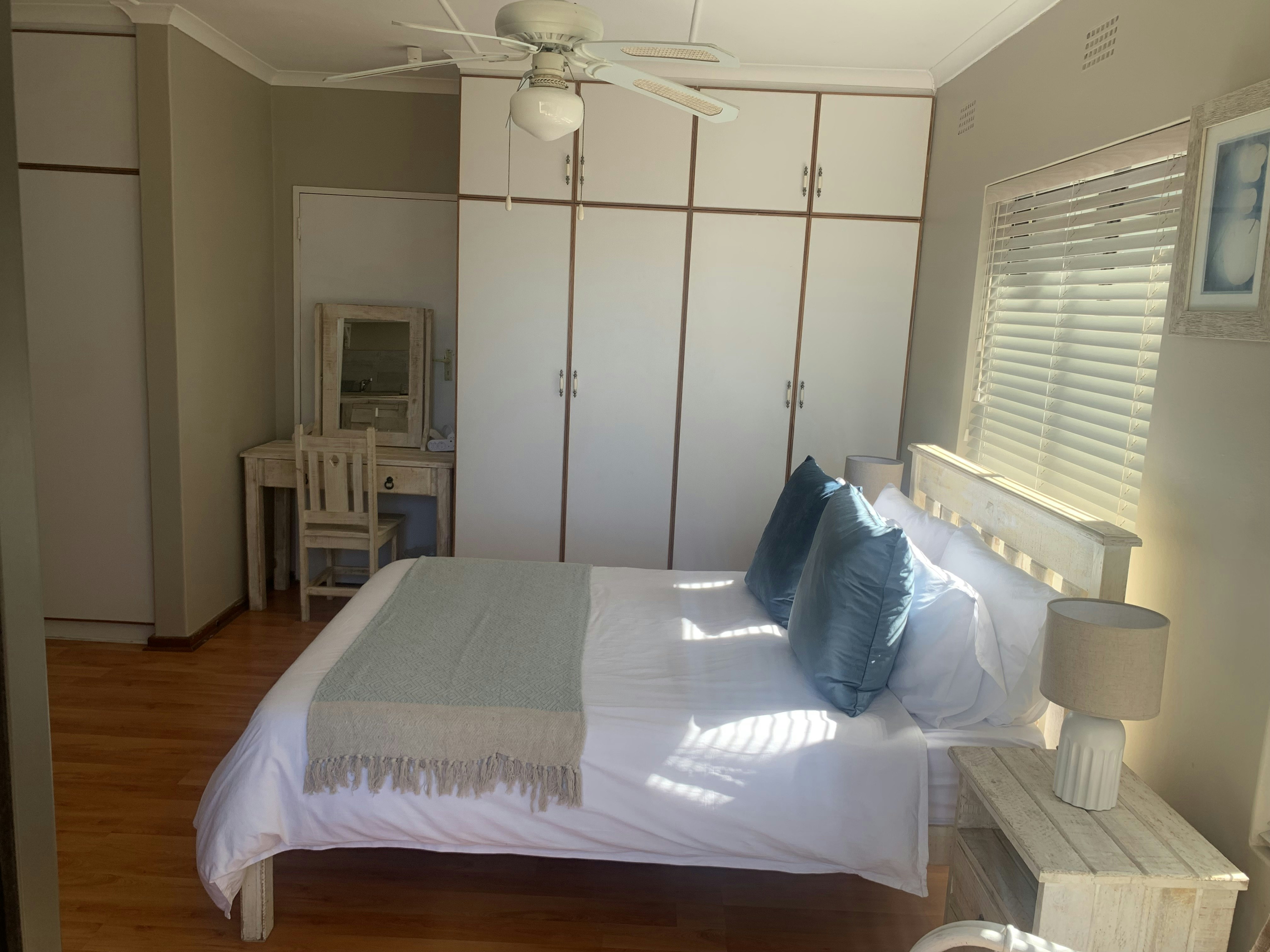 Hierdie woonstel vir 4 gaste beskik oor 2 slaapkamers, 'n badkamer en 'n oopplan-kombuis. Die hoofslaapkamer het 'n dubbelbed en daar is 2 enkelbeddens in die tweede slaapkamer. Die kamers deel 'n en suite-badkamer wat 'n stort het. Linne word voorsien, maar gaste moet asb. hul eie bad- en swemhanddoeke saambring. Die kombuis is met 'n tweeplaatstofie en 'n oond, 'n mikrogolf, yskas en tee- en koffiemaakgeriewe toegerus en gaste kan hul maaltye by die etenstafel geniet. WiFi en 'n TV met 'n vol DStv-pakket is beskikbaar. Die eenheid het ook 'n eenplaat-gasstofie en die ketel, ligte en WiFi word nie tydens beurtkrag beïnvloed nie. Daar is veilige parkeerplek en braaigeriewe vir gaste se gebruik.