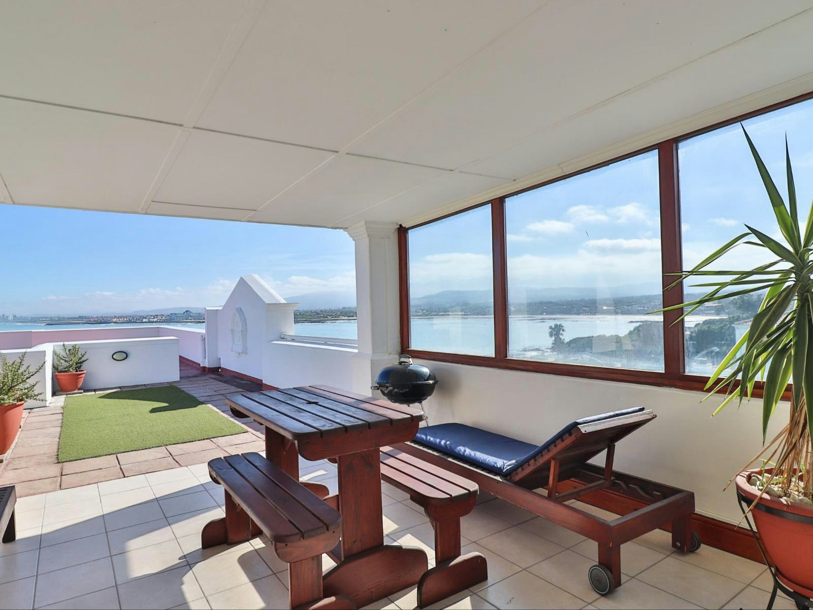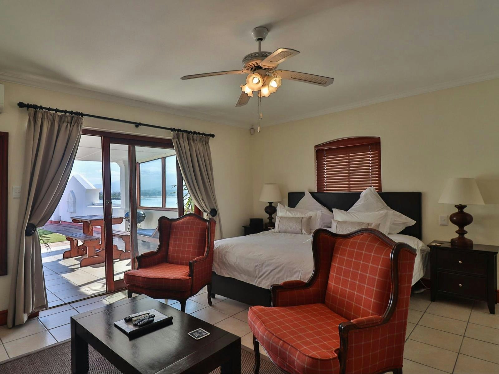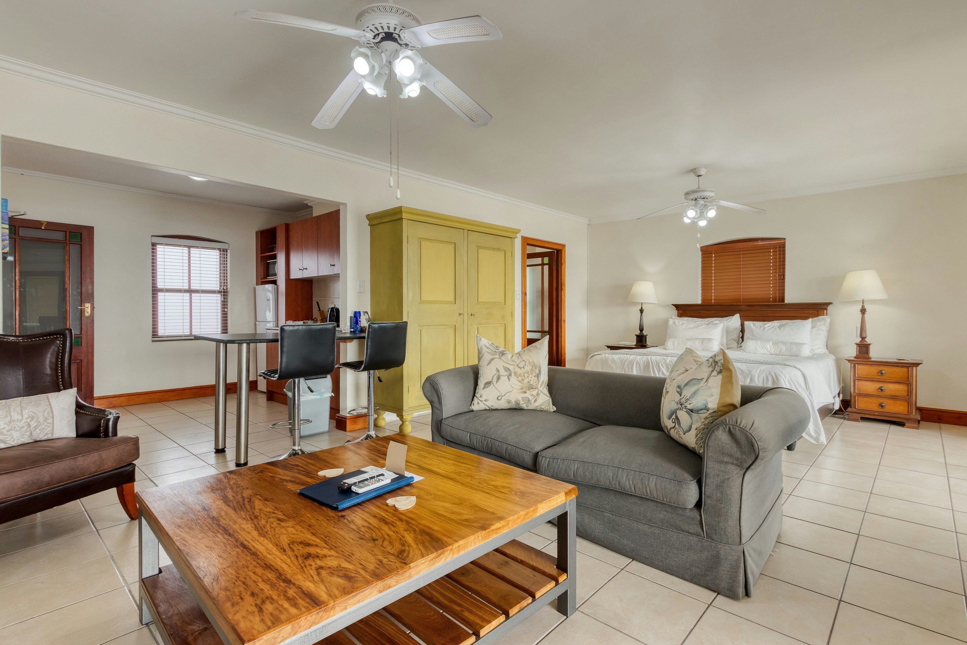 This junior penthouse suite is situated on the top floor of the guesthouse, offering 360-degree views from a large covered patio. The suite features a king-size bed and an en-suite bathroom with both a bath and a shower. Amenities include air-conditioning, a flat-screen TV with selected DStv channels, a kitchenette, and a private braai, making it perfect for a luxurious and relaxing stay.
