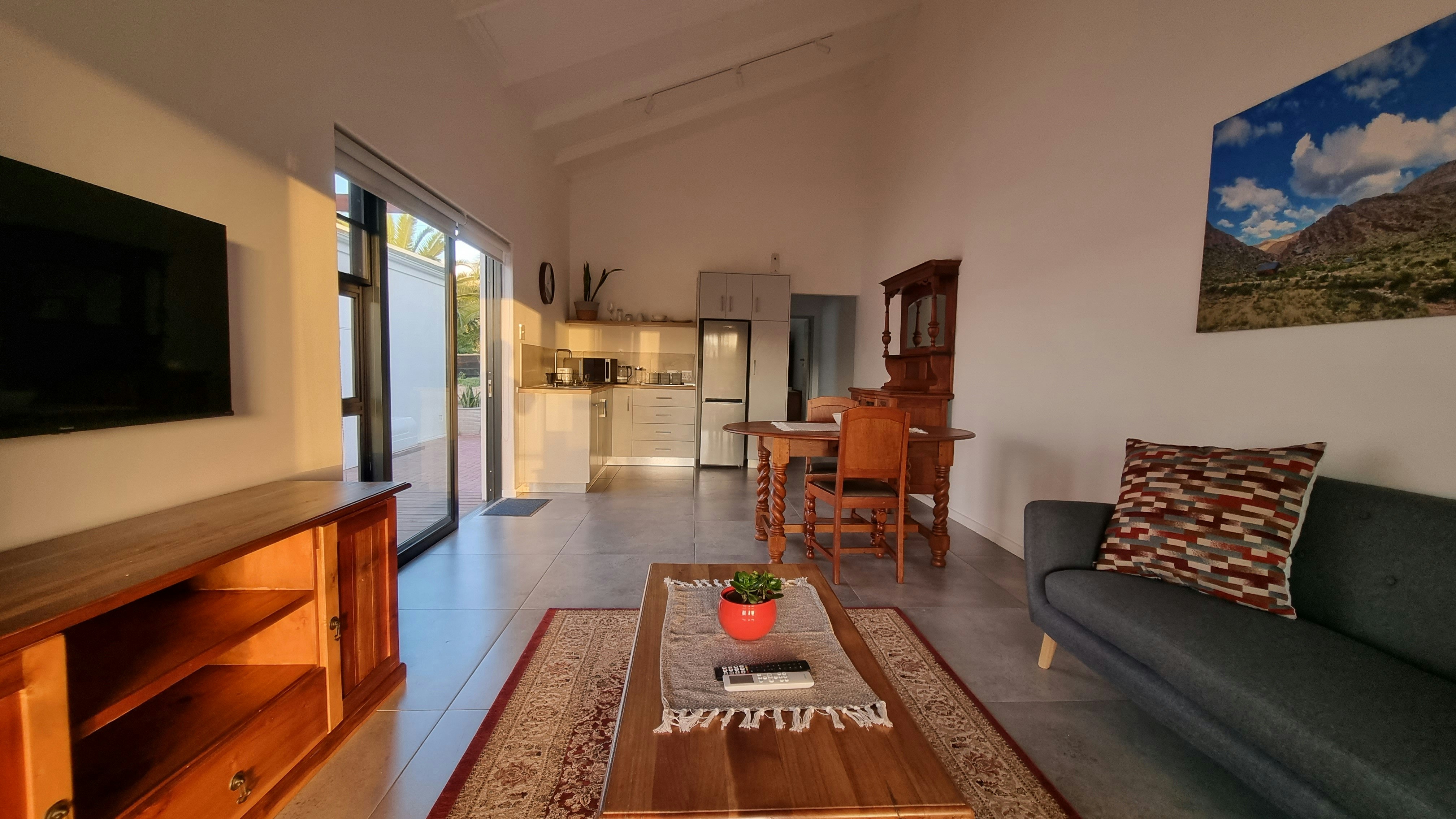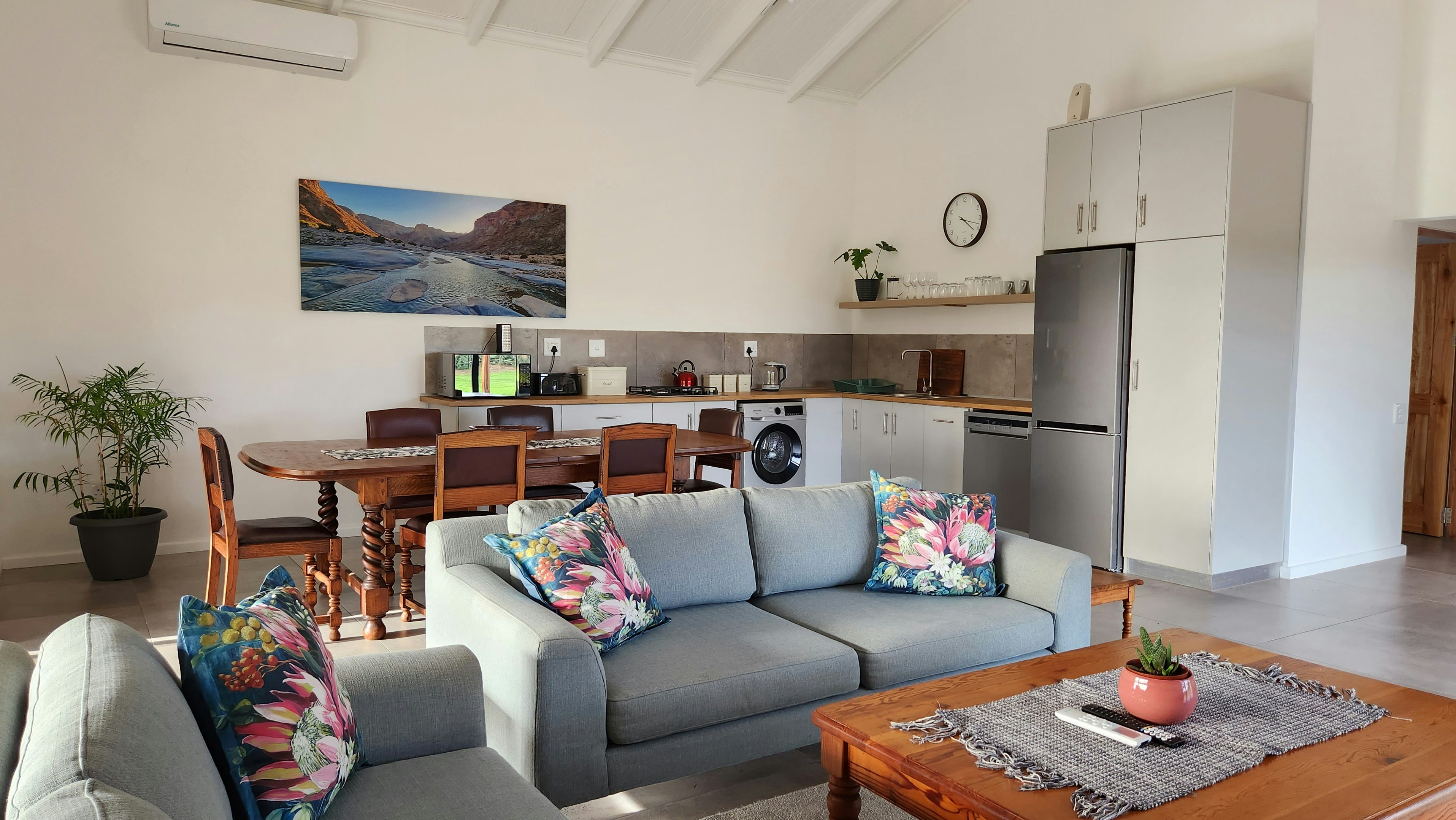 Die Leeu comprises 3 bedrooms, a spare room, 2 bathrooms, a living area, and an open-plan kitchen and a dining area. Each of the 3 larger bedrooms are furnished with a king-size bed, which can be converted into 2 single beds. The fourth bedroom (spare room) is furnished with 2 single beds. Both bathrooms are fitted with a toilet, basin and shower. This cottage offers views of the mountains and has a private garden.