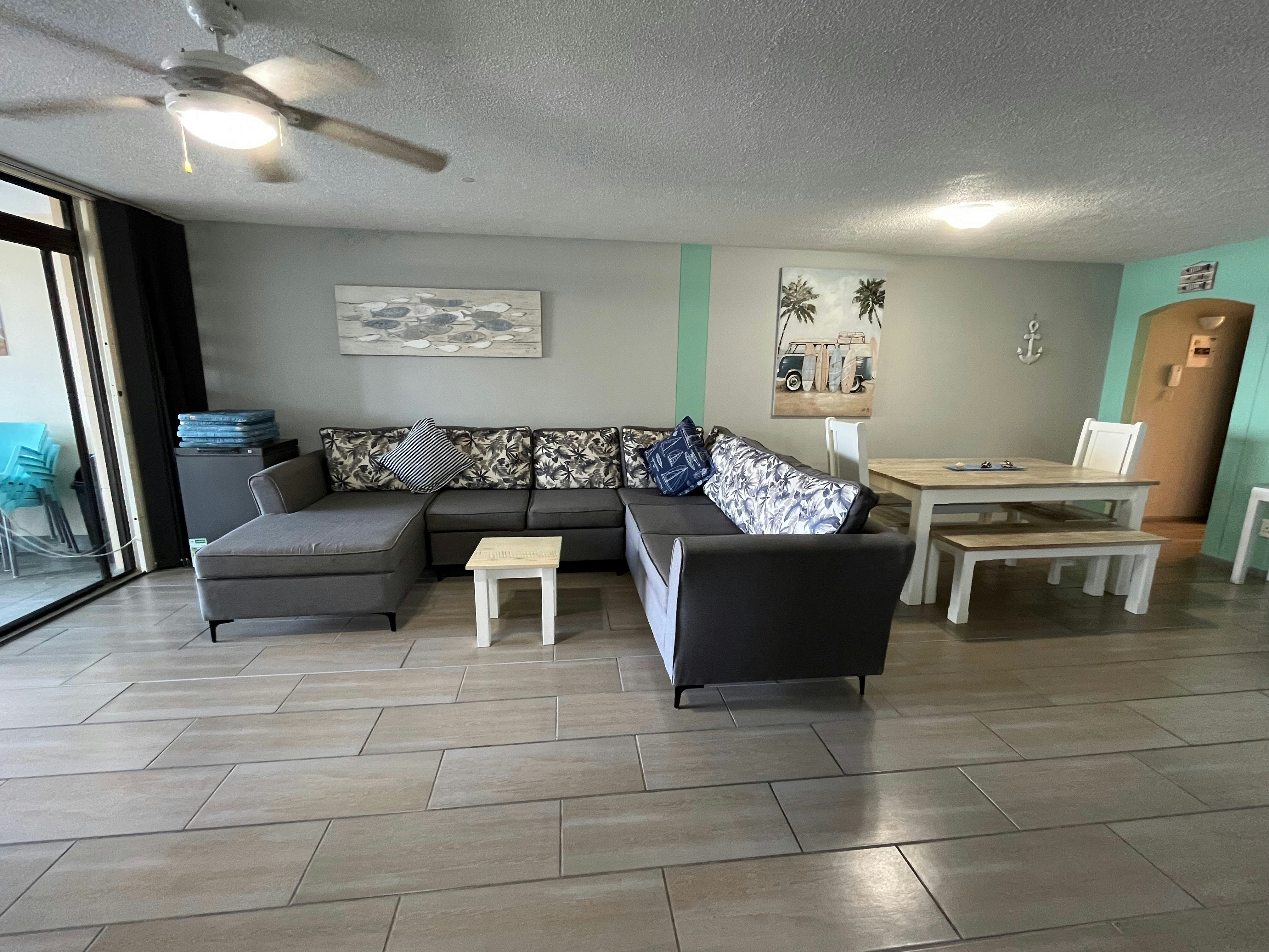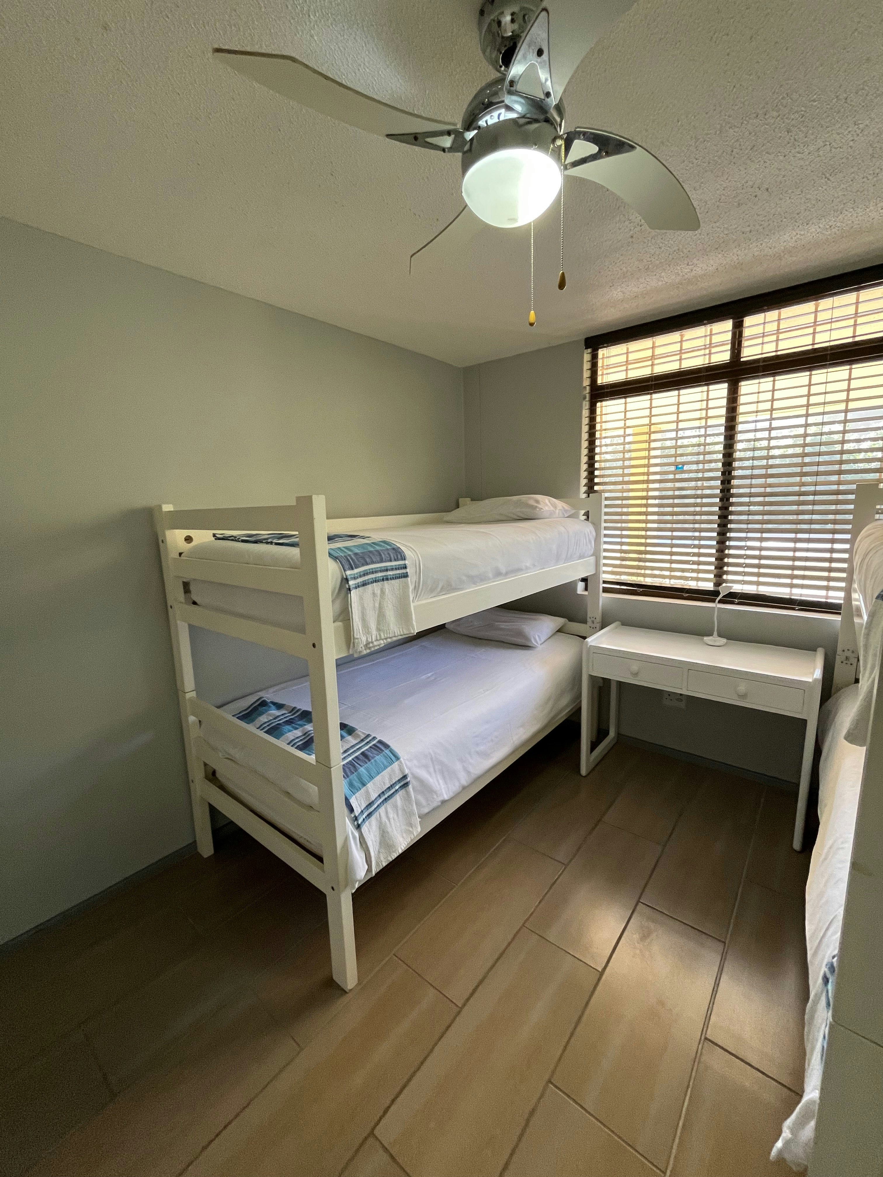 This unit can accommodate up to 8 guests and comprises 3 bedrooms and 2 bathrooms. The first bedroom is comfortably furnished with a king-size bed and features an en-suite bathroom fitted with a bath. The second bedroom has a double bed, while the third bedroom contains 2 bunk beds. These bedrooms share the use of the second bathroom, which is fitted with a shower. Linen is provided; however, guests are required to bring their own bath and swimming towels.