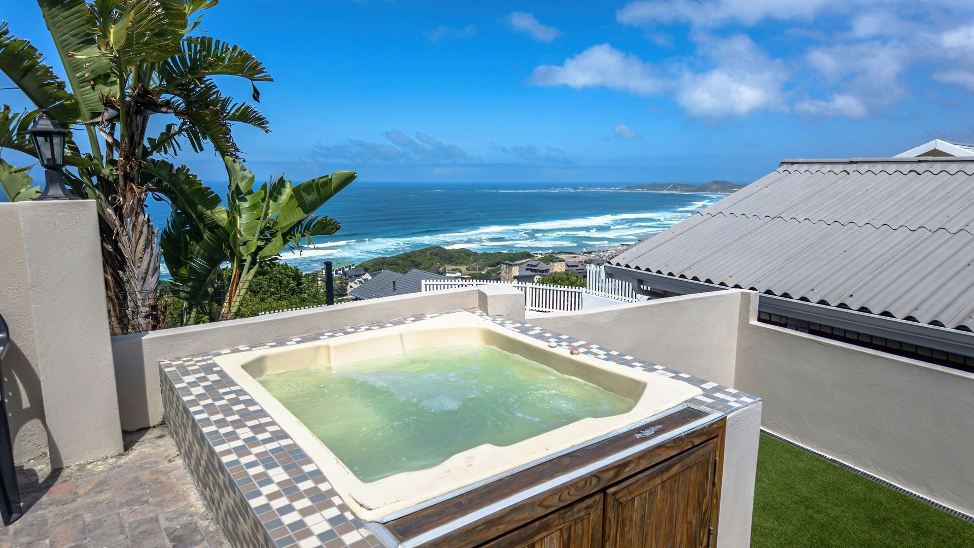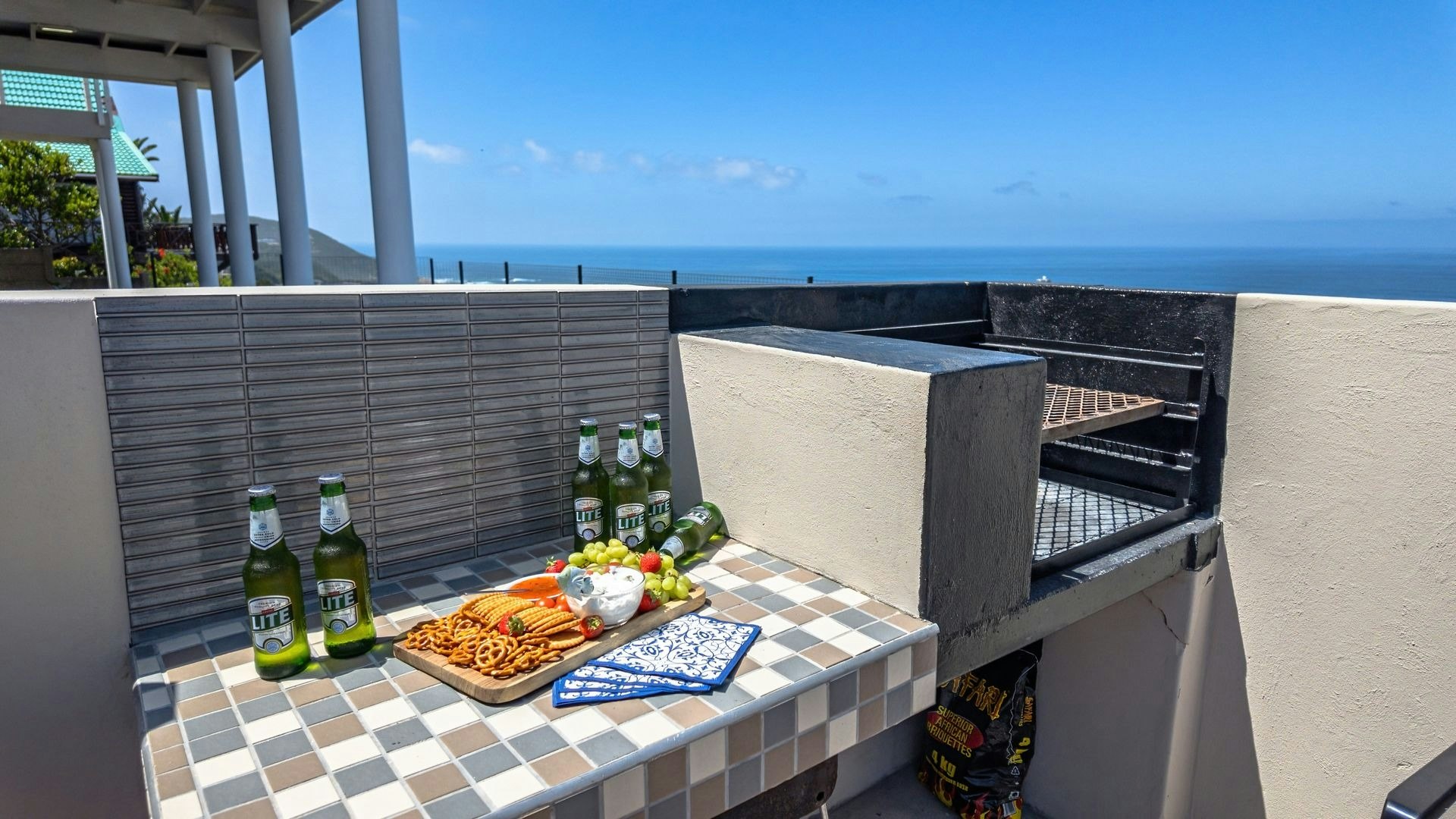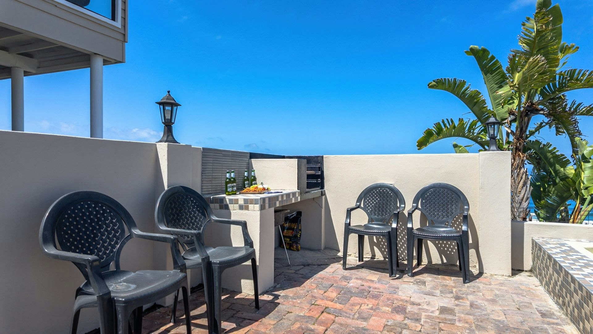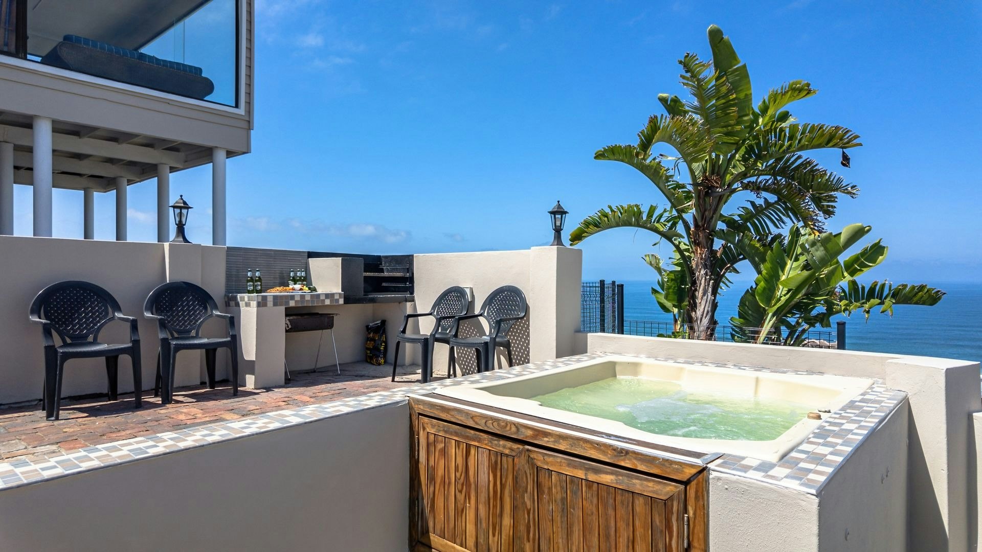 Langs die sitkamer is 'n lieflike sitarea met glasvensters wat 'n goeie opsie is vir 'n oggendkoffie terwyl jy die blou see-uitsigte bewonder. Buite is 'n sonnige patio met braaigeriewe en 'n jacuzzi.