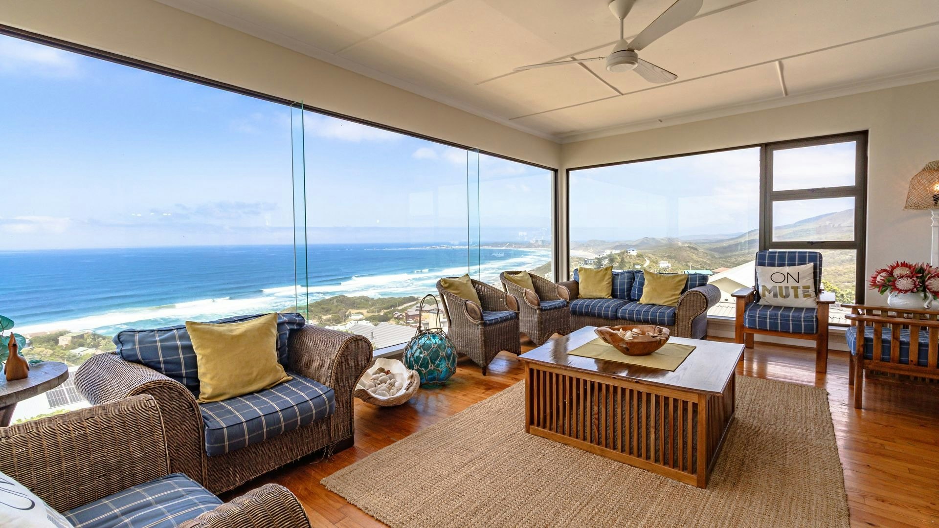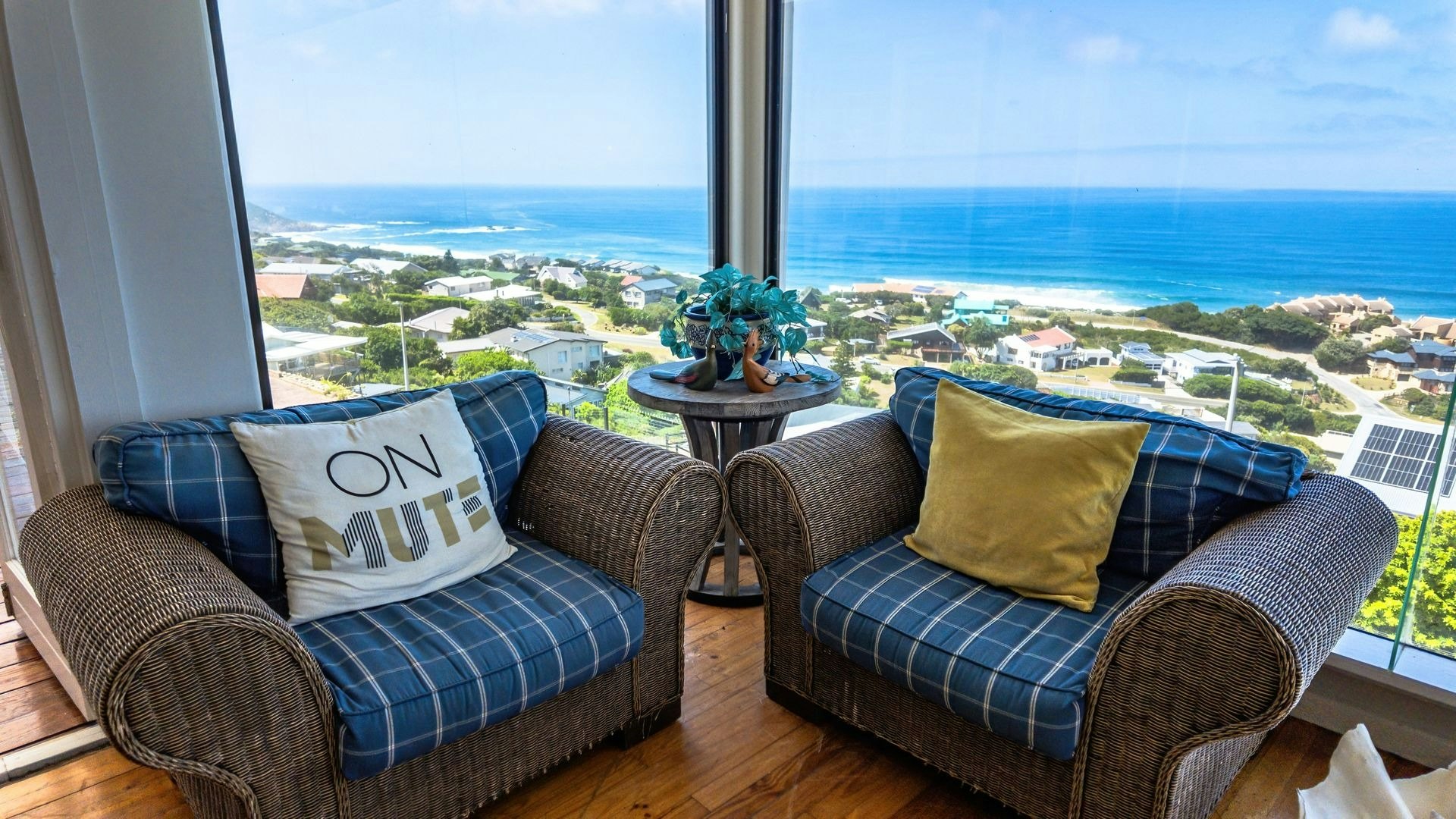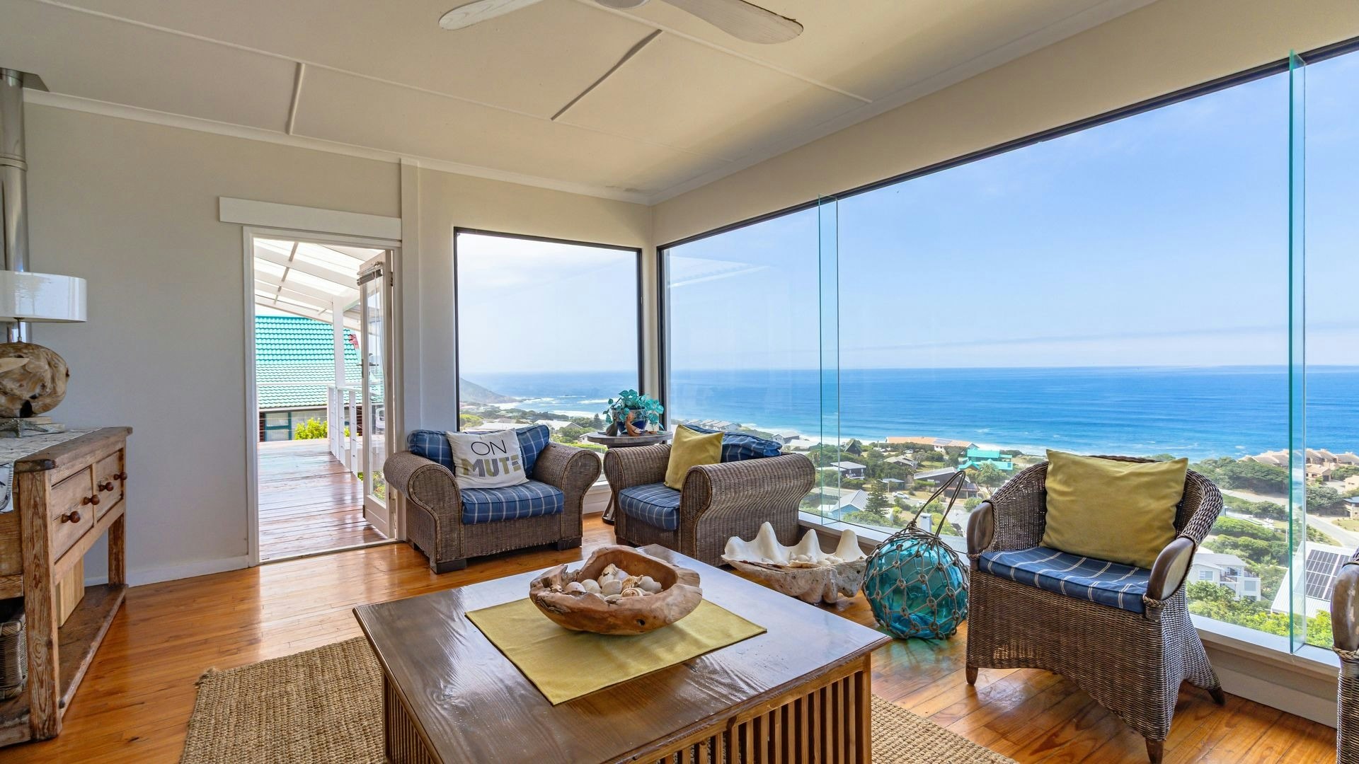 Langs die sitkamer is 'n lieflike sitarea met glasvensters wat 'n goeie opsie is vir 'n oggendkoffie terwyl jy die blou see-uitsigte bewonder. Buite is 'n sonnige patio met braaigeriewe en 'n jacuzzi.