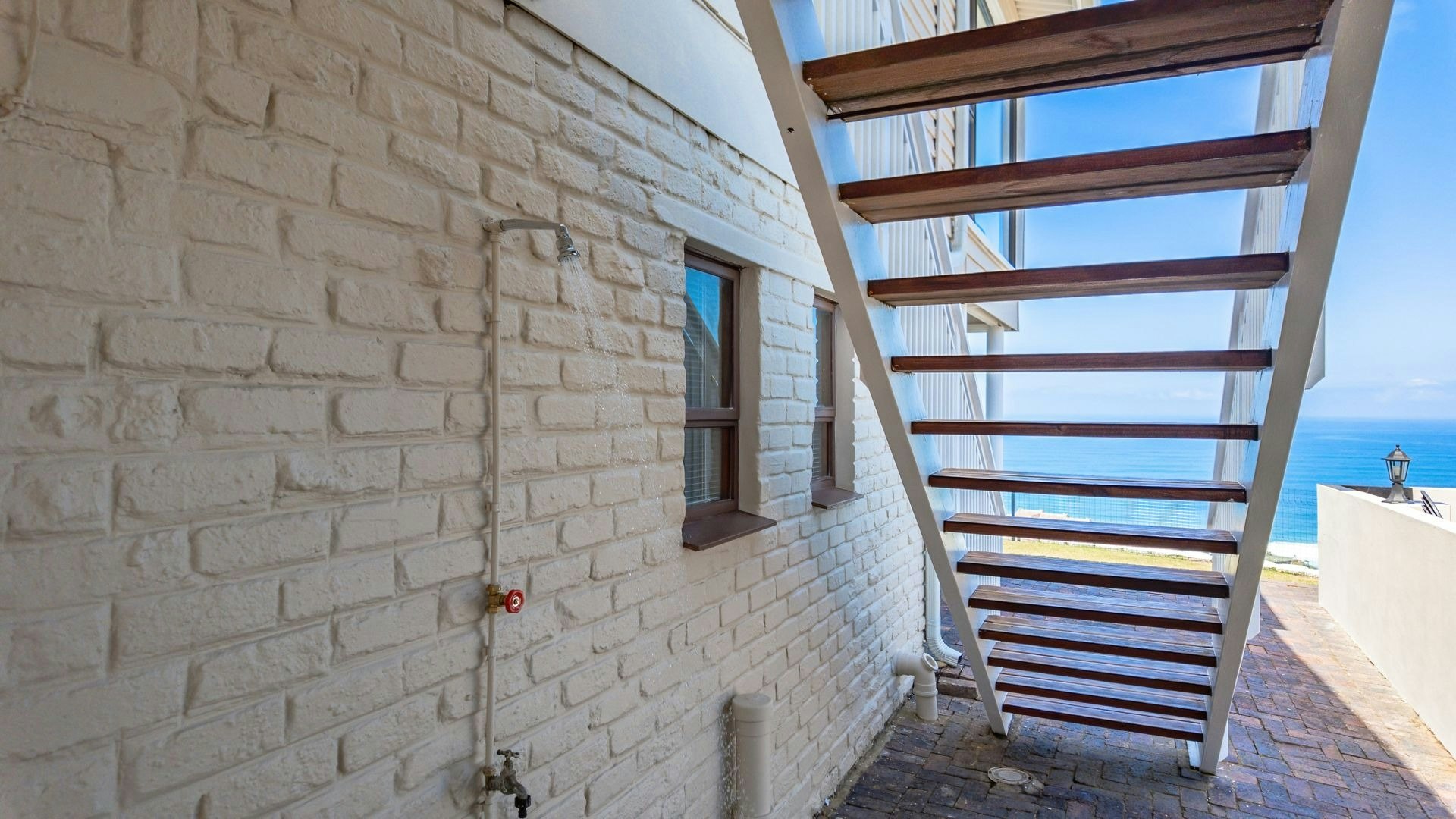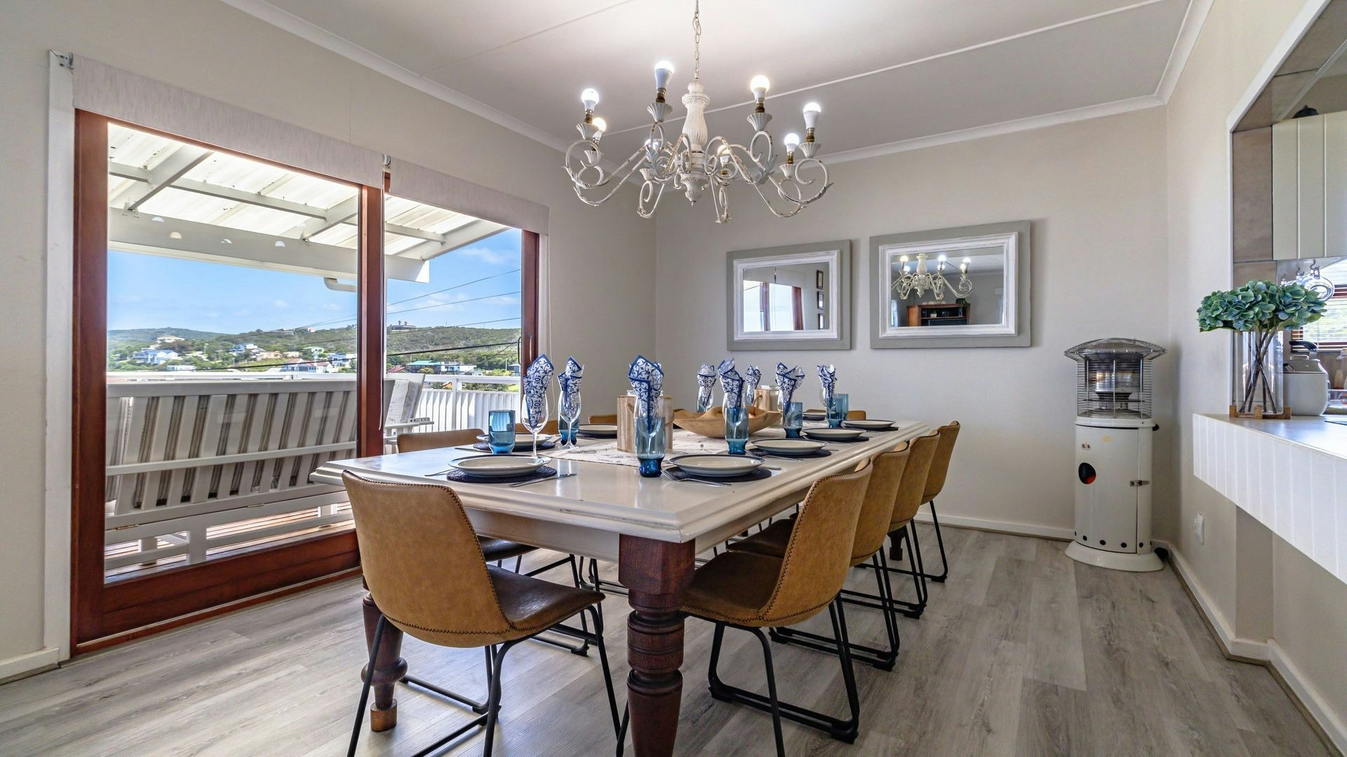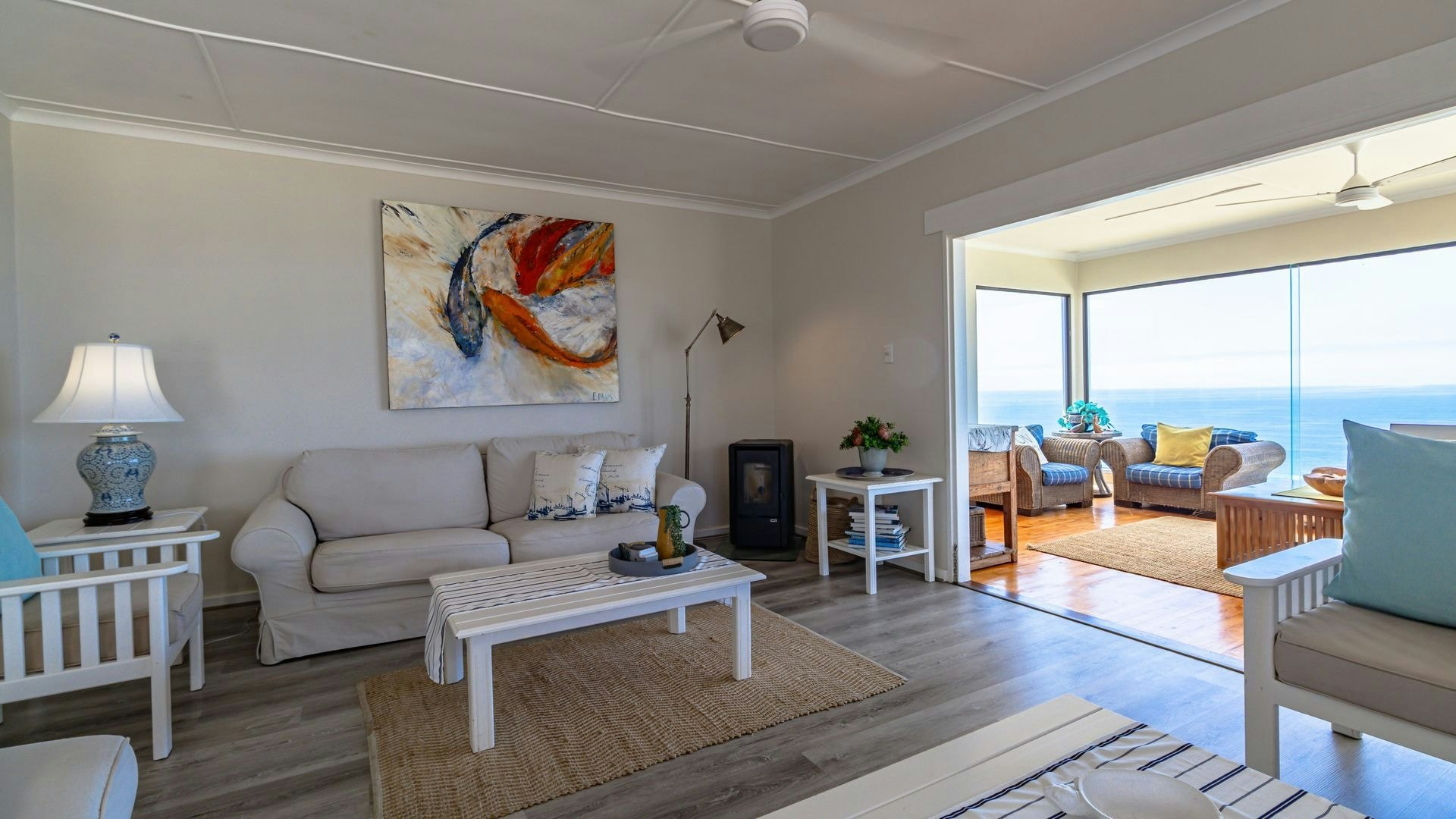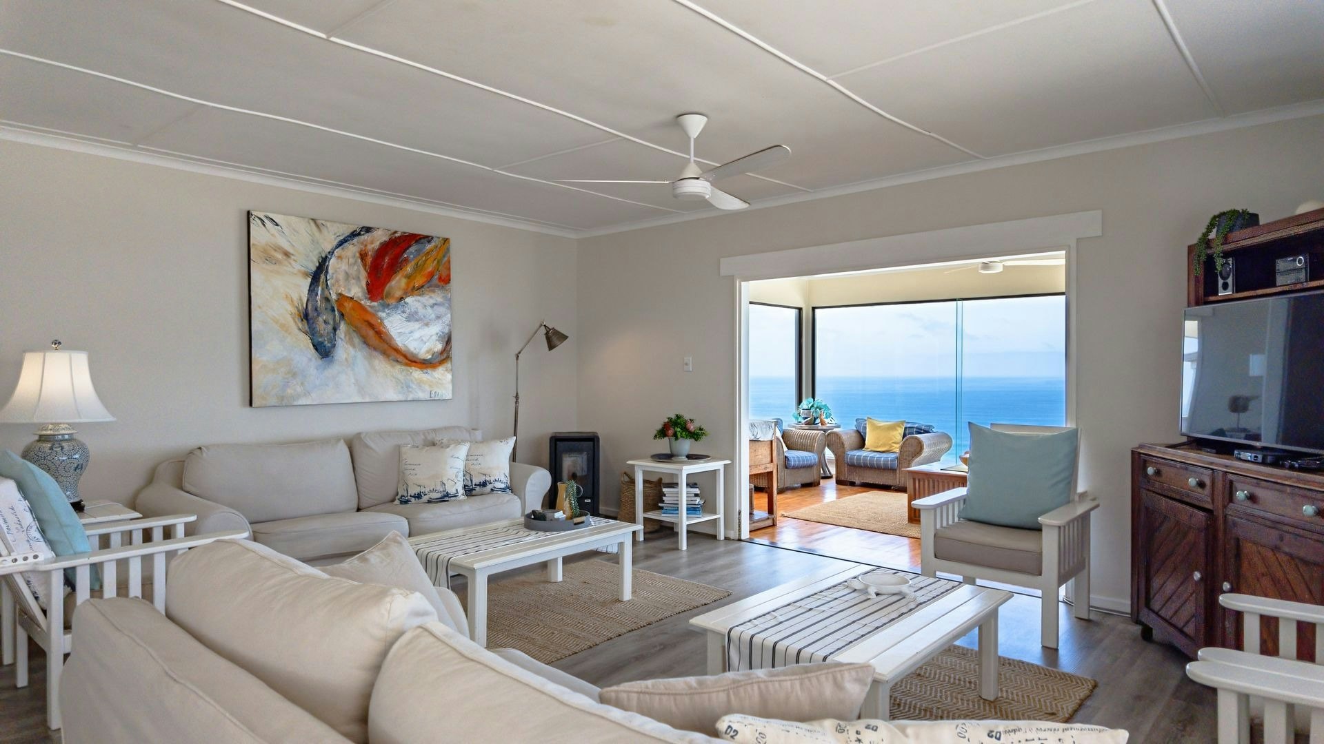 Langs die sitkamer is 'n lieflike sitarea met glasvensters wat 'n goeie opsie is vir 'n oggendkoffie terwyl jy die blou see-uitsigte bewonder. Buite is 'n sonnige patio met braaigeriewe en 'n jacuzzi.
