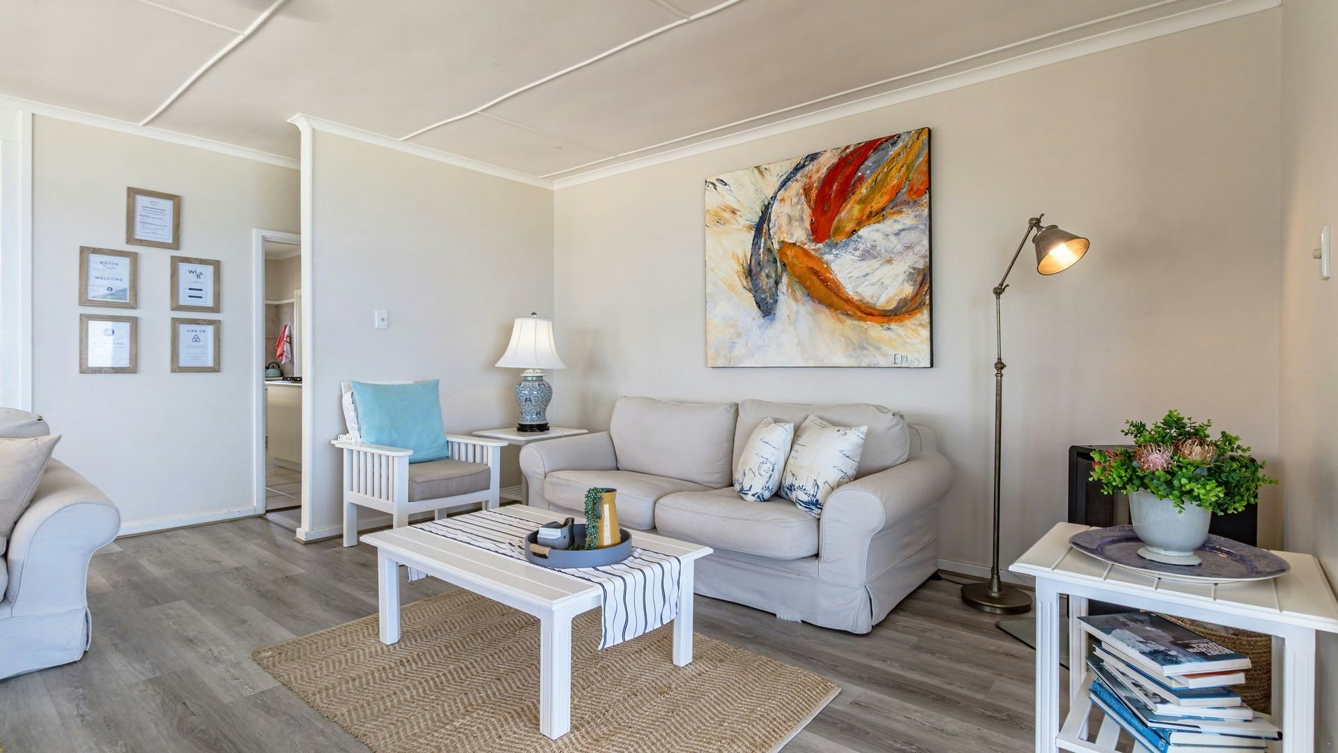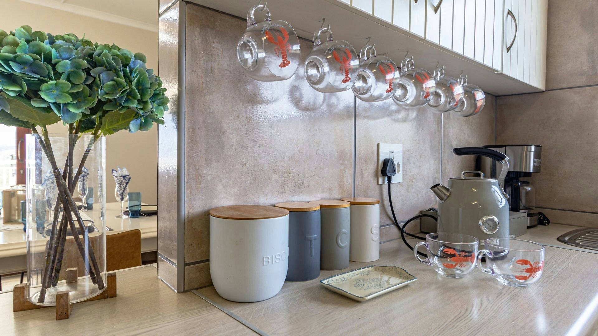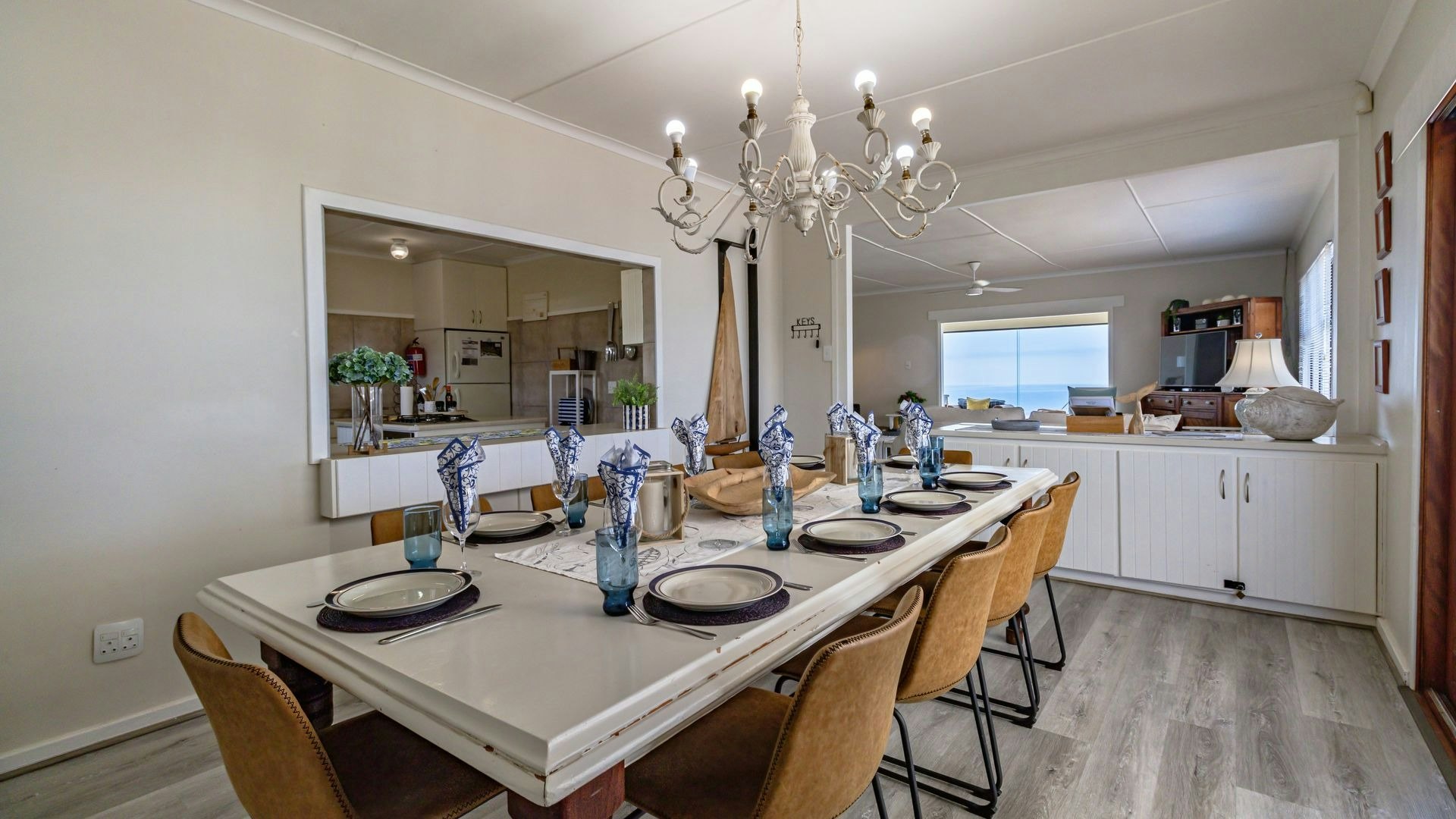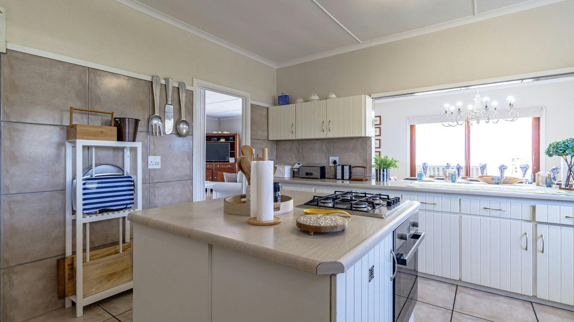 Die oopplan-leefarea beskik oor 'n kombuis wat volledig toegerus is met 'n gasstoof, oond, mikrogolf, yskas-vrieskas, eetgerei en breekware asook tee- en koffiemaakgeriewe. 'n Skottelgoedwasser, wasmasjien en tuimeldroër is ook beskikbaar. Vanuit hierdie kombuis lei 'n etenstafel waar gaste hul maaltye saam kan geniet. Die sitarea het gemaklike sitplek en 'n TV. Toegang tot gratis WiFi is beskikbaar.