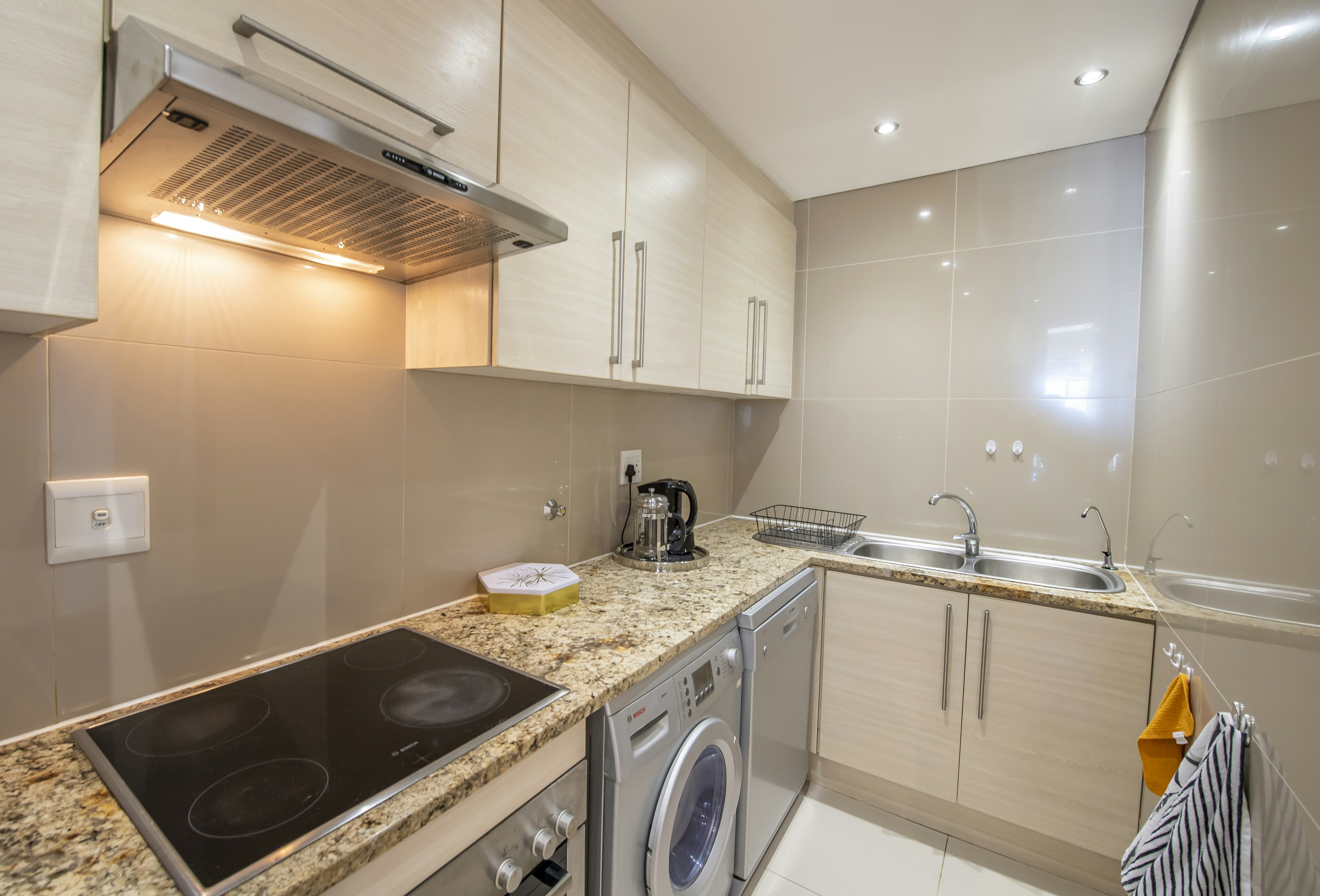 The kitchen is fully equipped with a stove, oven, microwave, fridge-freezer, cutlery and crockery as well as tea- and coffee-making facilities. A washing machine and a dishwasher are available. Leading from the kitchen is a 4-seater dining table and a lounge area with comfortable couches and a Smart flat-screen TV. Access to free Wi-Fi is available.