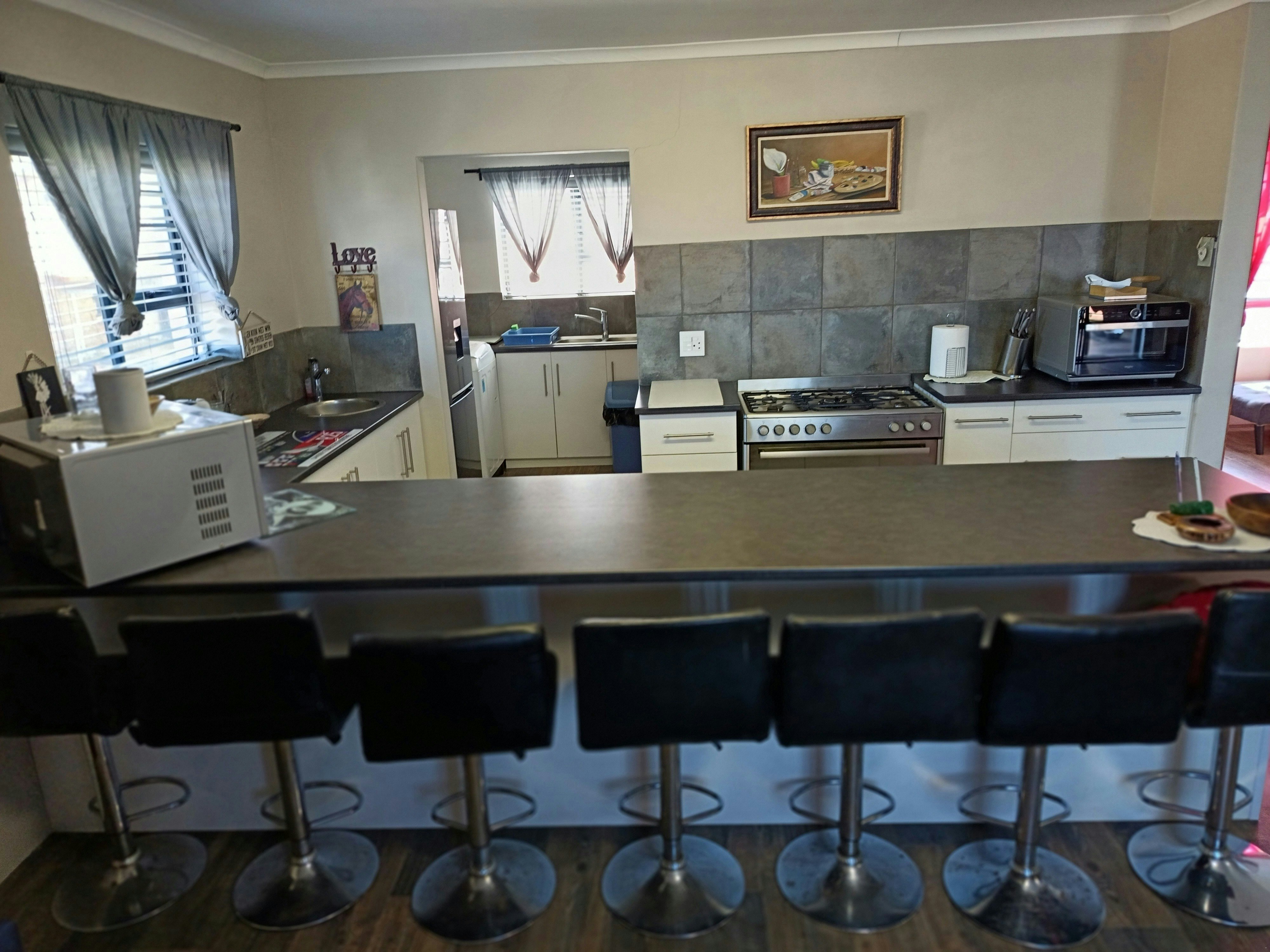Die Hoofhuis het 3 slaapkamers en twee badkamers. Die hoofslaapkamer is gemeubileer met 'n dubbelbed met 'n en suite-badkamer met 'n bad, stort en toilet, terwyl die tweede slaapkamer ook 'n dubbelbed en 'n en suite-badkamer met 'n stort en toilet het. Die derde slaapkamer het 3 enkelbeddens. Die sitkamer bied gemaklike sitplek en 'n TV. Die volledig toegeruste kombuis sluit 'n gasstoof, oond, mikrogolfoond, broodrooster, yskas-vrieskas en tee- en koffiemaakgeriewe in. Beddegoed en badhanddoeke word voorsien.
