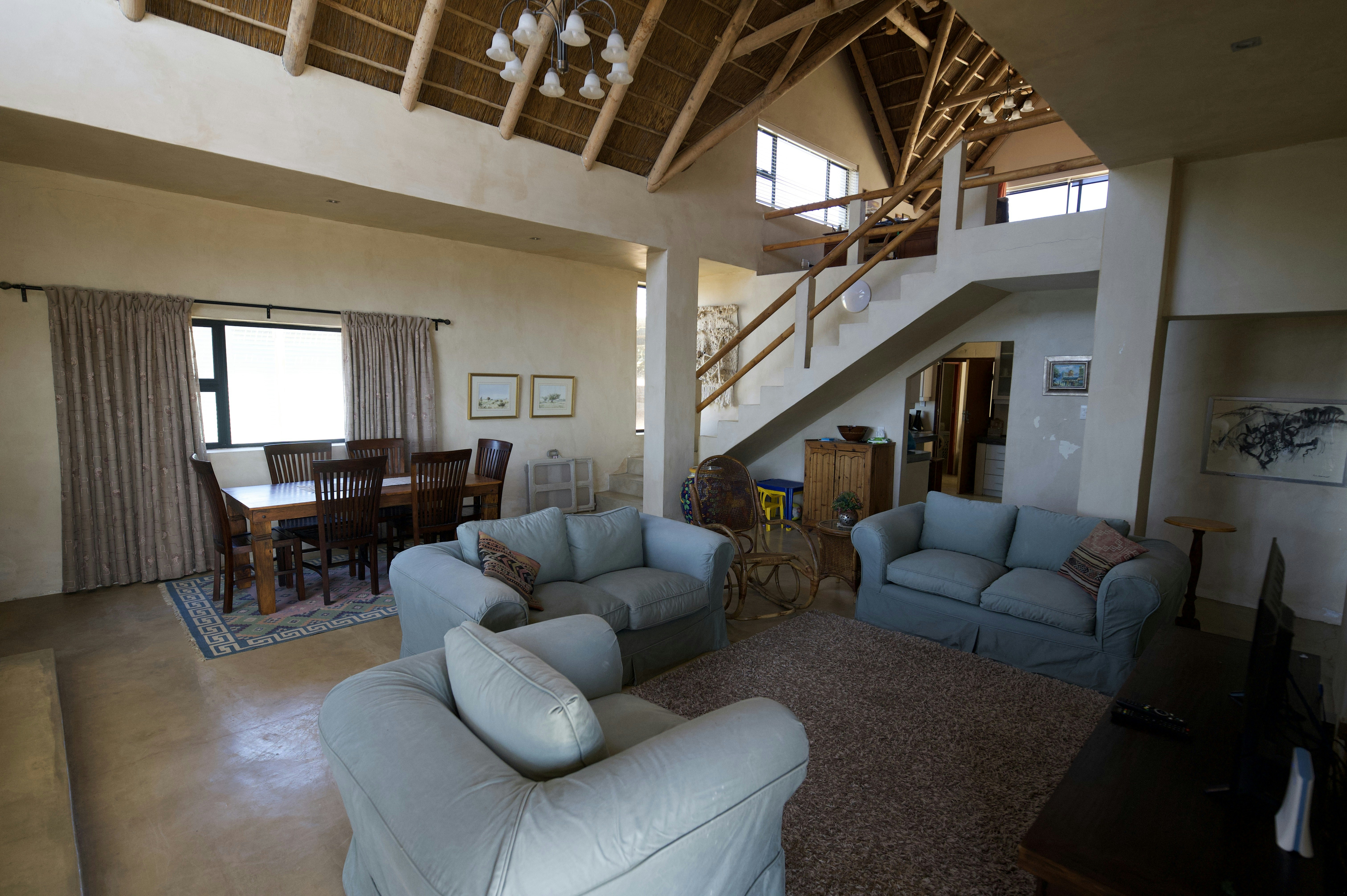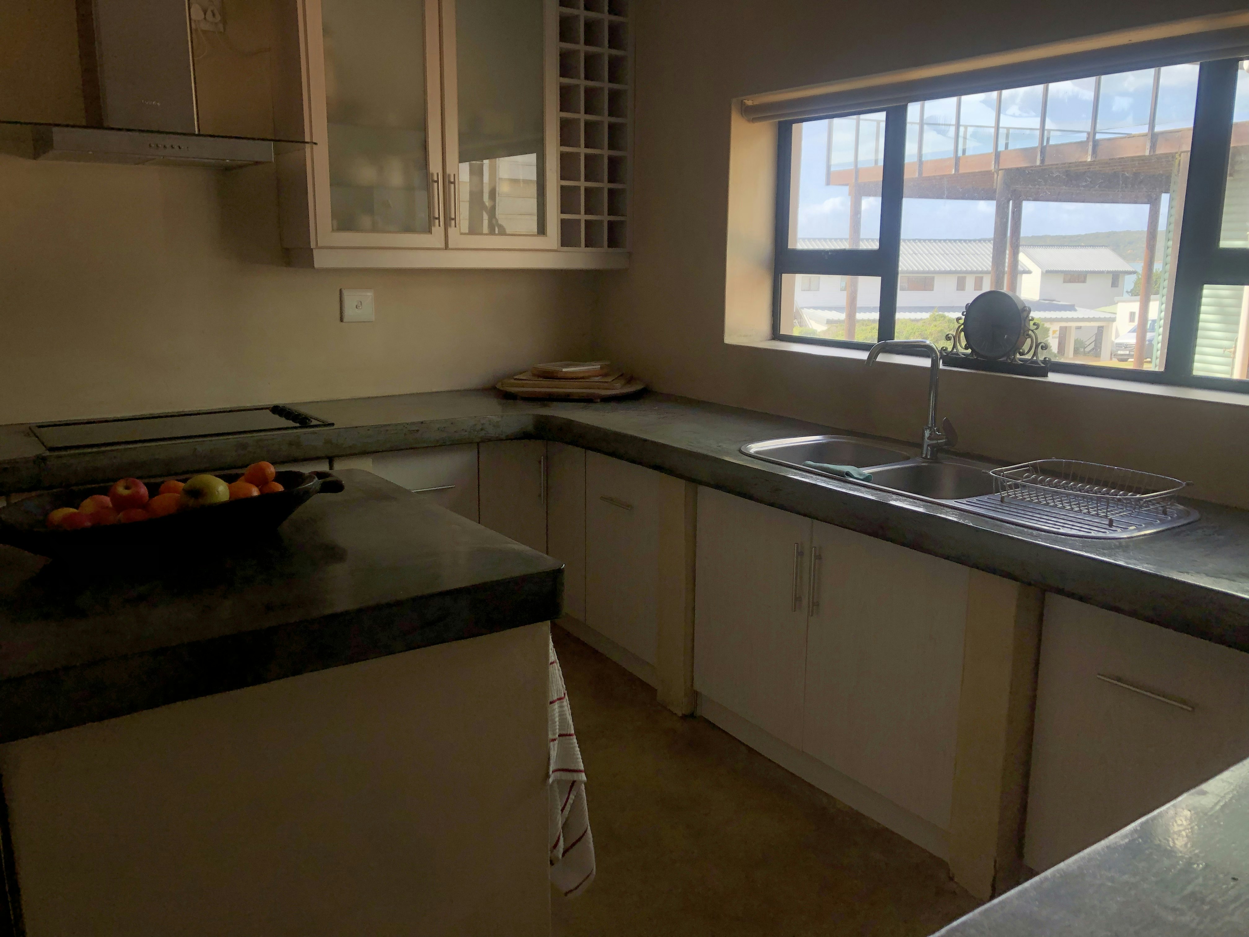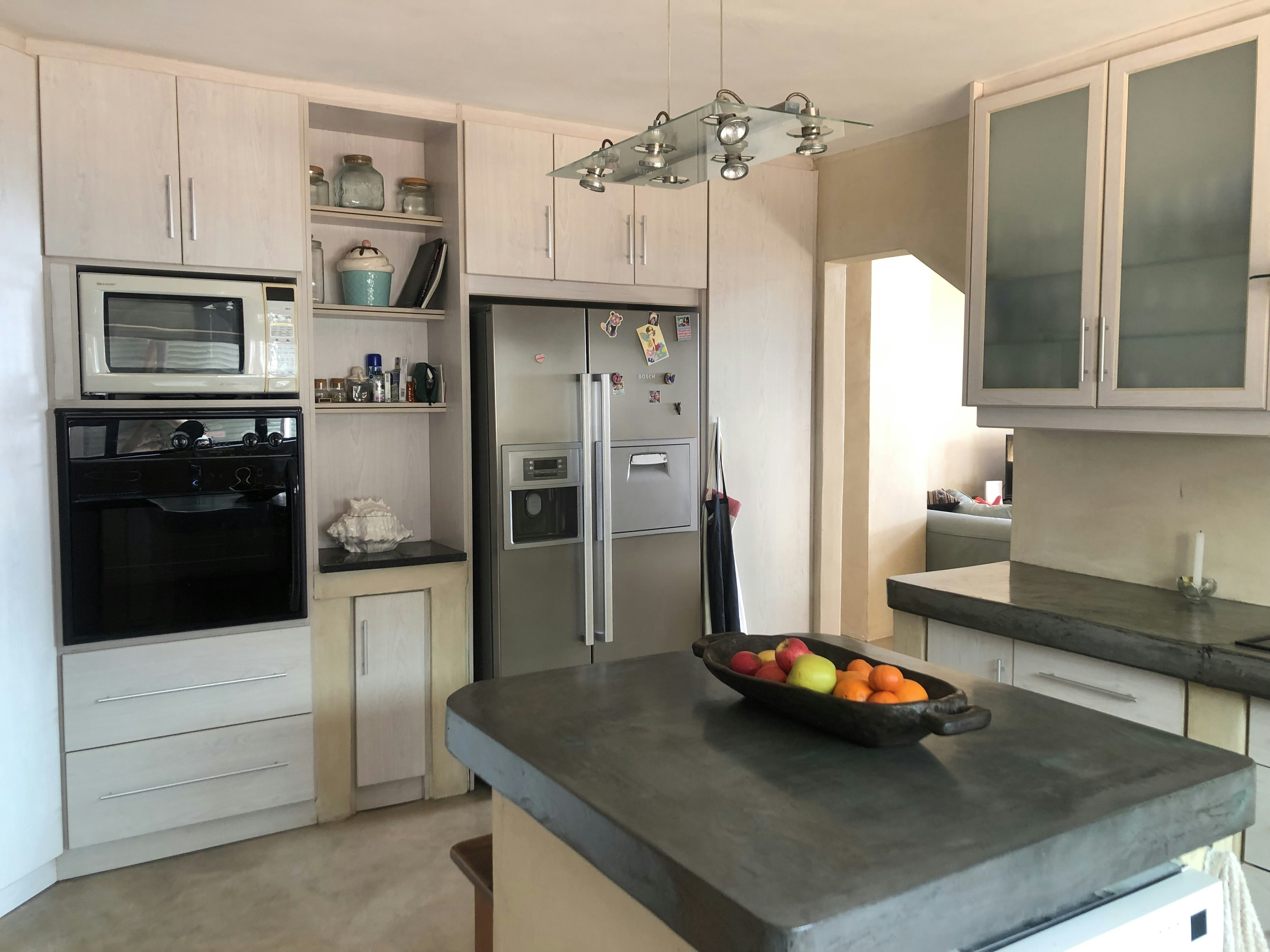 Die moderne oopplan-kombuis is met 'n stoof, 'n oond, 'n mikrogolfoond, 3 yskaste, eetgerei, breekware en tee- en koffiemaakgeriewe toegerus. 'n Wasmasjien en 'n tuimeldroër is ook beskikbaar. Die kombuis lei na 'n leefarea met 'n etenstafel met sitplek vir 6 en gemaklike rusbanke voor 'n platskerm-TV. Die leefarea lei na 'n onderdakstoep met buitemeubels en 'n ingeboude braai.