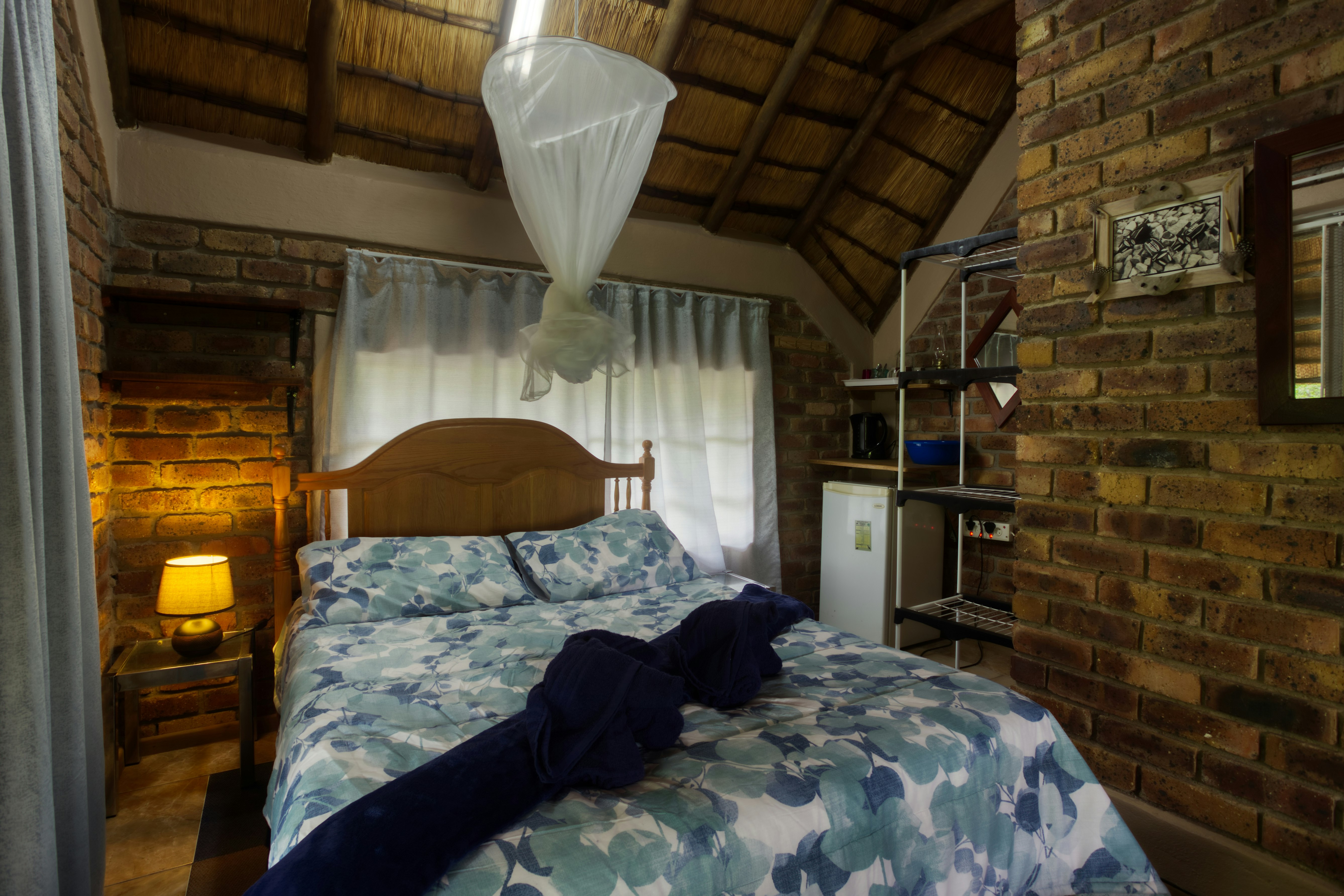 Zebra bied slaapplek aan 2 volwassenes en 2 kinders en beskik oor 'n dubbelbed en 'n stapelbed. Die badkamer het 'n stort, wasbak en 'n toilet. In hierdie chalet is daar 'n ingeboude kombuisie wat toegerus vir selfsorg met 'n yskas, tweeplaatgasstoof, 'n mikrogolfoond, broodrooster, eetgerei, breekware en drankiegeriewe. Daar is lugversorging waarvoor gaste ekstra betaal. Parkeerplek is ongeveer 25 m van die chalet af.