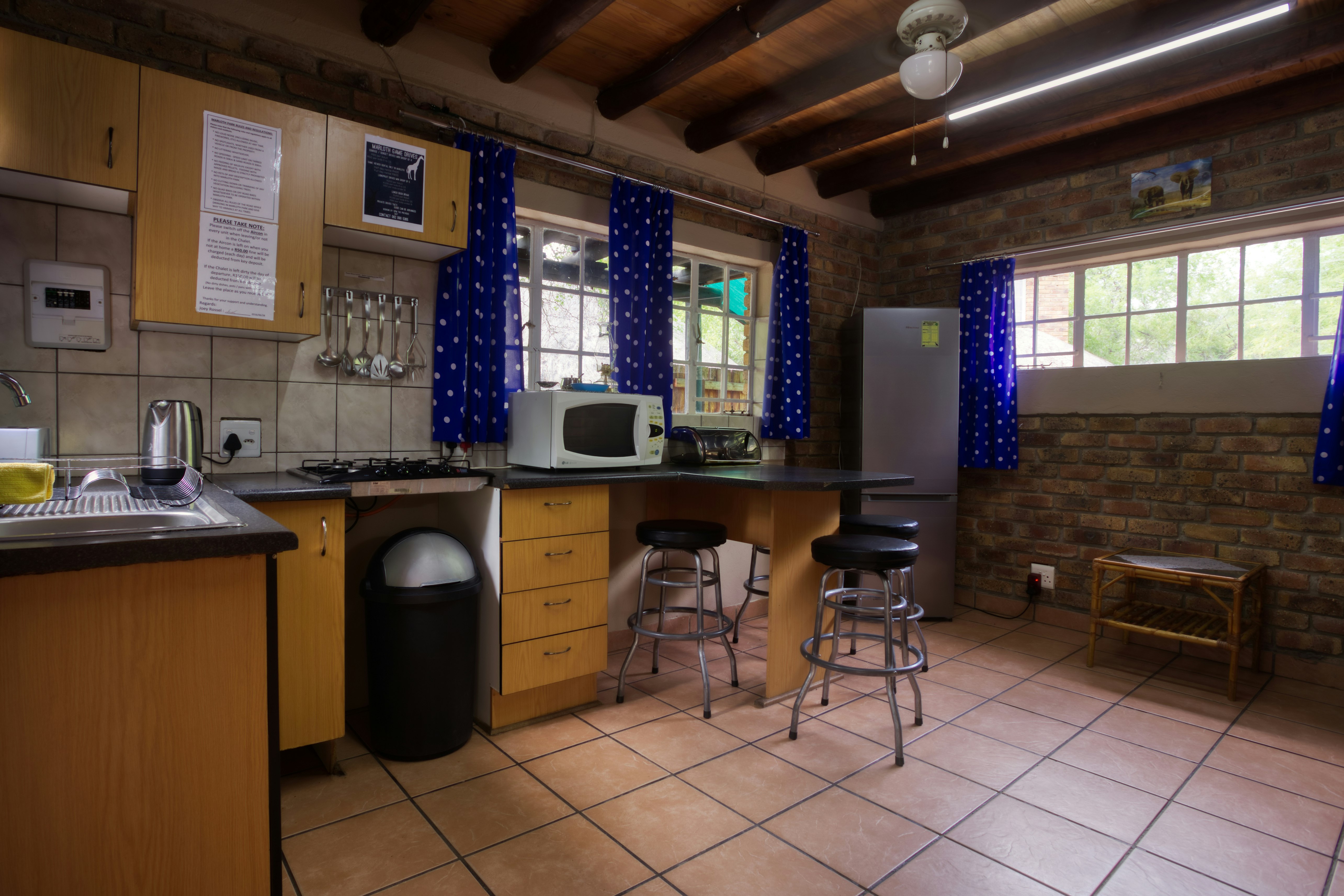 Daar is nie 'n TV, radio of internet in die eenhede nie. Lugversorging word voorafbetaal. Elke chalet het 'n braai-area en 'n plonspoel. Die plonspoel is net vol wanneer daar nie waterbeperkings in Marlothpark is nie.
