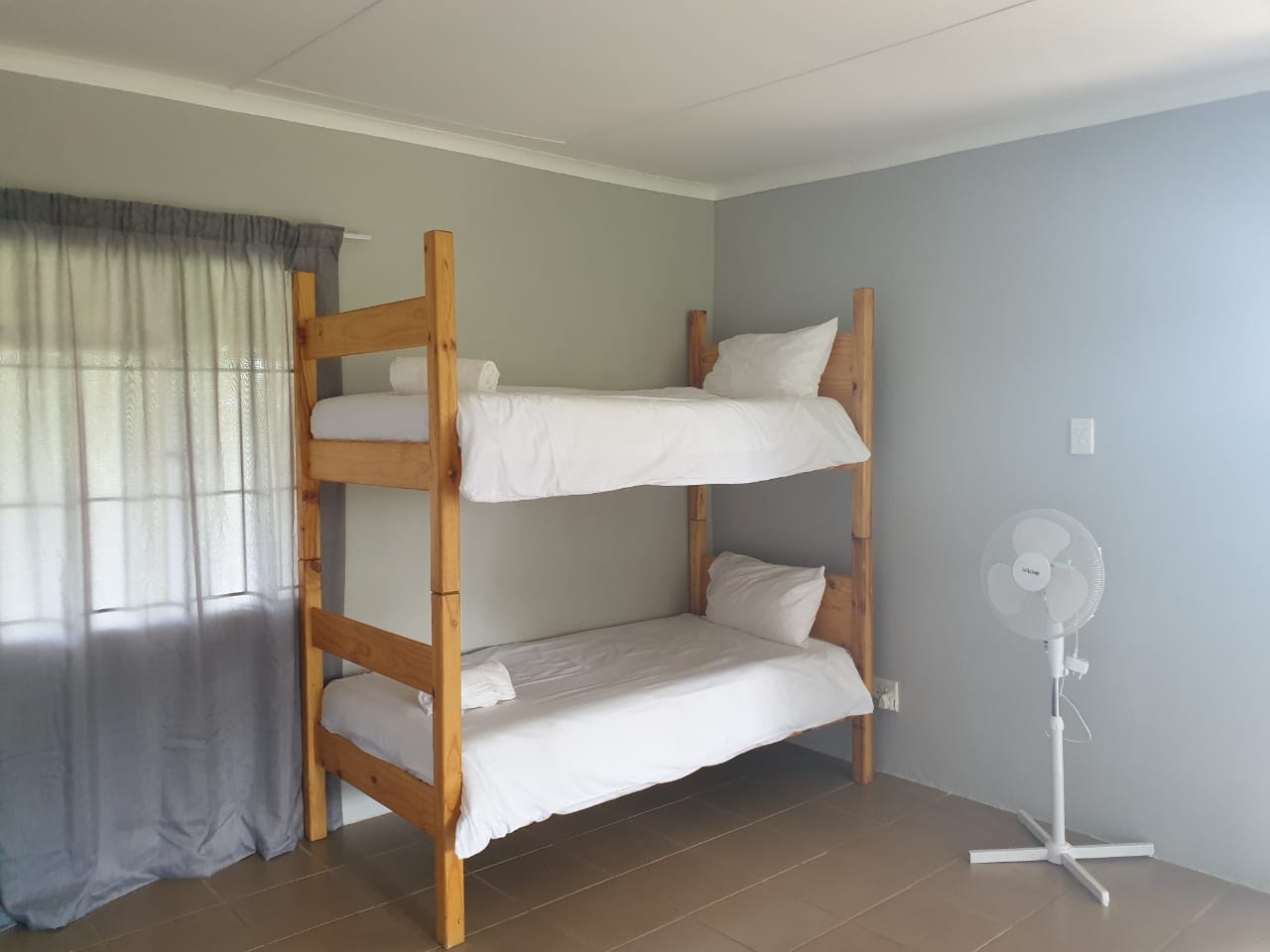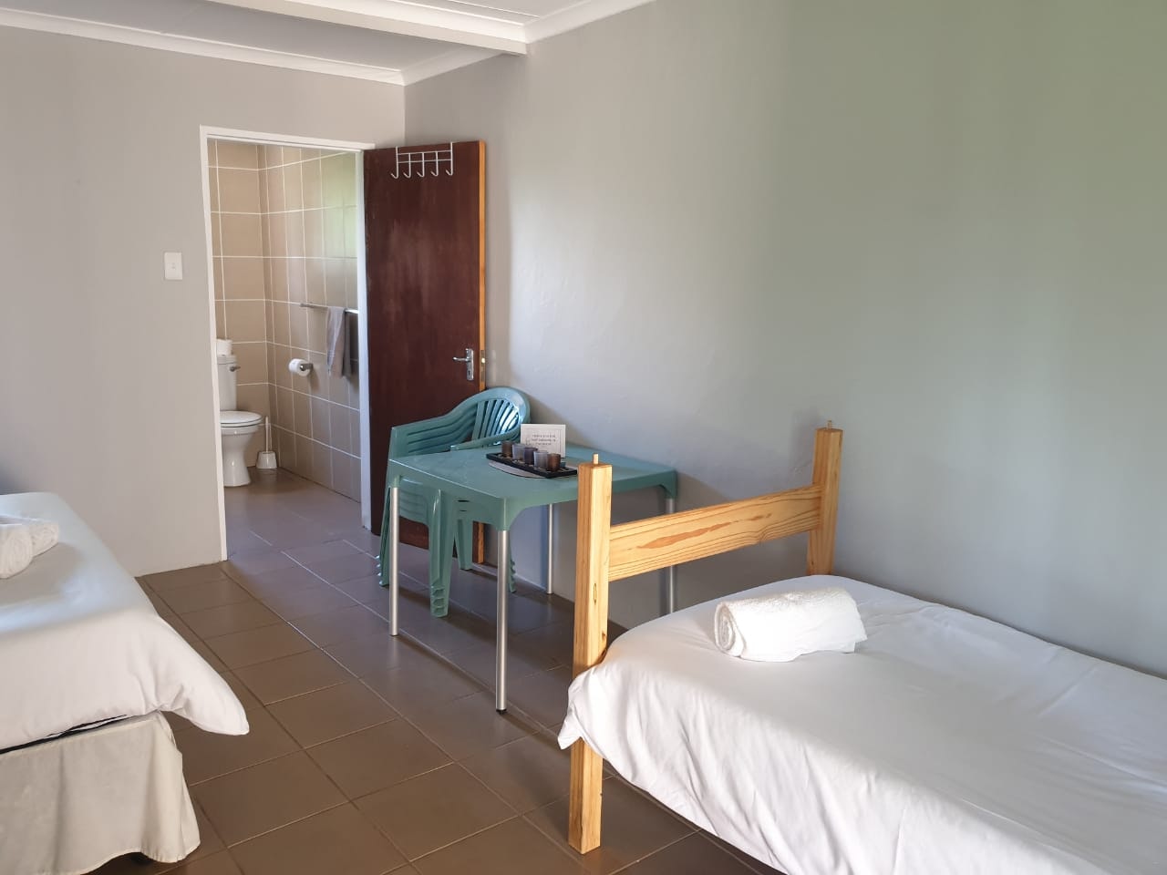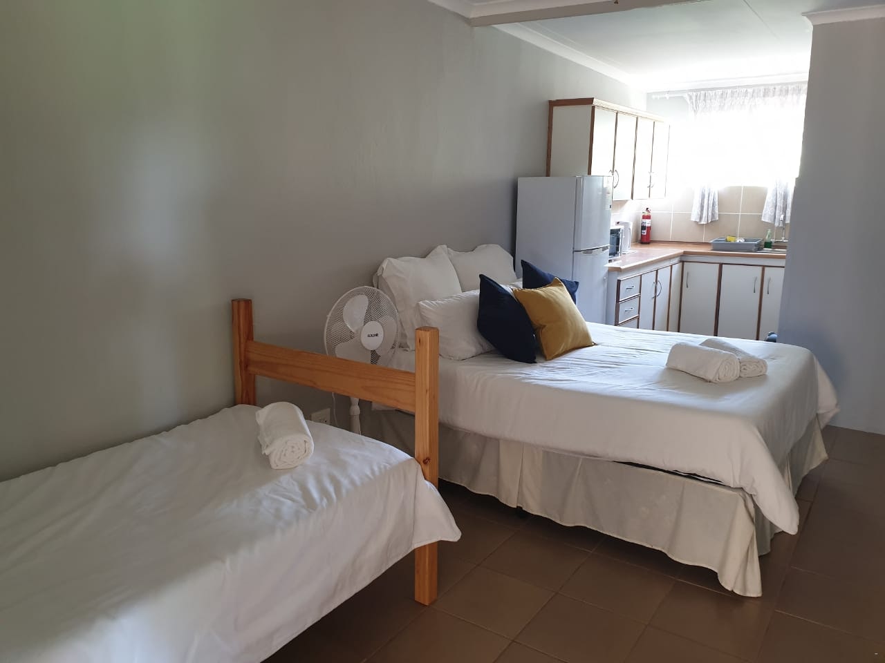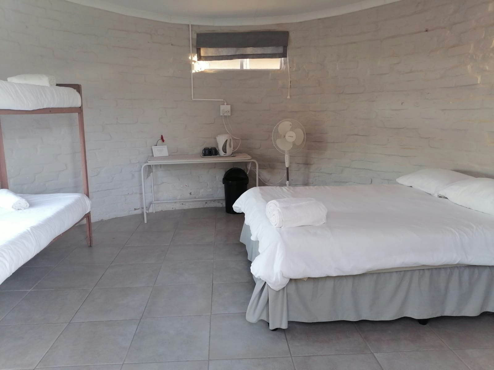 Accommodation is provided in self-catering rooms, standard rooms, free-standing rondavels, and camping. The self-catering rooms are well-equipped and each contain a microwave, a fridge, kettle and crockery. The standard rooms are very basic, and each contain a double bed or single beds, an en-suite bathroom with shower and a bar fridge. The free-standing rondavels contain bunk beds, and make use of communal ablution and kitchen facilities.